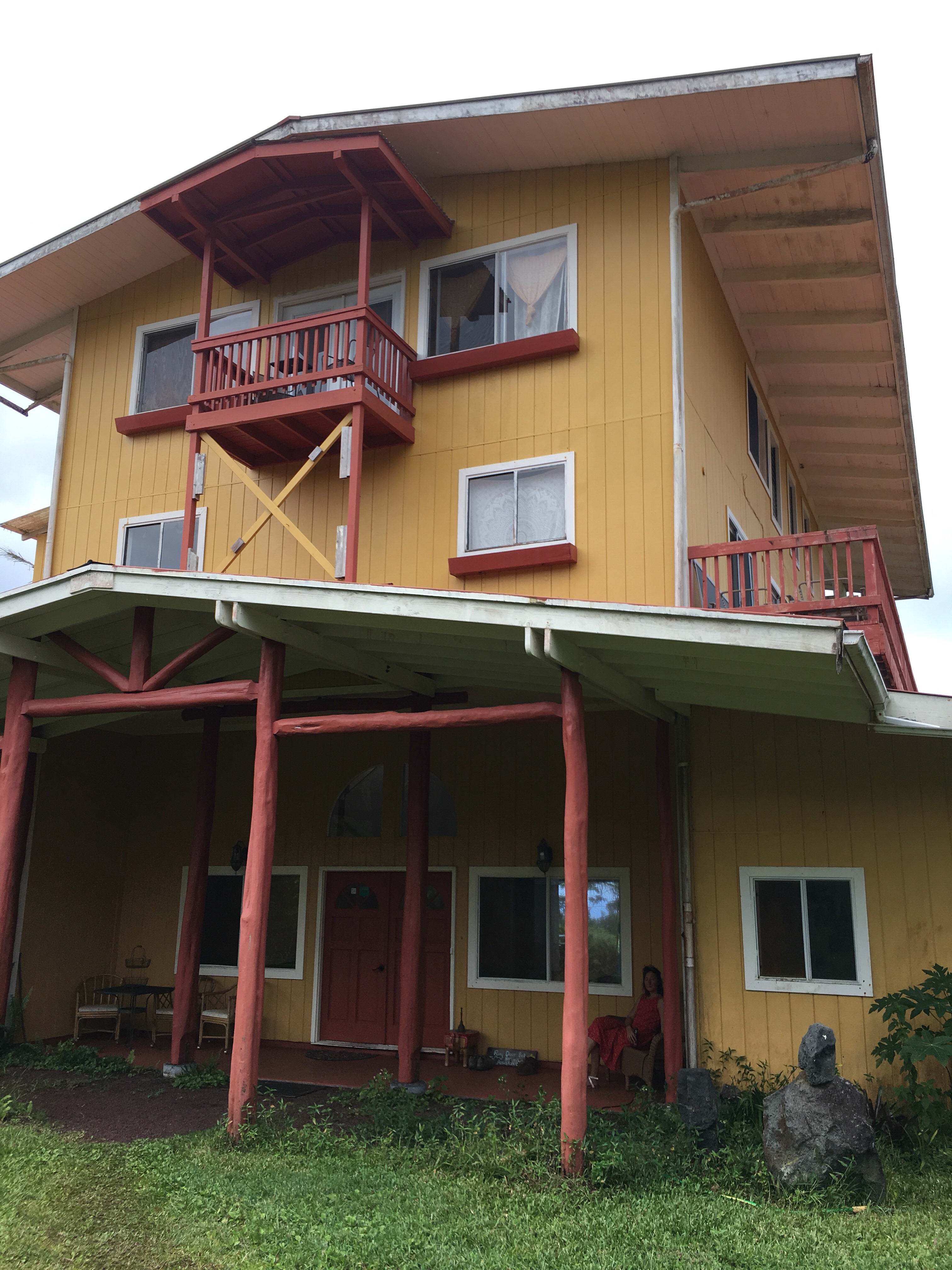 Es hatte seine besten Tage hinter sich, so sieht es aus. Aber es hat einen magischen Charme. Natur, Ausblick, der verwunschene Garten, die aus Lavafelsen gebauten zwei Saunas, die Löcher aus denen kontinuierlich Damf aufsteigt. Blick auf das Meer, ein feuchtes Klima mit tagelang Regen. Ständige Erdbeben. Die freundlichen „Herbergseltern“ Marc und Ishika, die aber zugleich etwas abwesend erscheinen. Fühlen sie sich hier Zuhause? Dann kommt die Sonne heraus, und der Vulkan bricht nebenan aus und es gibt schwere Erdbeben.