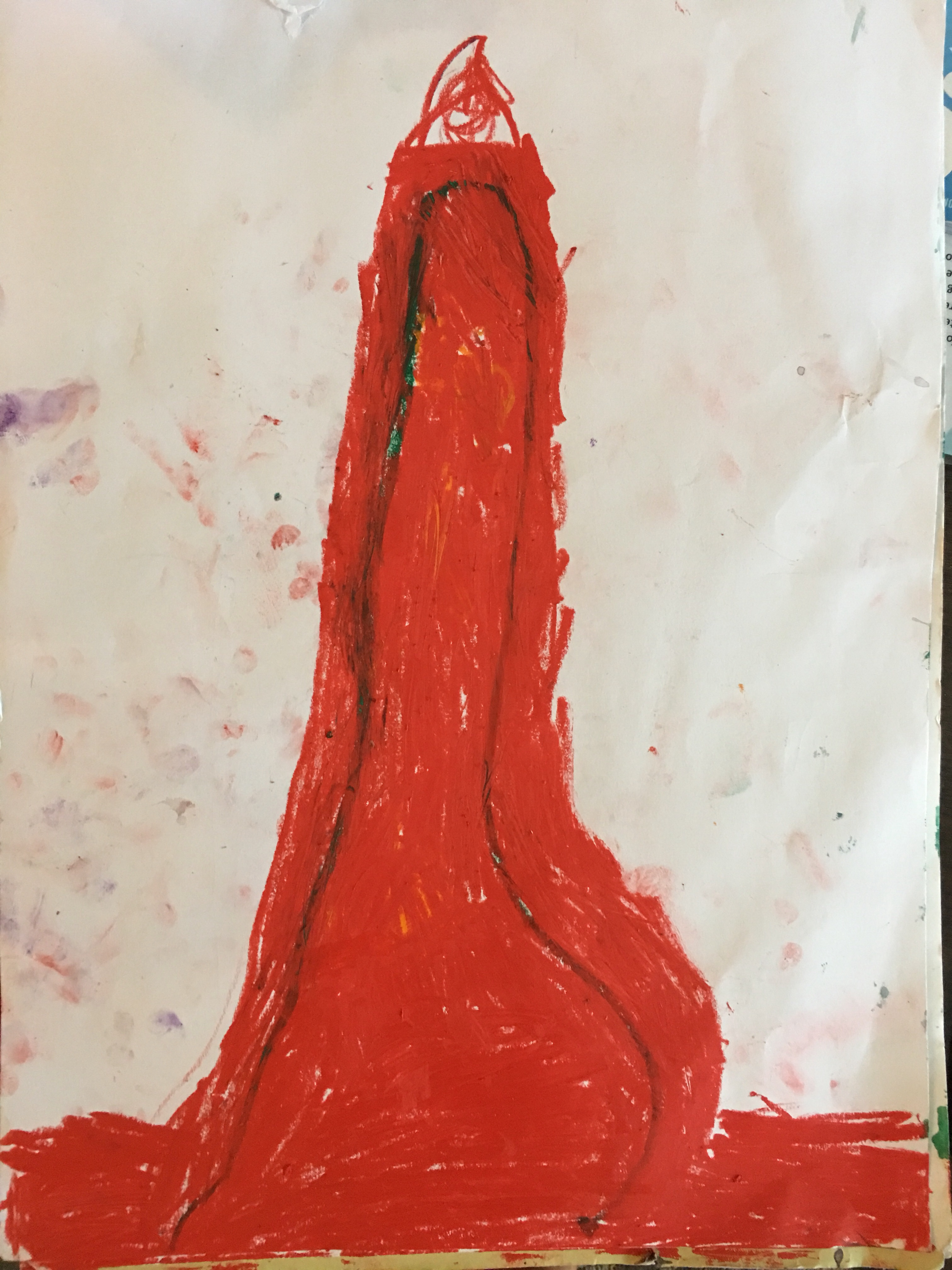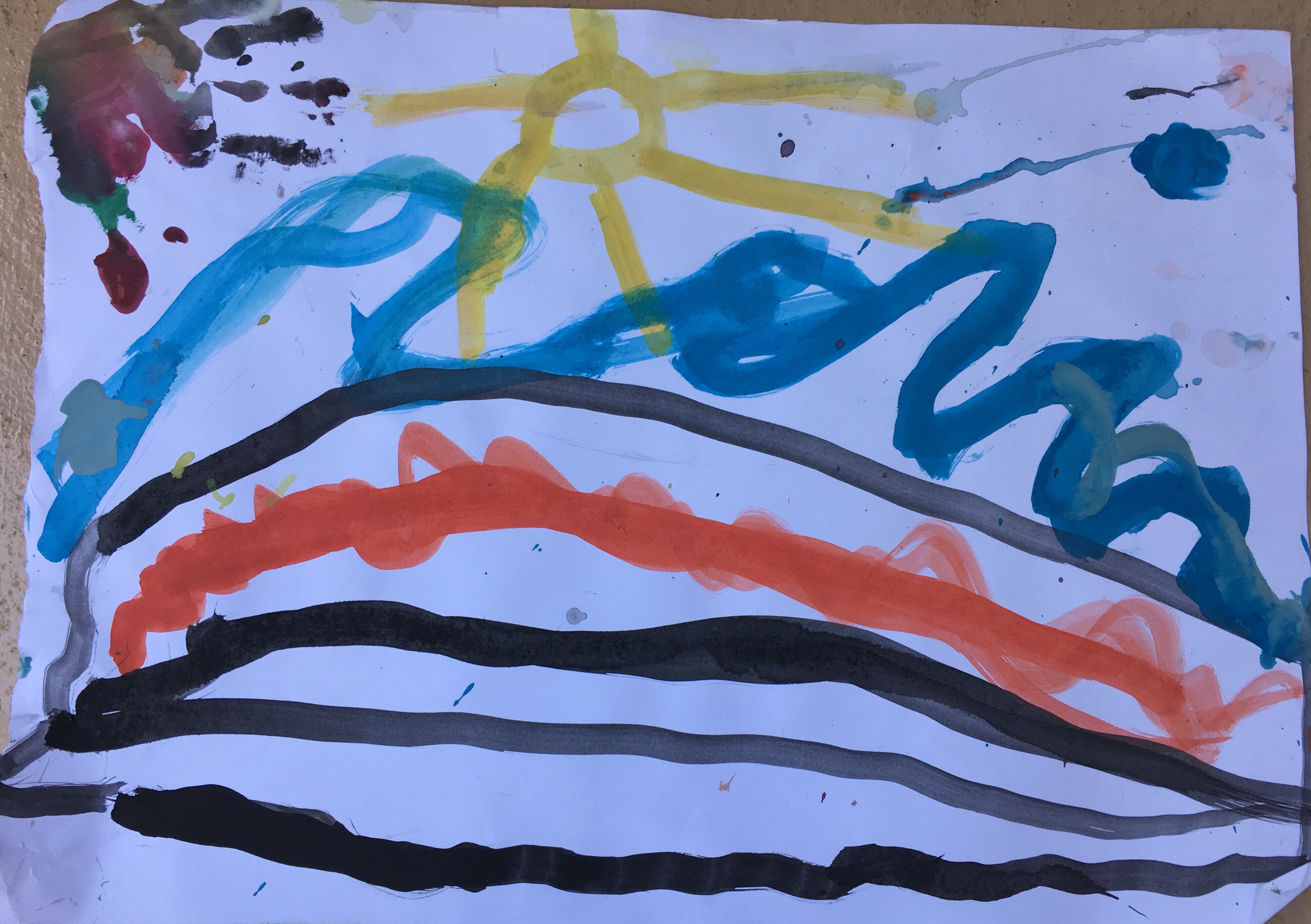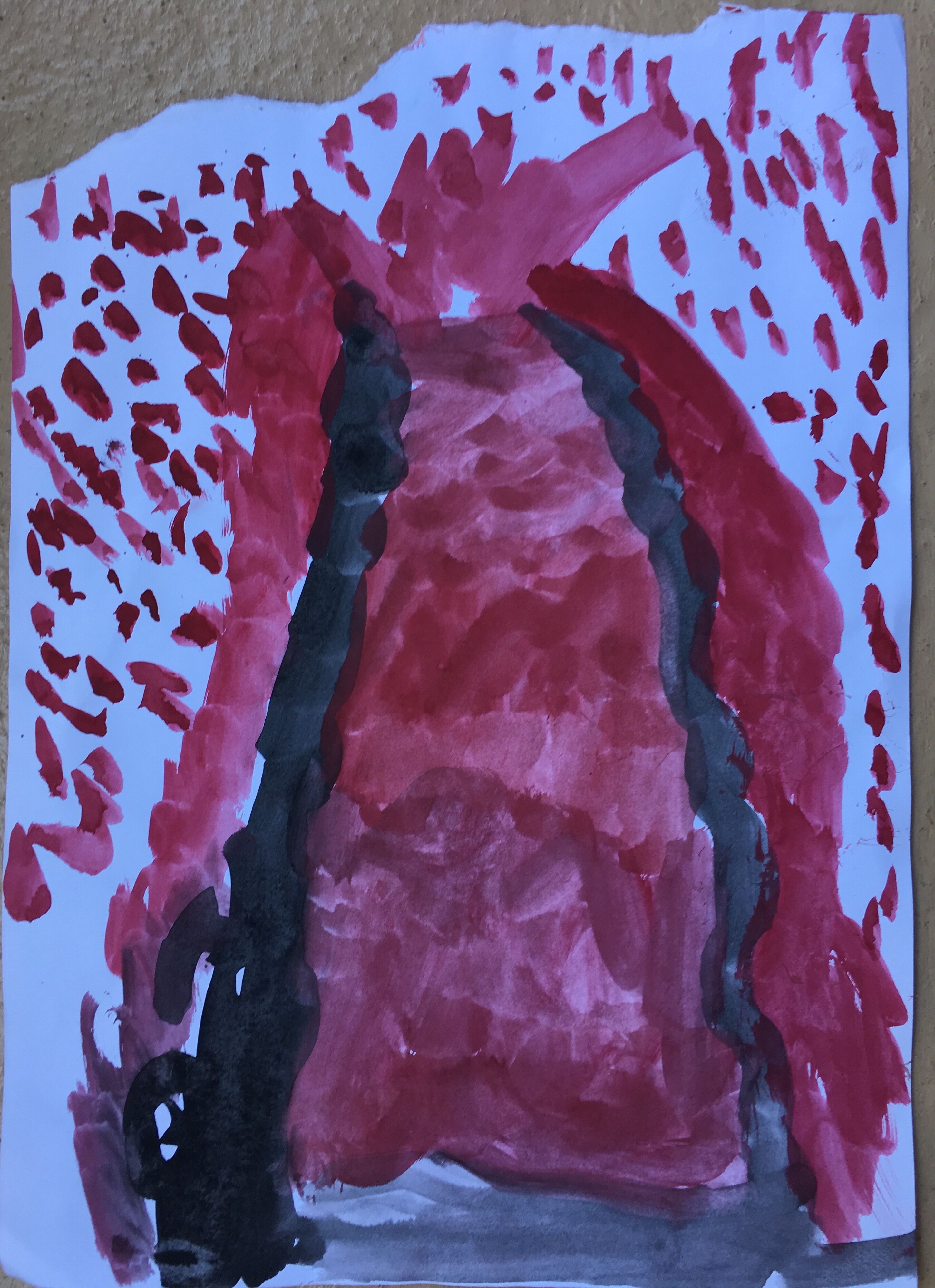 Und die Kinder malten weiter Vulkanbilder. hier das von Tara: man sieht deutlich, sie versteht dass die Lava unter der schwarzen Oberfläche fließt.