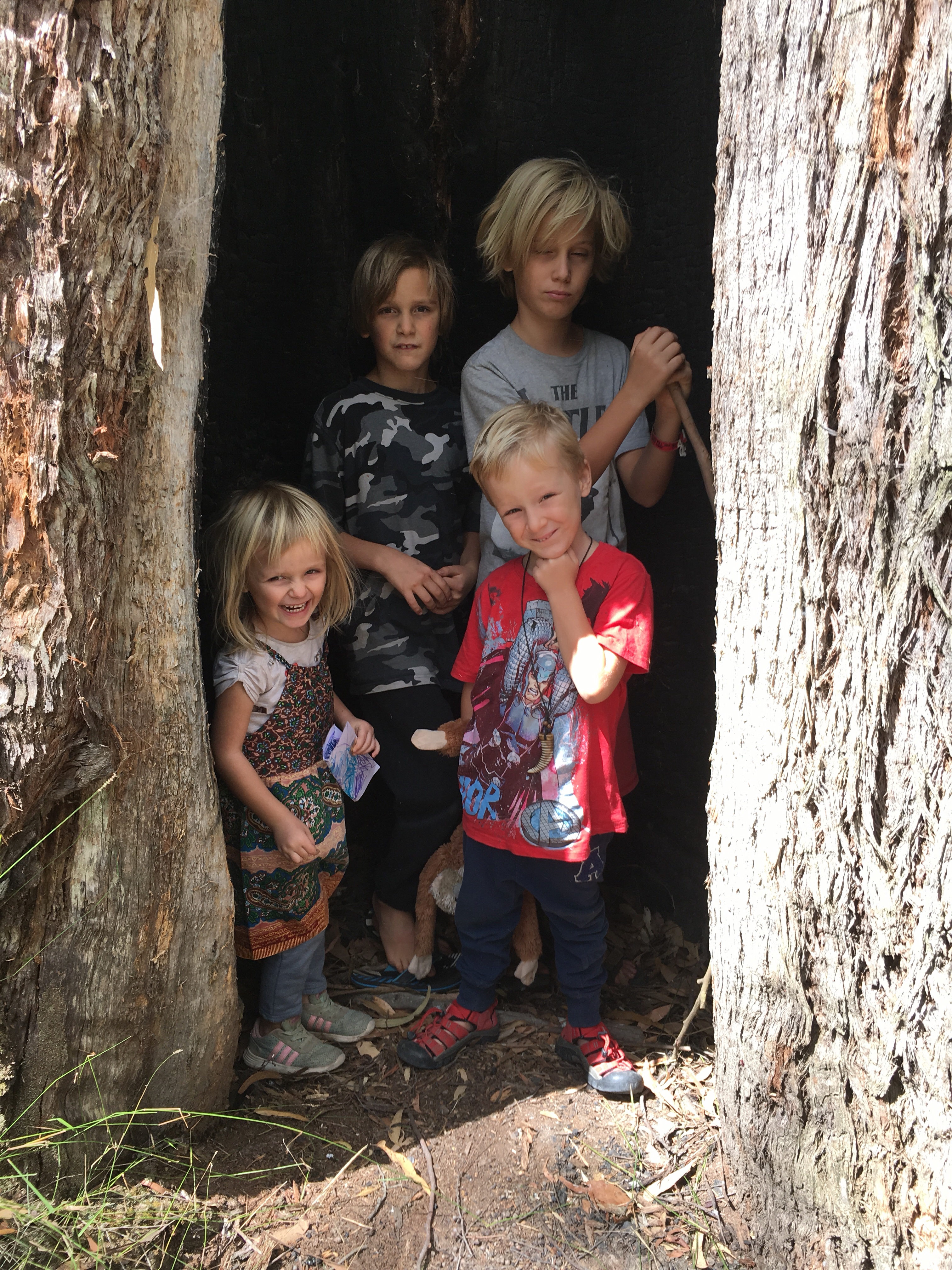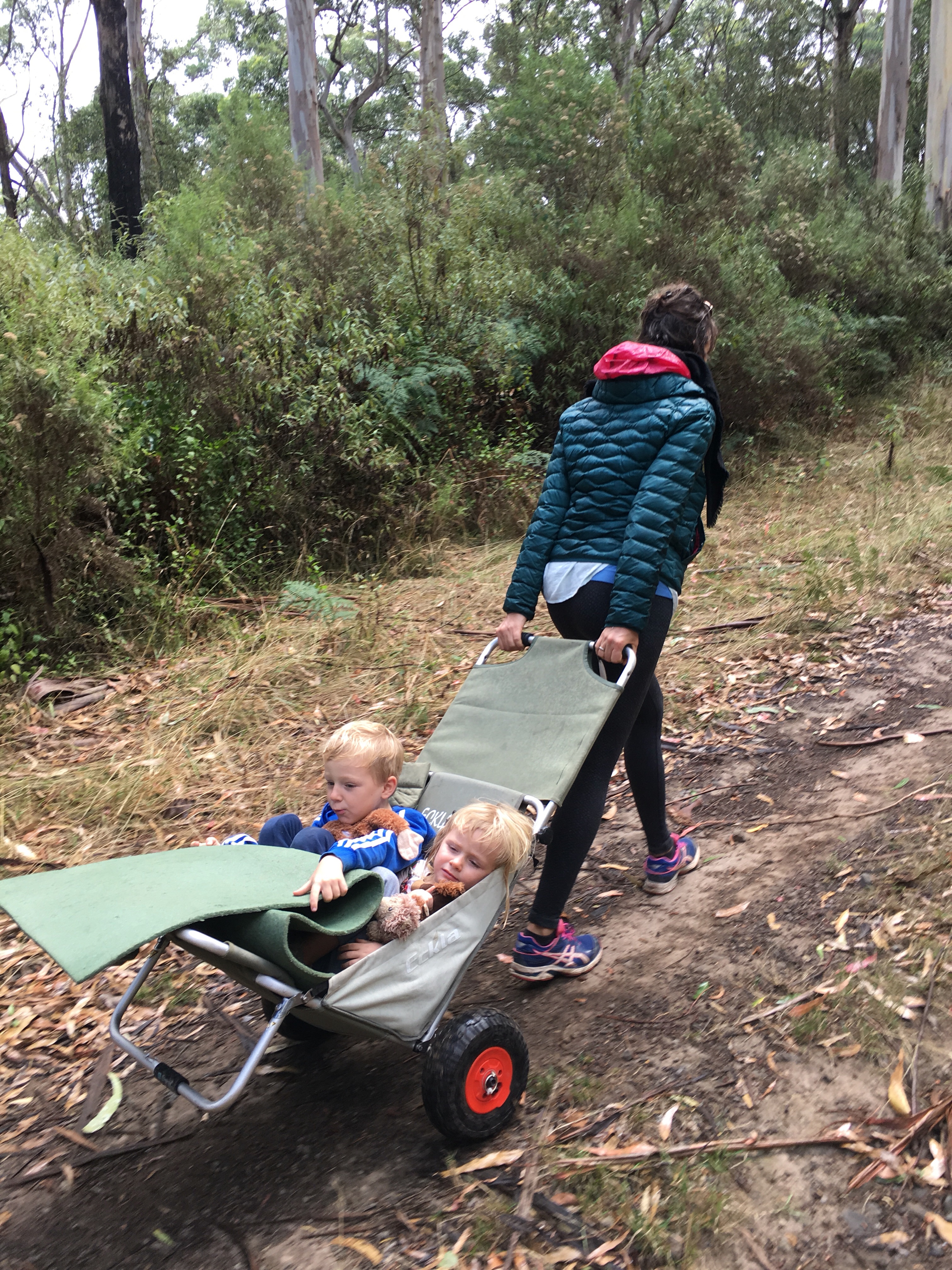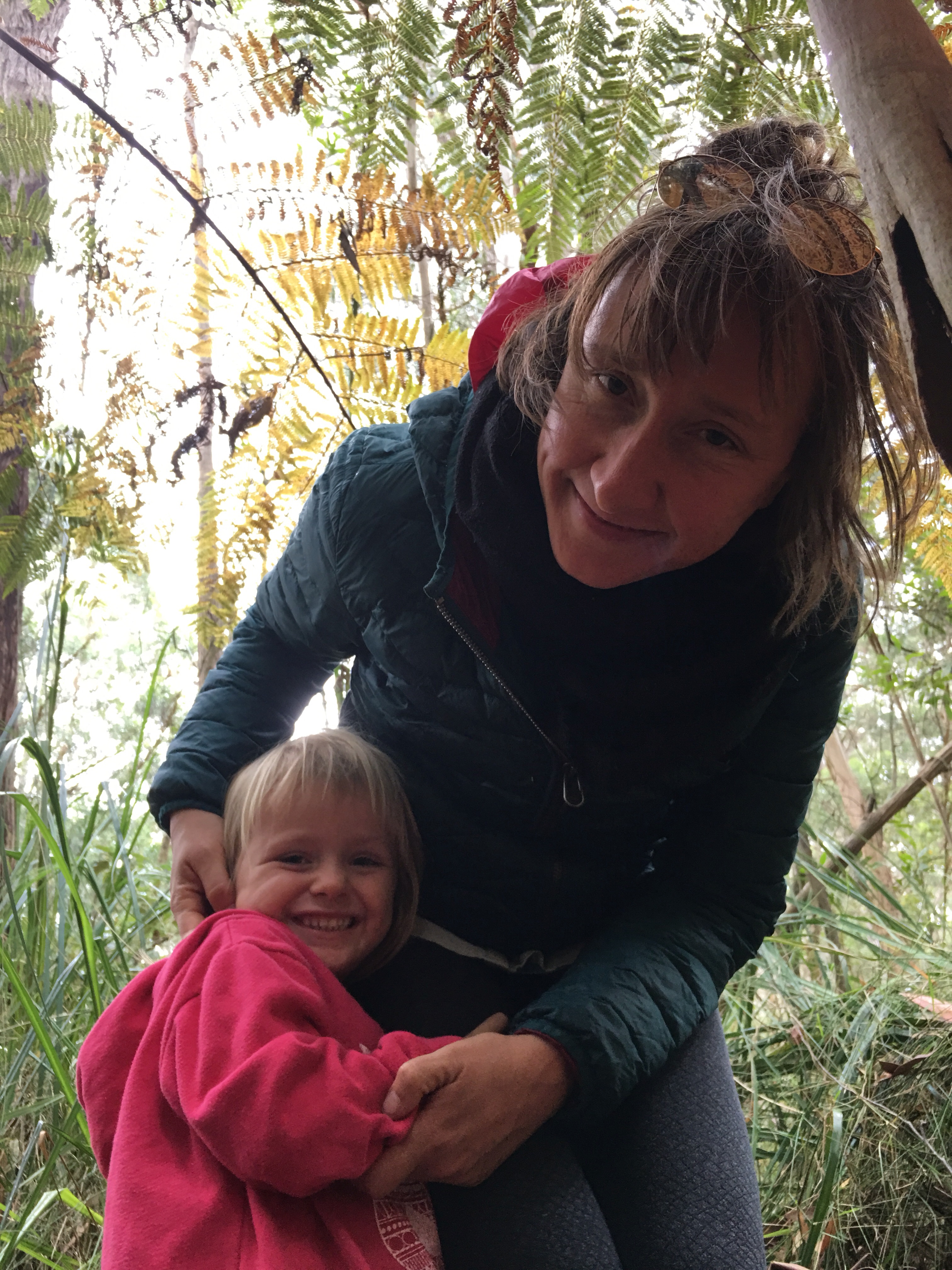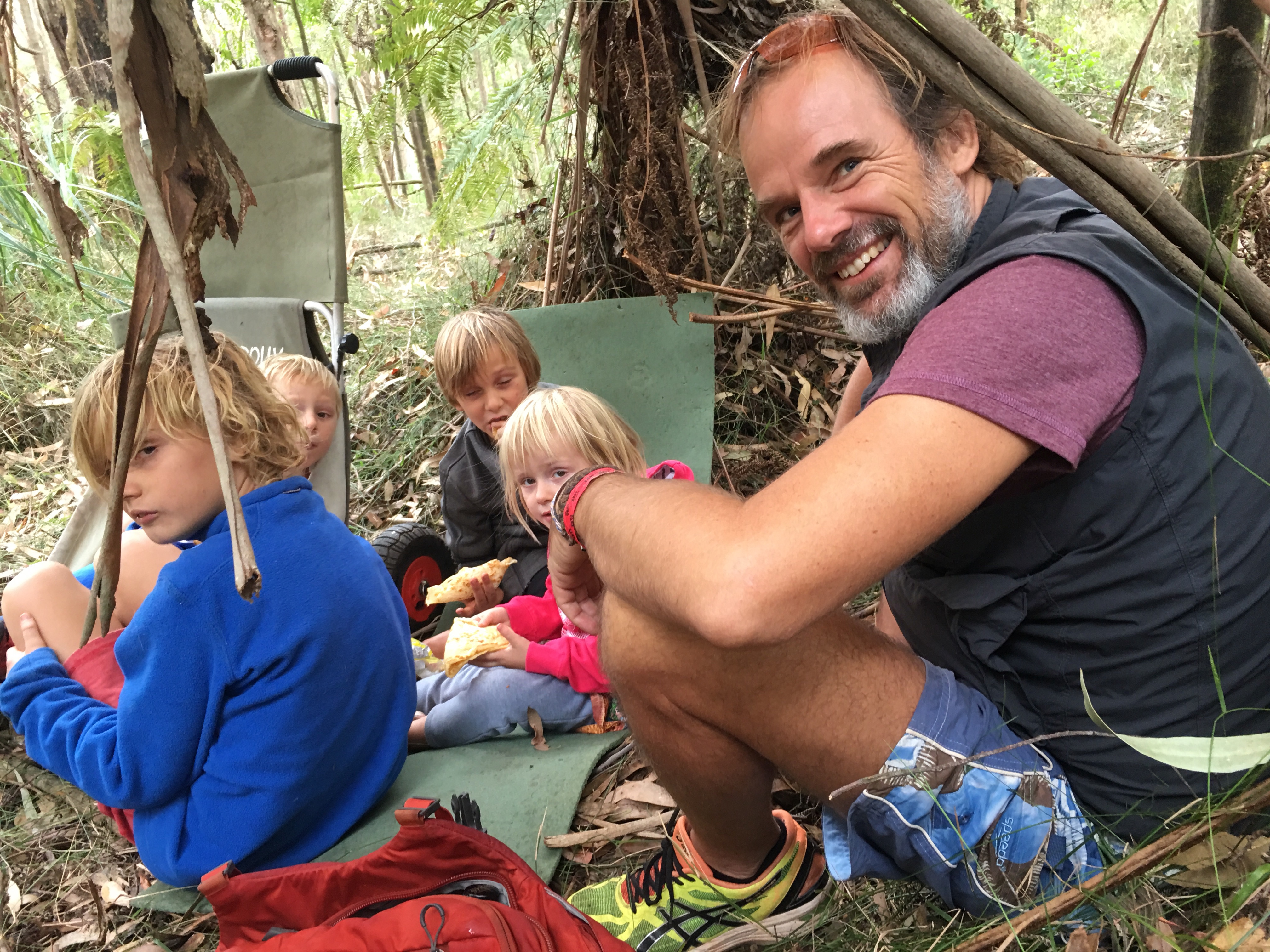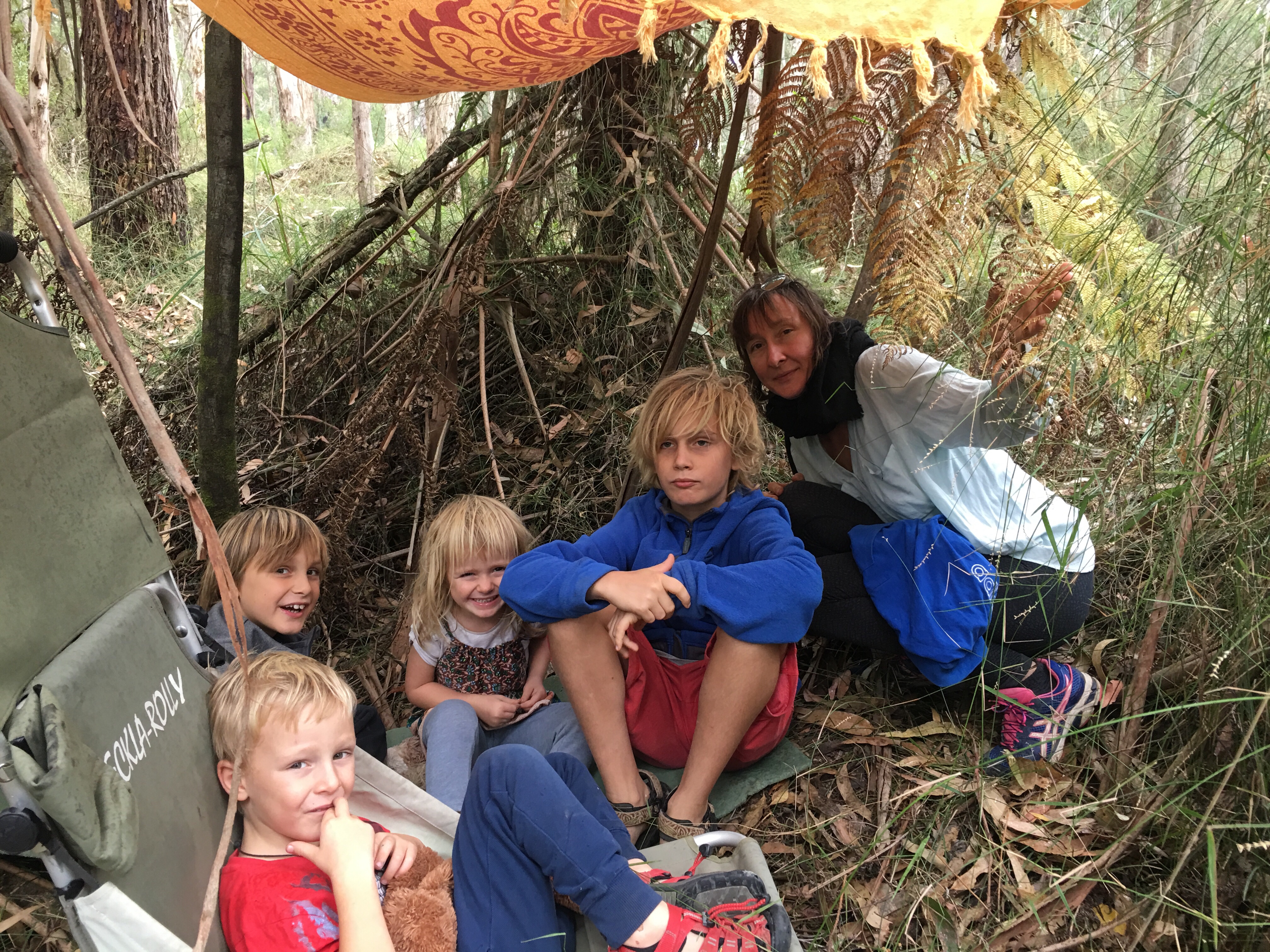 Gestern beschlossen wir eine zweite Nacht in unserem Camp zu bleiben, und ich erkundete morgens beim Joggen die Gegend. Der Waldweg zog sich weit bergauf und bergab durch den Eukalyptuswald mit seinen riesigen Bäumen. Darunter meterhohe Farne, eine ganz andere Landschaft als ich sie kenne. Und so machten wir uns nach dem Frühstück los auf eine Wanderung. Endlich kam auch mal wieder der Beach-trolley zum Einsatz, und er bewährte sich sehr. Es wehte immer wieder ein starker Wind und wir stellten uns bei den kurzen Schauern in einem hohlen Baumstamm unter. Und schlugen einen Lagerplatz in den Farnen auf. Abends lernten wir zwei sehr nette Hamburger Weltreisefamilien kennen, mit gemeinsam auch vier blonden Kindern. Spannend zu hören, wie die ihr Jahr gestaltet hatten, und abends am Lagerfeuer in großer Runde erfuhren wir spannende Erlebnisse aus Iran, Aserbaidschan, Australien und vielen anderen Ländern. Und die Kinder freuten sich sehr über Spielkameraden.