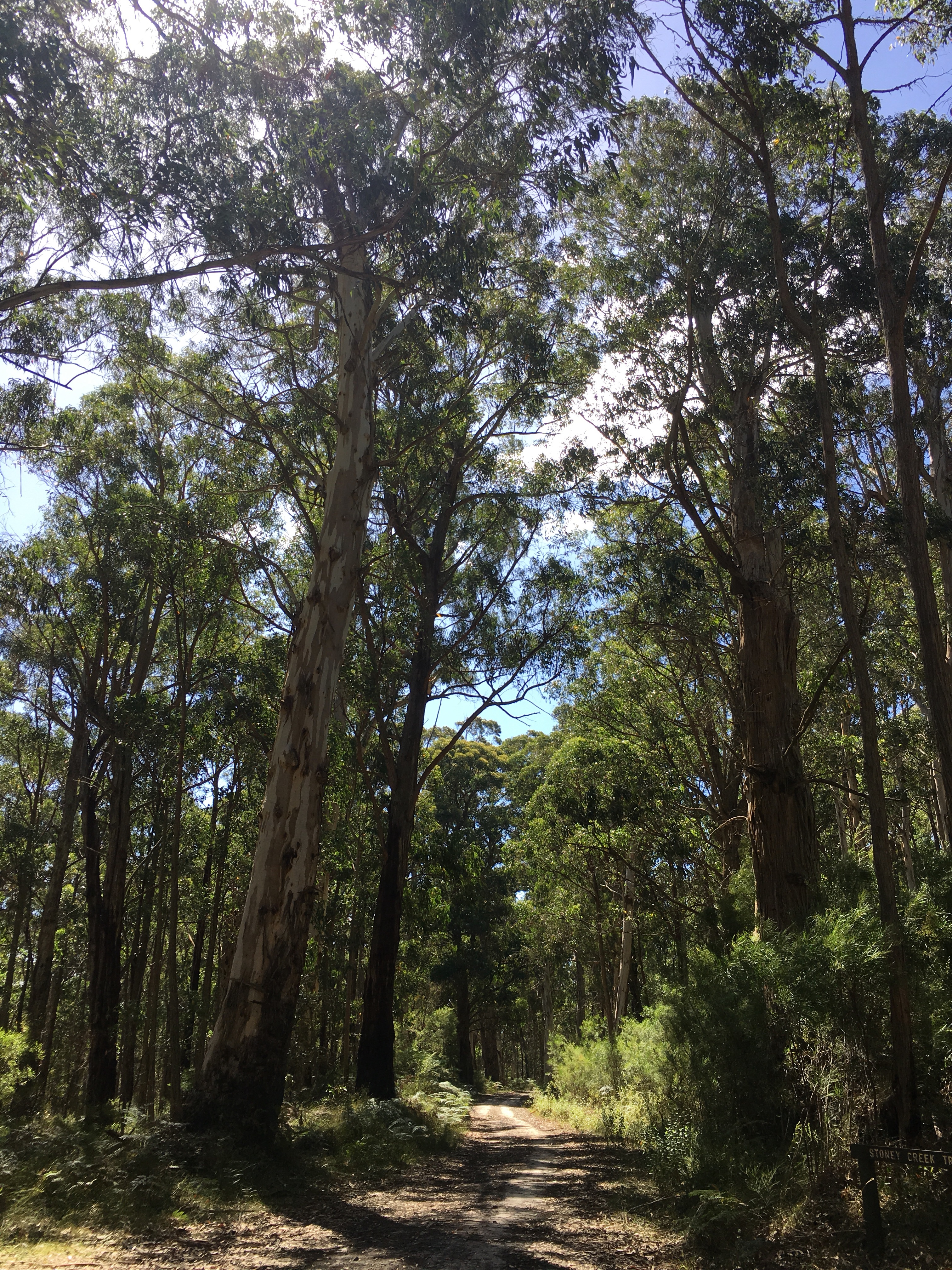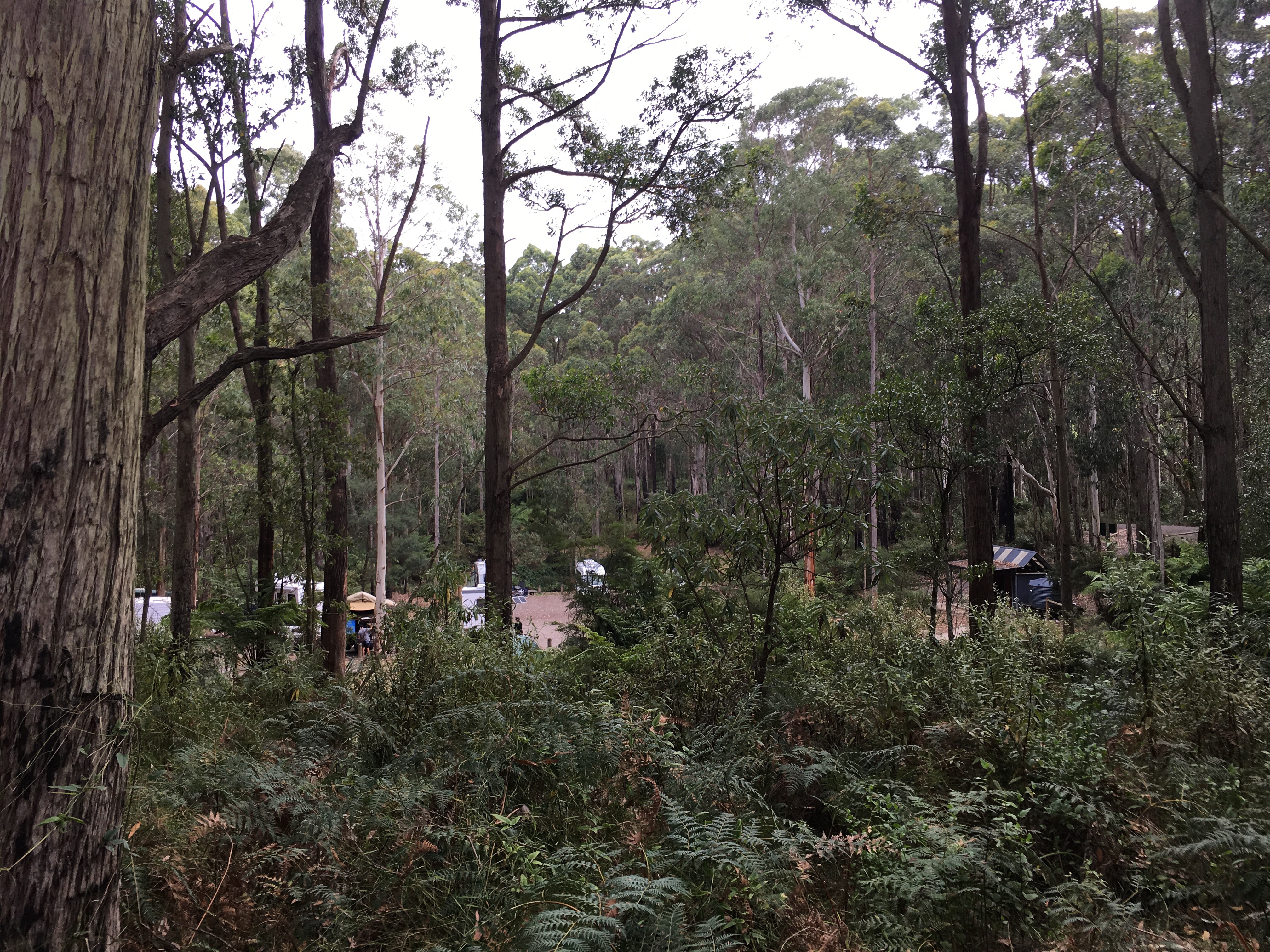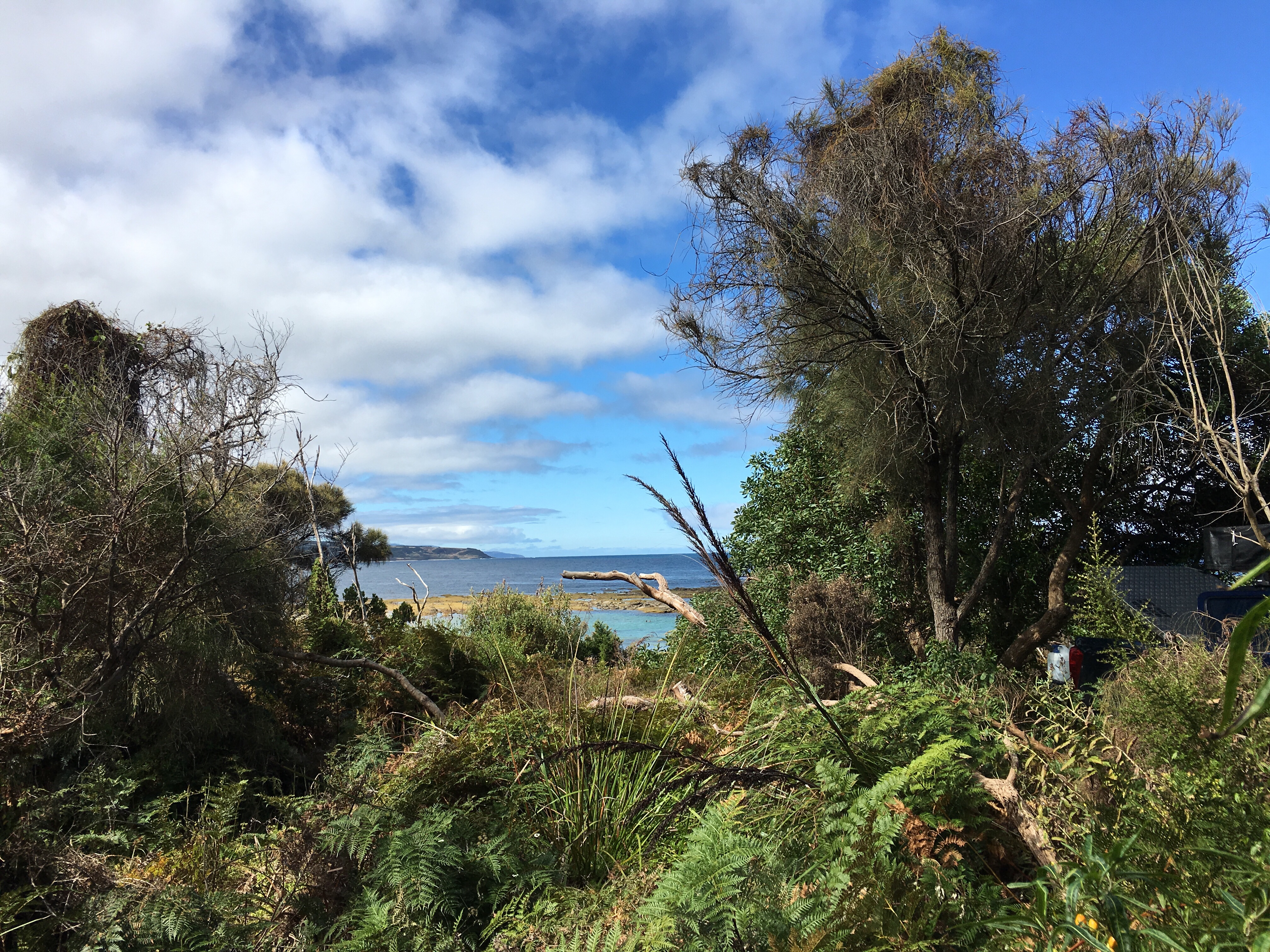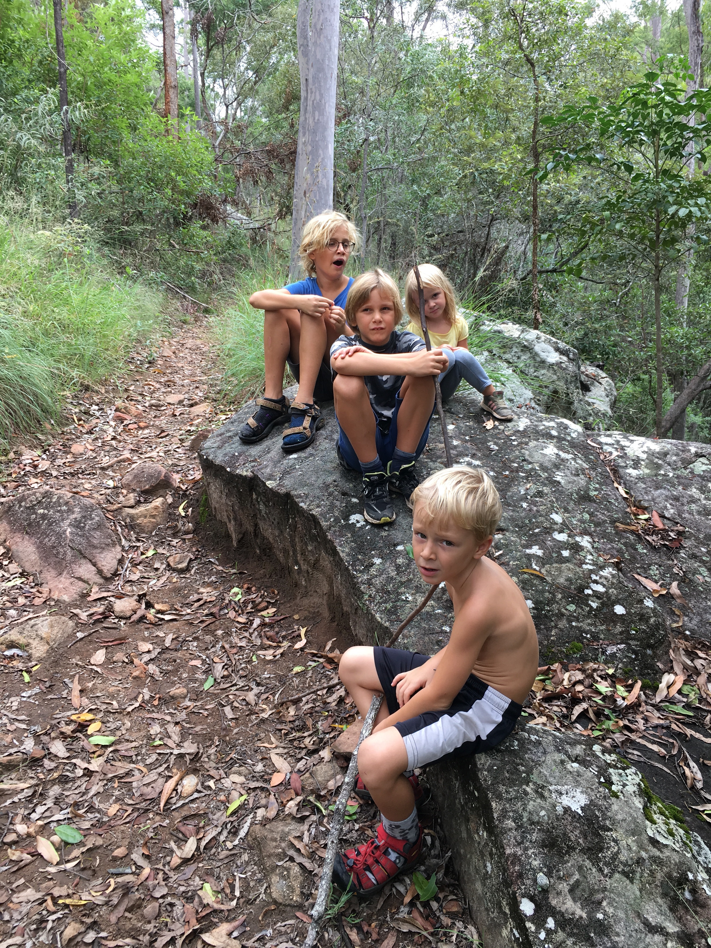 Gestern beschlossen wir eine zweite Nacht in unserem Camp zu bleiben, und ich erkundete morgens beim Joggen die Gegend. Der Waldweg zog sich weit bergauf und bergab durch den Eukalyptuswald mit seinen riesigen Bäumen. Darunter meterhohe Farne, eine ganz andere Landschaft als ich sie kenne. Und so machten wir uns nach dem Frühstück los auf eine Wanderung. Endlich kam auch mal wieder der Beach-trolley zum Einsatz, und er bewährte sich sehr. Es wehte immer wieder ein starker Wind und wir stellten uns bei den kurzen Schauern in einem hohlen Baumstamm unter. Und schlugen einen Lagerplatz in den Farnen auf. Abends lernten wir zwei sehr nette Hamburger Weltreisefamilien kennen, mit gemeinsam auch vier blonden Kindern. Spannend zu hören, wie die ihr Jahr gestaltet hatten, und abends am Lagerfeuer in großer Runde erfuhren wir spannende Erlebnisse aus Iran, Aserbaidschan, Australien und vielen anderen Ländern. Und die Kinder freuten sich sehr über Spielkameraden.