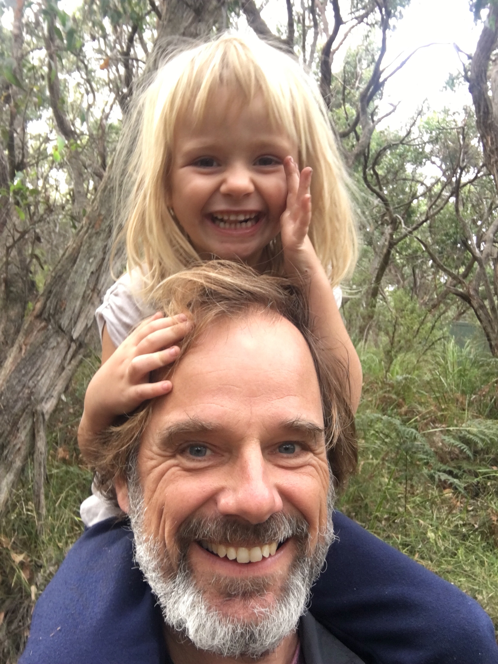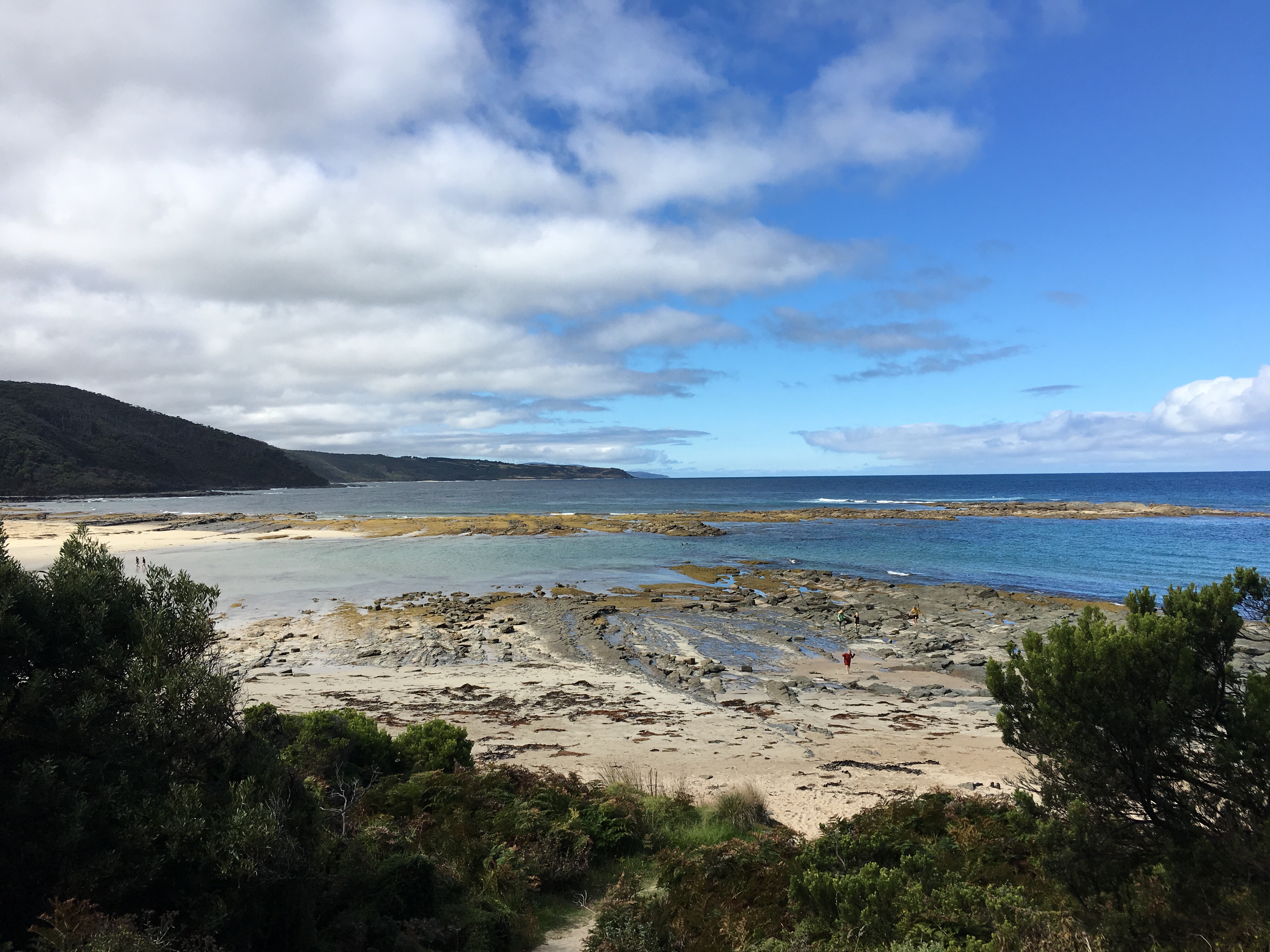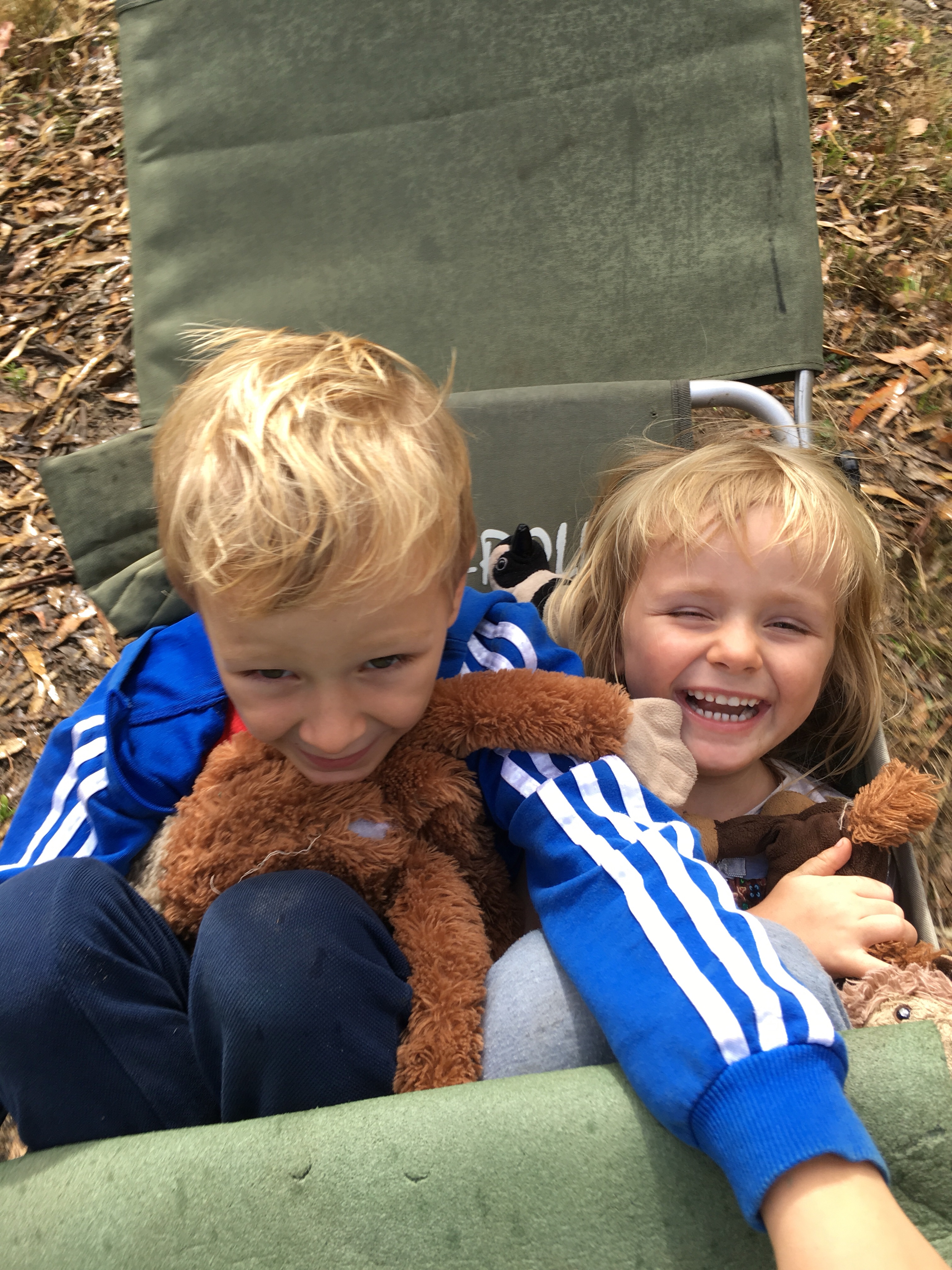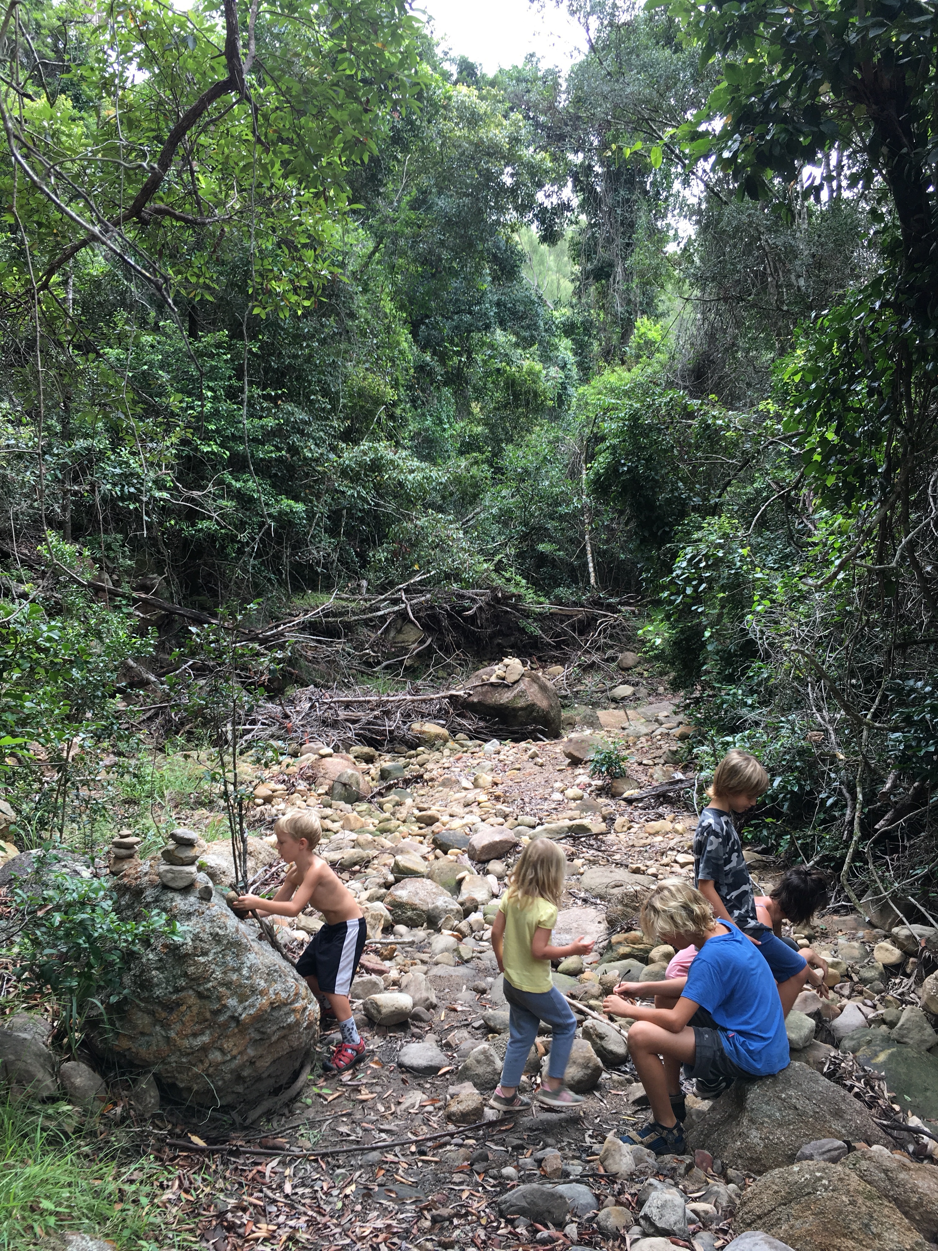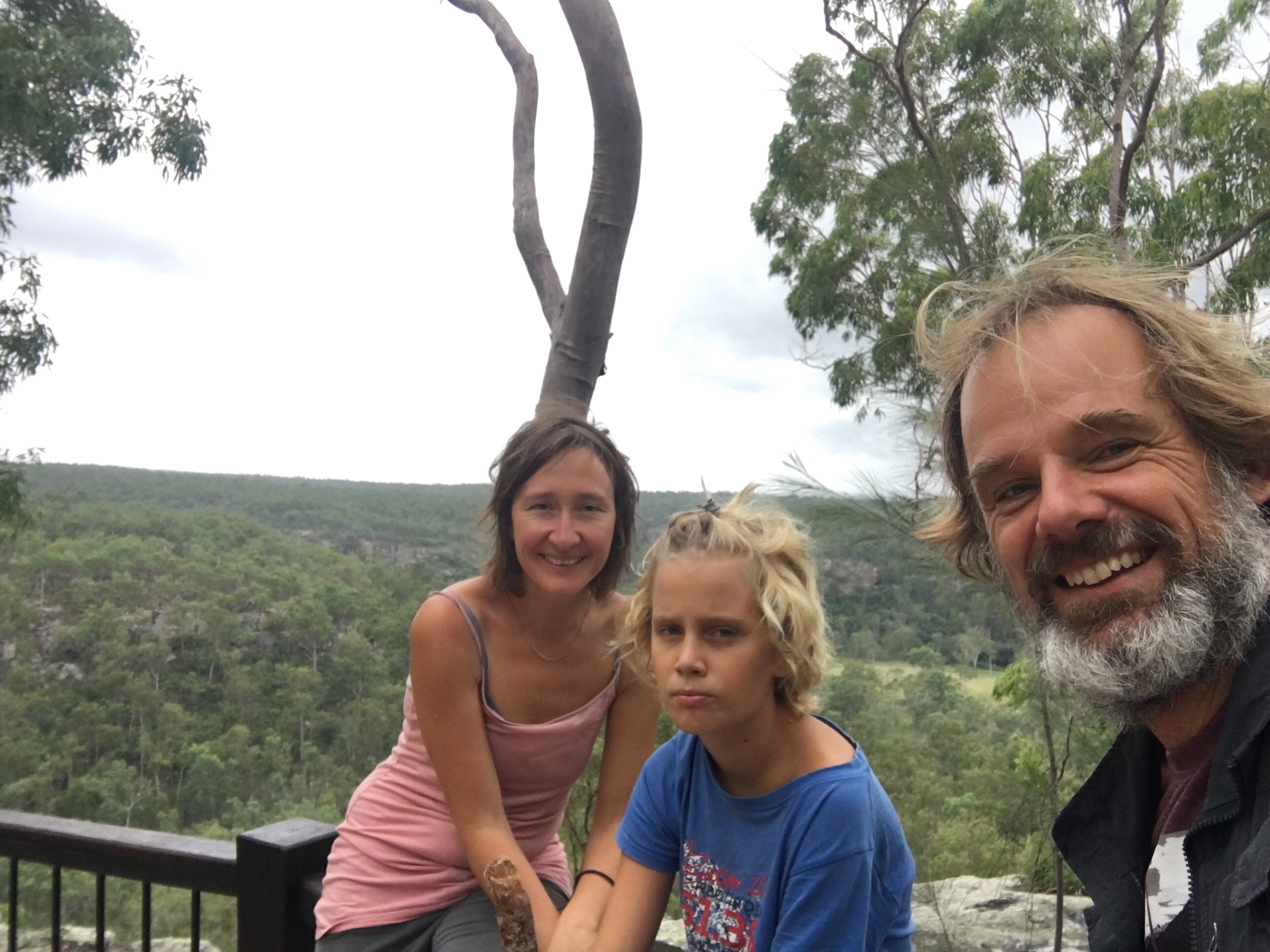 Gestern beschlossen wir eine zweite Nacht in unserem Camp zu bleiben, und ich erkundete morgens beim Joggen die Gegend. Der Waldweg zog sich weit bergauf und bergab durch den Eukalyptuswald mit seinen riesigen Bäumen. Darunter meterhohe Farne, eine ganz andere Landschaft als ich sie kenne. Und so machten wir uns nach dem Frühstück los auf eine Wanderung. Endlich kam auch mal wieder der Beach-trolley zum Einsatz, und er bewährte sich sehr. Es wehte immer wieder ein starker Wind und wir stellten uns bei den kurzen Schauern in einem hohlen Baumstamm unter. Und schlugen einen Lagerplatz in den Farnen auf. Abends lernten wir zwei sehr nette Hamburger Weltreisefamilien kennen, mit gemeinsam auch vier blonden Kindern. Spannend zu hören, wie die ihr Jahr gestaltet hatten, und abends am Lagerfeuer in großer Runde erfuhren wir spannende Erlebnisse aus Iran, Aserbaidschan, Australien und vielen anderen Ländern. Und die Kinder freuten sich sehr über Spielkameraden.