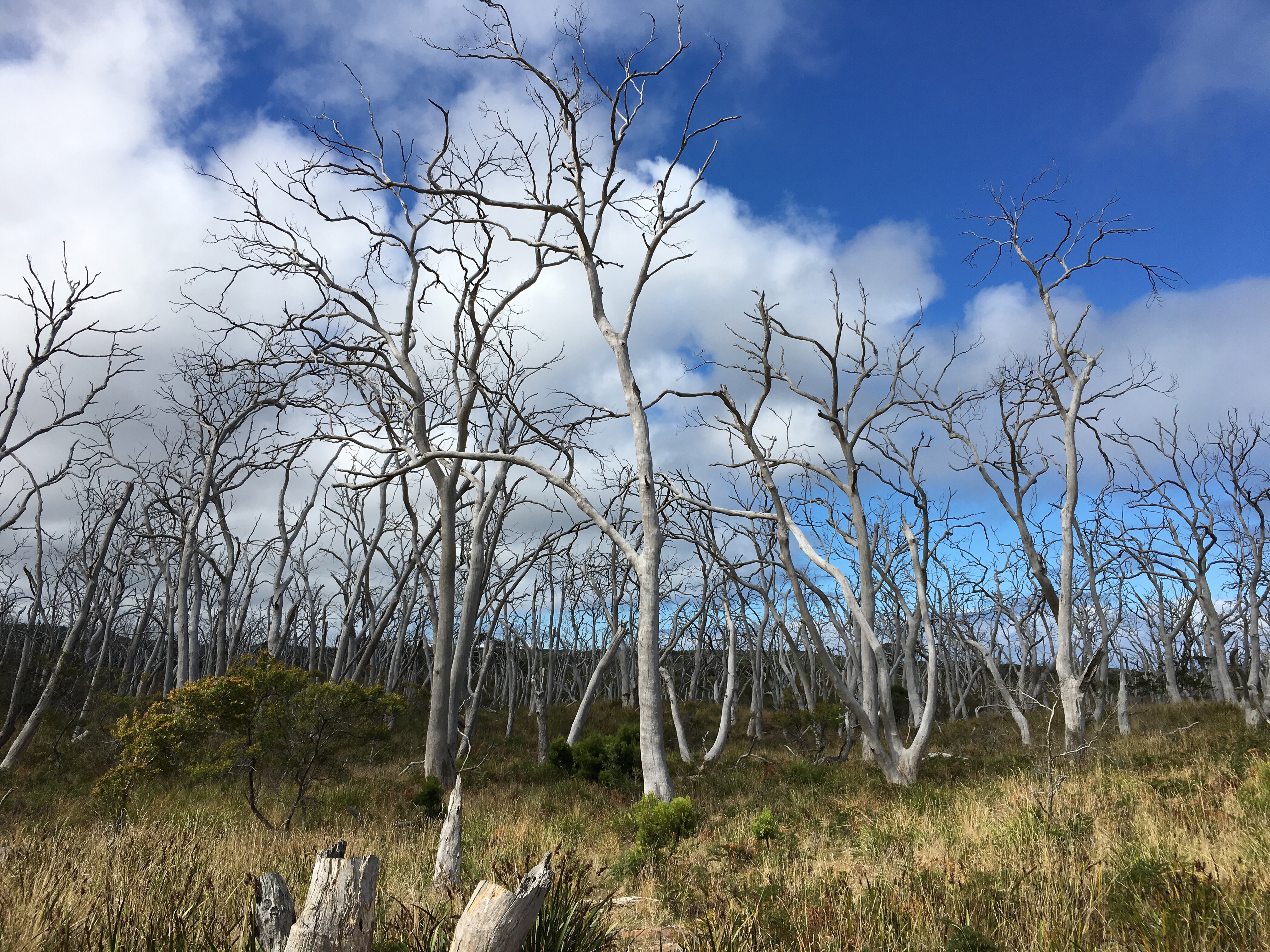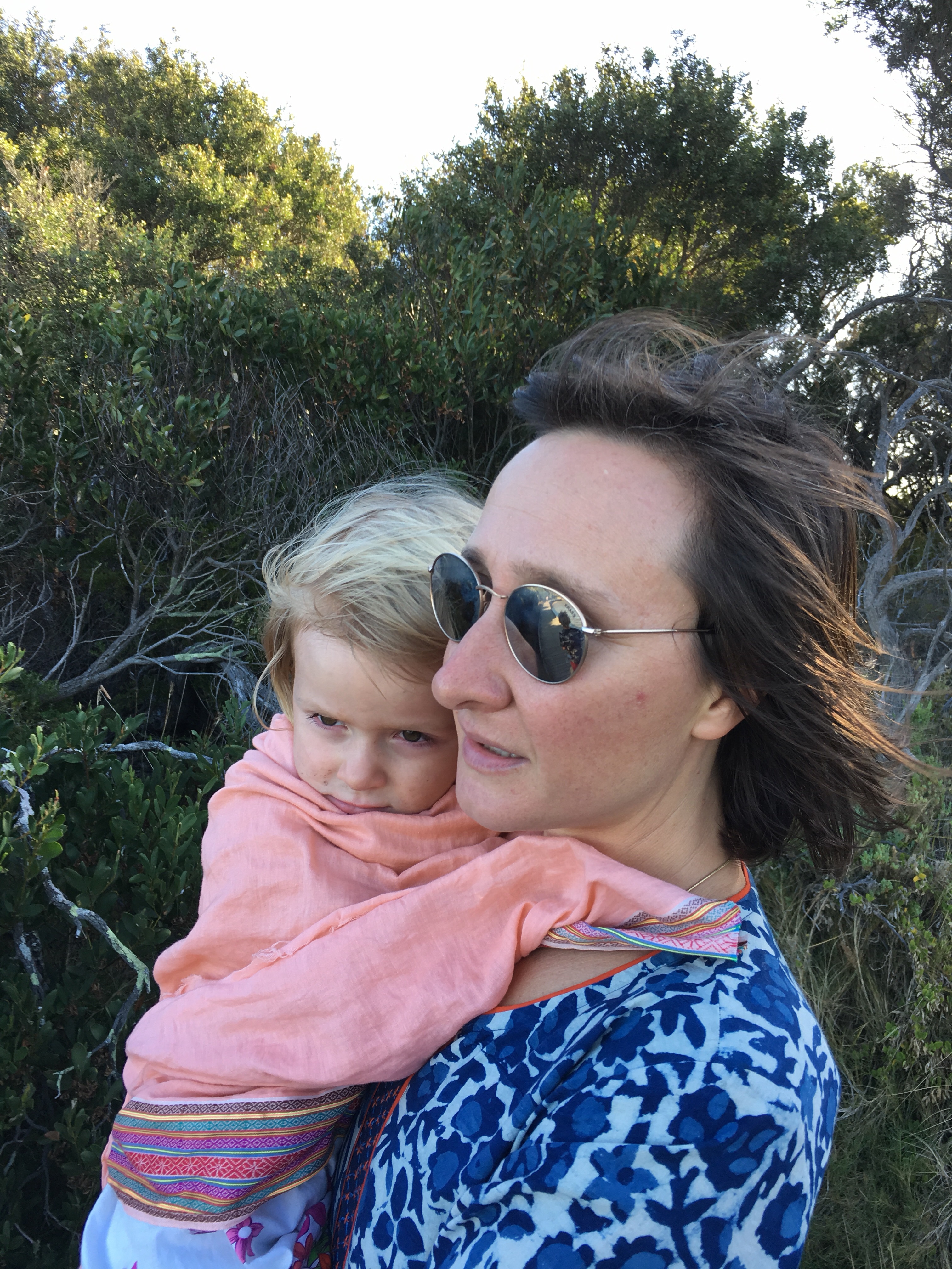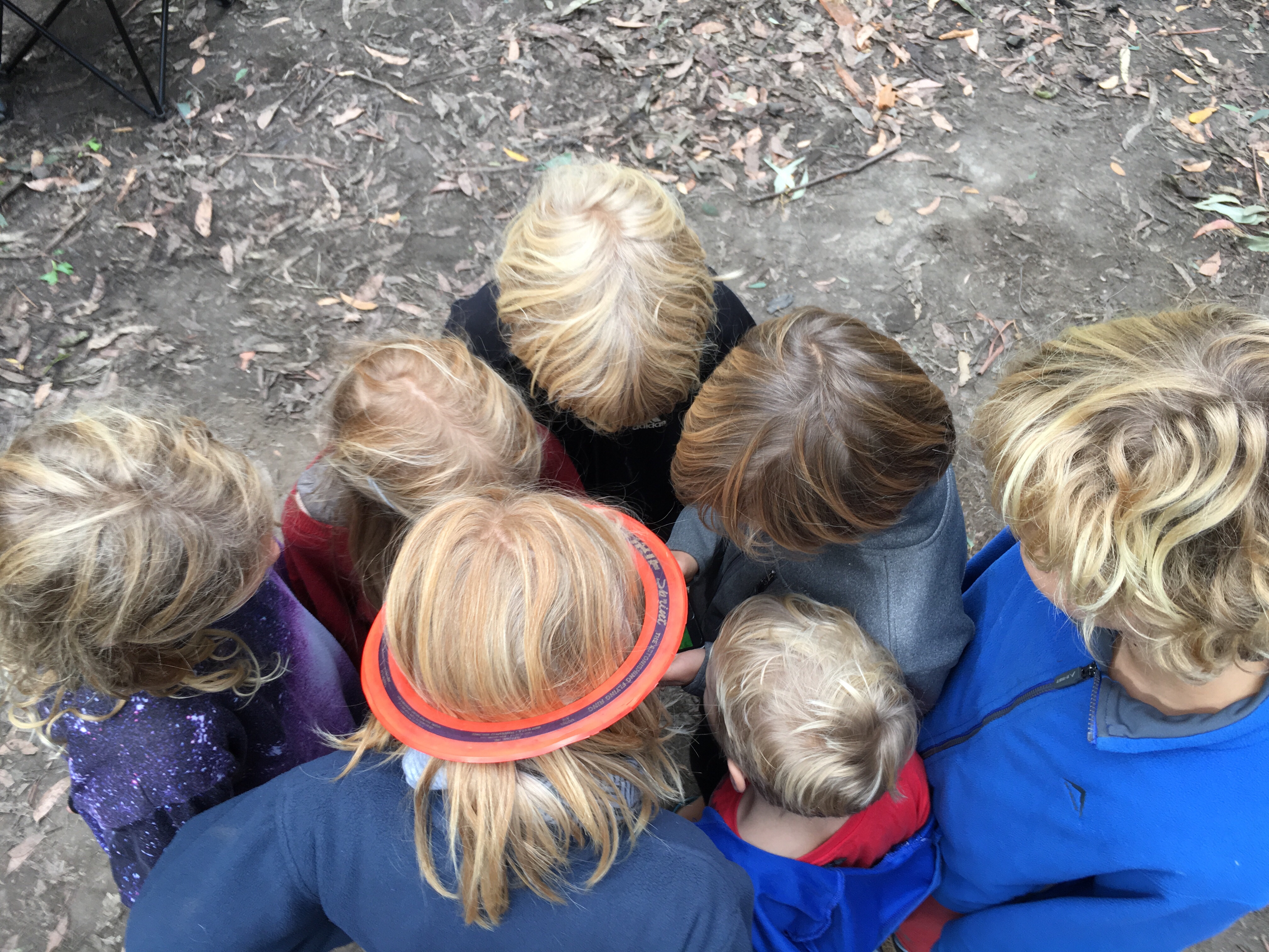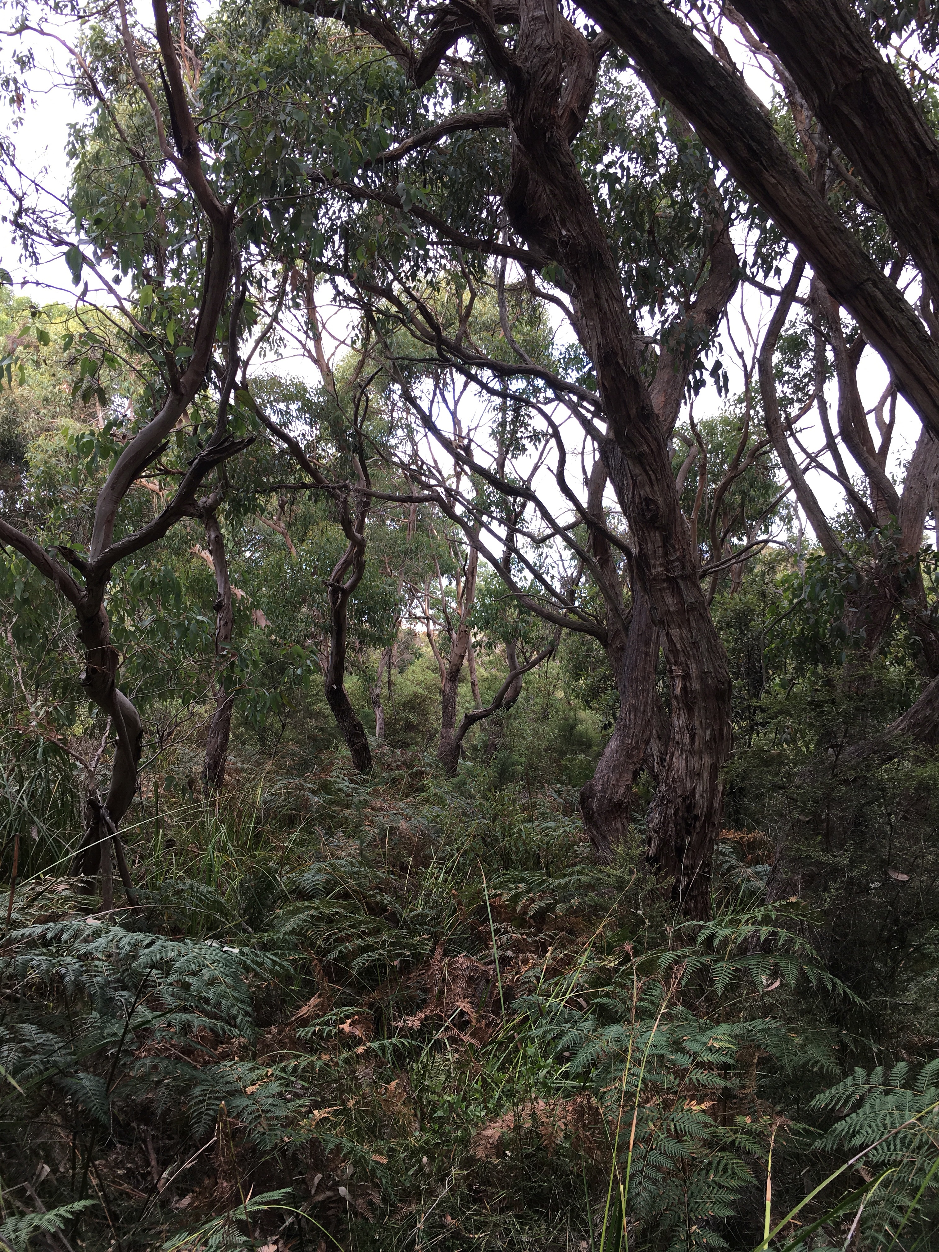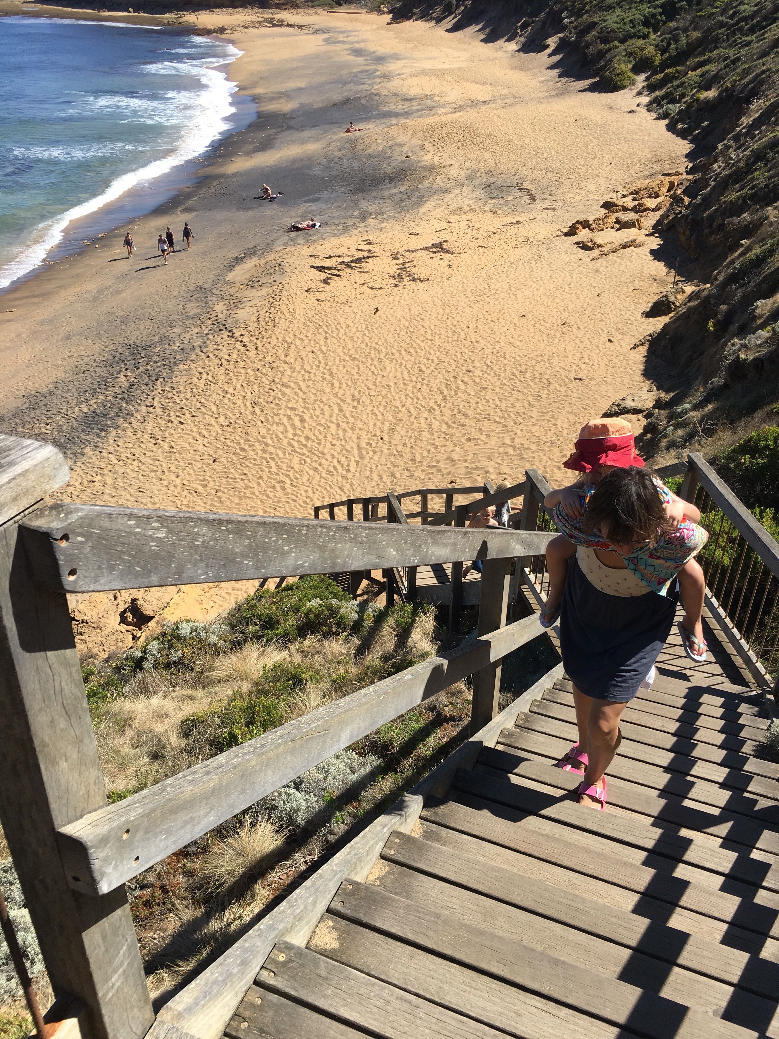 Gestern beschlossen wir eine zweite Nacht in unserem Camp zu bleiben, und ich erkundete morgens beim Joggen die Gegend. Der Waldweg zog sich weit bergauf und bergab durch den Eukalyptuswald mit seinen riesigen Bäumen. Darunter meterhohe Farne, eine ganz andere Landschaft als ich sie kenne. Und so machten wir uns nach dem Frühstück los auf eine Wanderung. Endlich kam auch mal wieder der Beach-trolley zum Einsatz, und er bewährte sich sehr. Es wehte immer wieder ein starker Wind und wir stellten uns bei den kurzen Schauern in einem hohlen Baumstamm unter. Und schlugen einen Lagerplatz in den Farnen auf. Abends lernten wir zwei sehr nette Hamburger Weltreisefamilien kennen, mit gemeinsam auch vier blonden Kindern. Spannend zu hören, wie die ihr Jahr gestaltet hatten, und abends am Lagerfeuer in großer Runde erfuhren wir spannende Erlebnisse aus Iran, Aserbaidschan, Australien und vielen anderen Ländern. Und die Kinder freuten sich sehr über Spielkameraden.