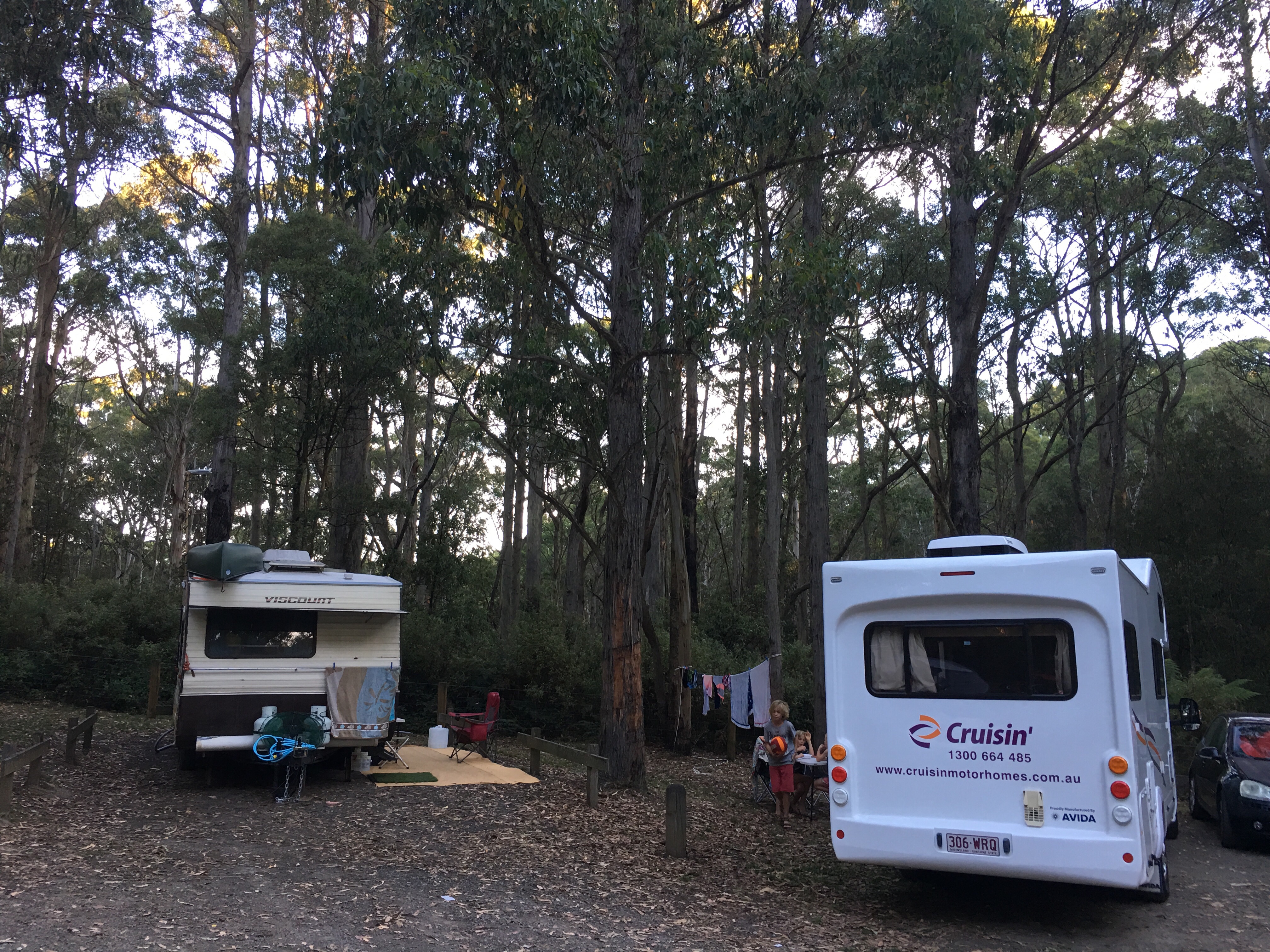 Es gibt sie, die freien Campingplätze an der Great Ocean Road. Wir haben in den kleinen Kreis der 12 Plätze noch Platz gefunden, weil ein junger, sympathischer Australier in Shorts und freiem Oberkörper zu uns herauskam und meinte, er könnte doch sein Auto umstellen, dann würden wir auch noch hereinpassen. So cool. Denn wir sind hier mitten im Wald, in einem öffentlichen Park wo es einen freien Platz gibt, mit Plumsklos und legal. Es ist eine lässige Atmosphäre hier, wir sitzen lange mit unseren freundlichen Nachbarn am Feuer und mit den mutigen Morpheus und Tara vornweg suchen wir Holz zwischen den riesigen Bäumen um das Feuer am brennen zu halten.