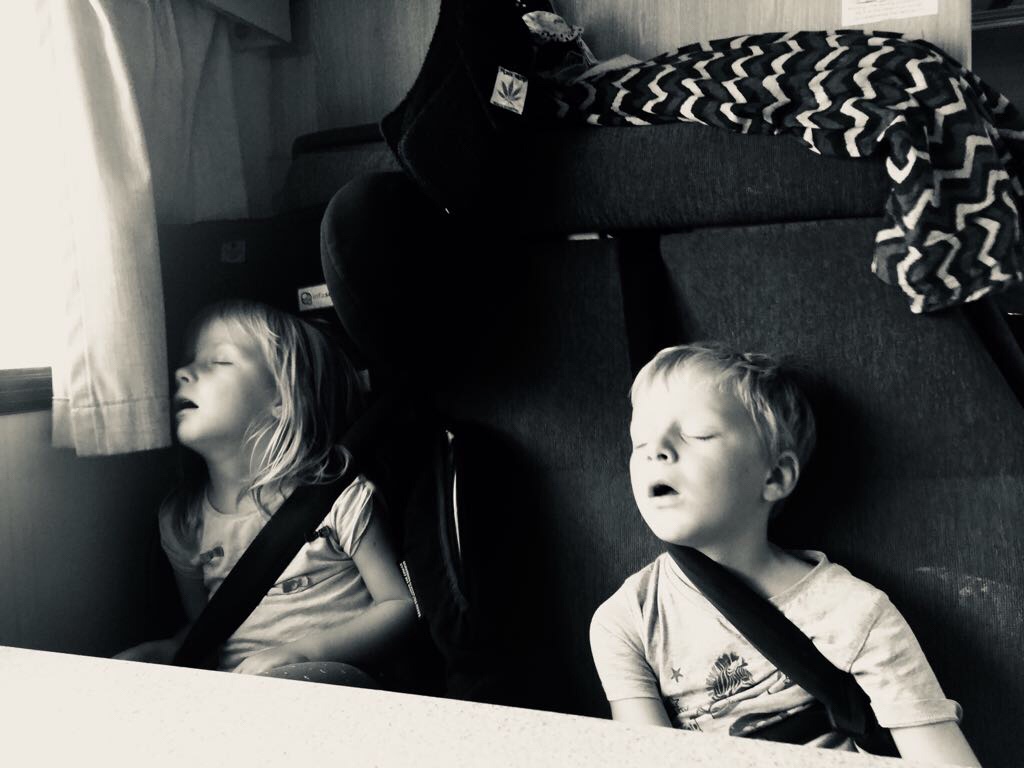 Wir sind also wieder mit dem Wohnmobil unterwegs. Unser ganzes Gepäck im überraschend schicken Wohnmobil verstaut. Der hat weiche Decken, einen großen Einbaukühlschrank und einen Backofen.