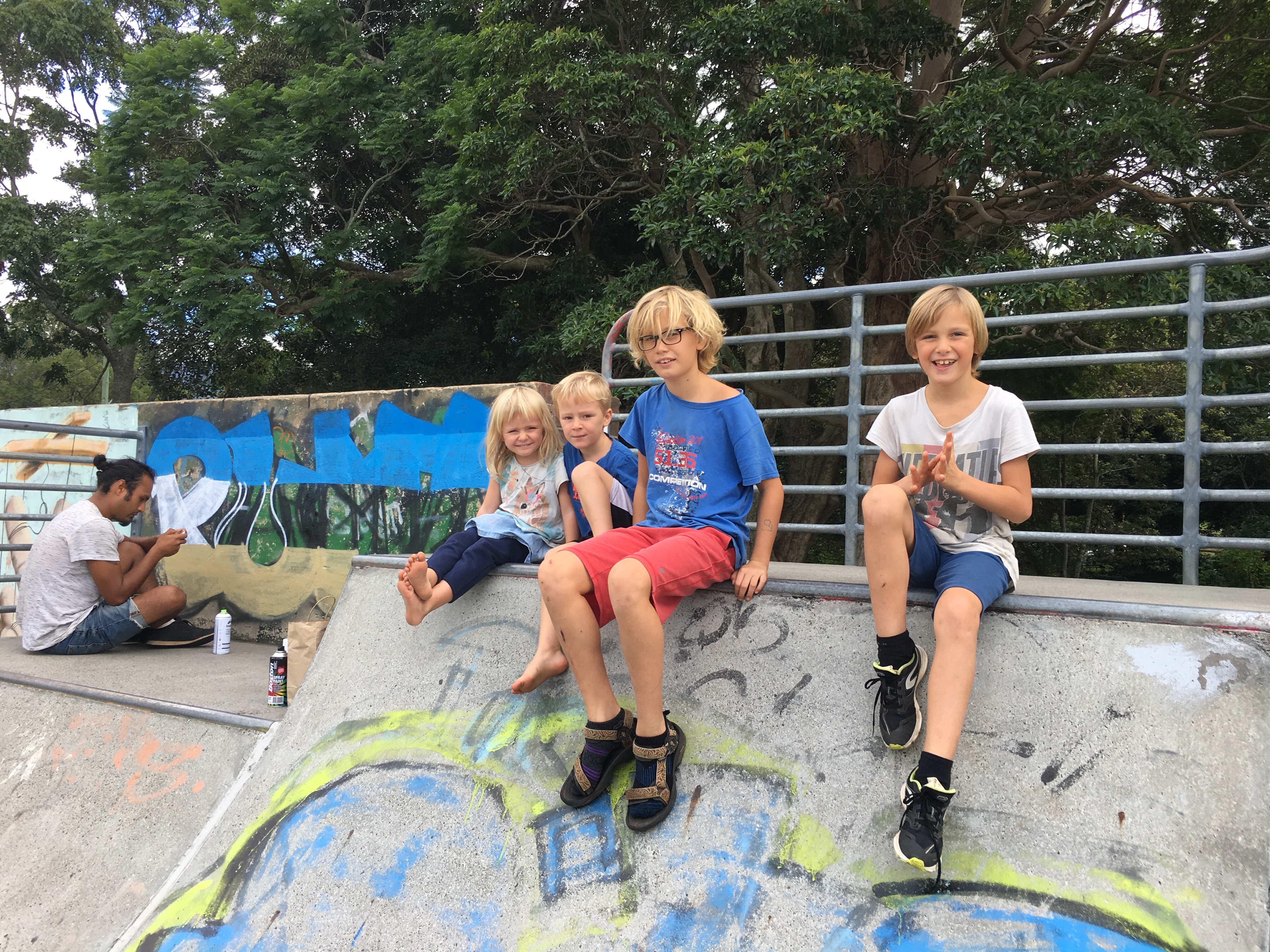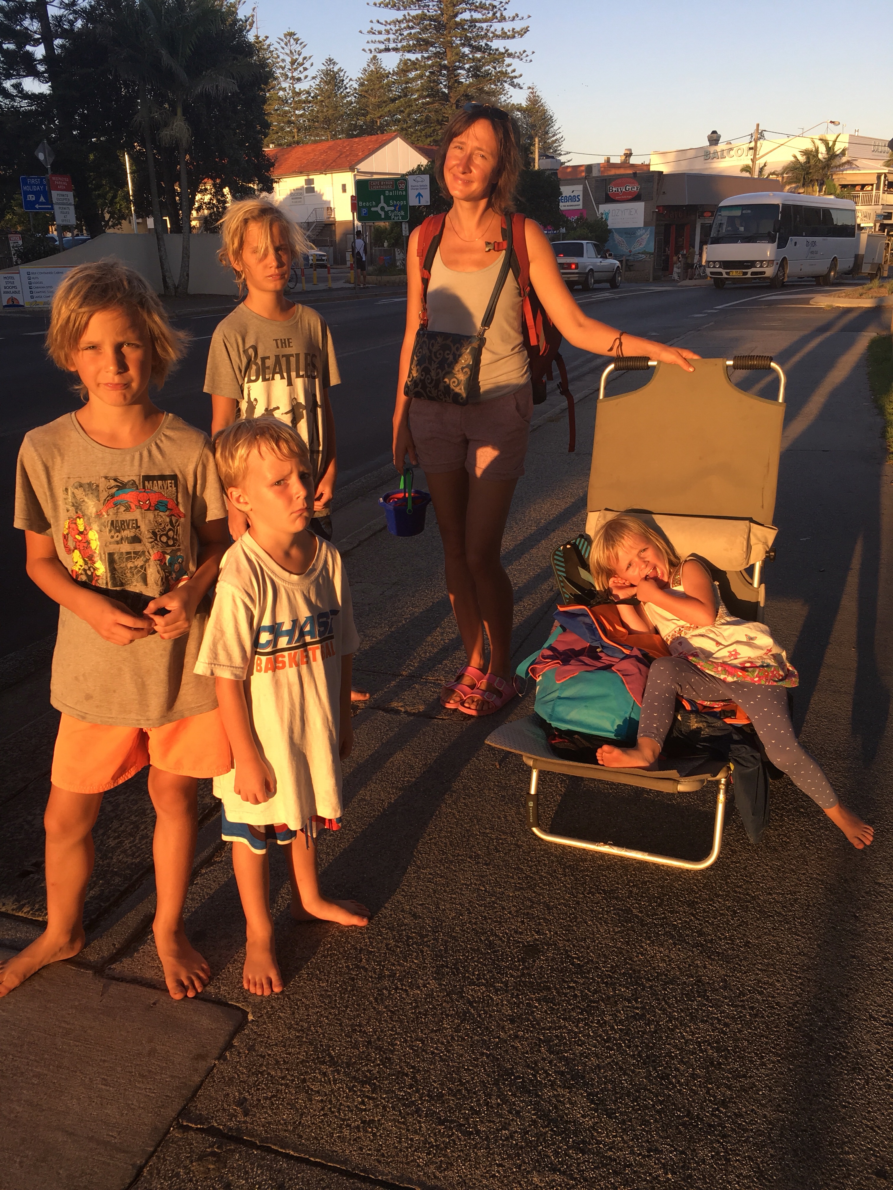 Heute dann auf einem freien Parkplatz im Ort zu Fuß durch Byron Bay. Erster Stop an einem Schwimmbad mit 50-Meter-Becken direkt am Strand. Die Kinder sind begeistert. Wir lernen eine nette Filmemacherin aus Österreich kennen, die einen 12jährigen Sohn hat und auch schon viel gereist ist, sie war lange auf Bali mit dem Sohn dort in der Schule. Jetzt hat sie einen Film mit dem Sohn gedreht zum Thema Meere und Plastik. Für Schulen; gestern kam er auch im Fernsehen: plasticfreeboy