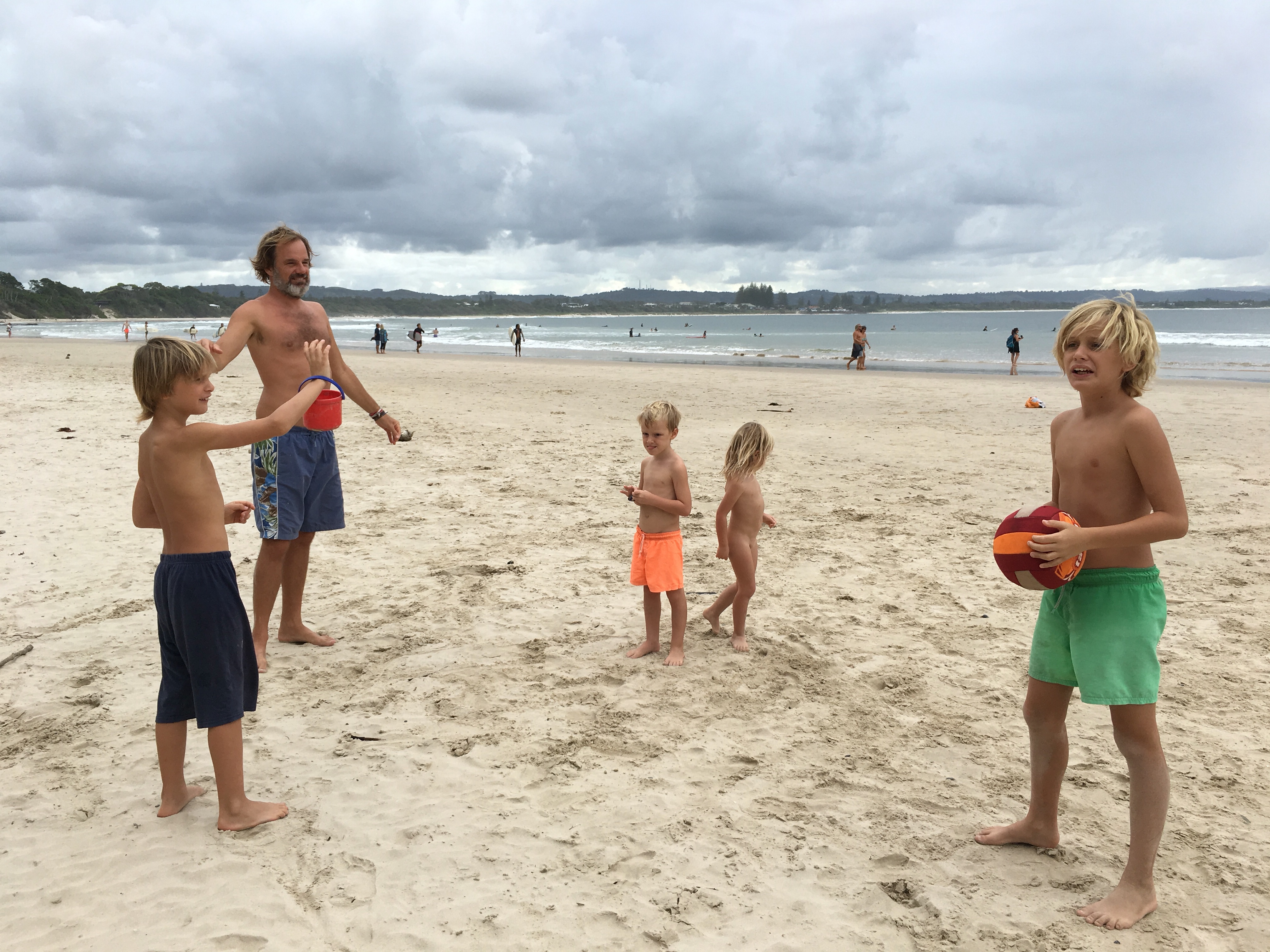 Und es ist eine freundliche Stimmung, wir fühlen uns willkommen und verbringen einen sehr entspannten Tag am Wasser gestern. Die Kinder bauen stundenlang Burgen und wir spielen Volleyball. Abends geht es nach Mullumbimby, 15 km im Landesinneren gelegen und auch sehr alternativ geprägt. Dort auf dem Showground kann man günstig übernachten, es stehen alte Reisebusse neben uns. Gestern Abend und heute Nacht regnet es noch, heute ist wieder strahlender Sonnenschein und das Wasser noch angenehm zum Baden.
