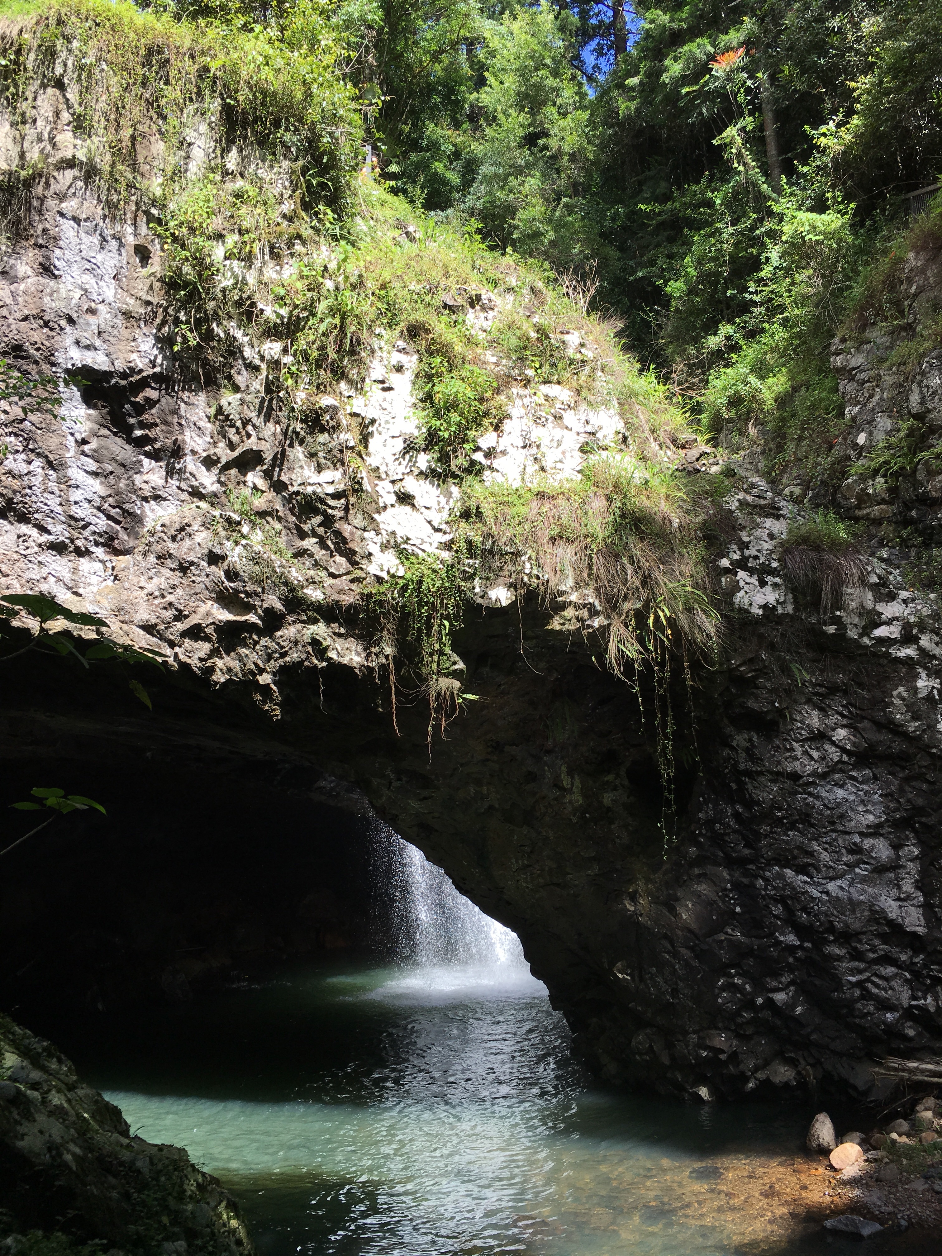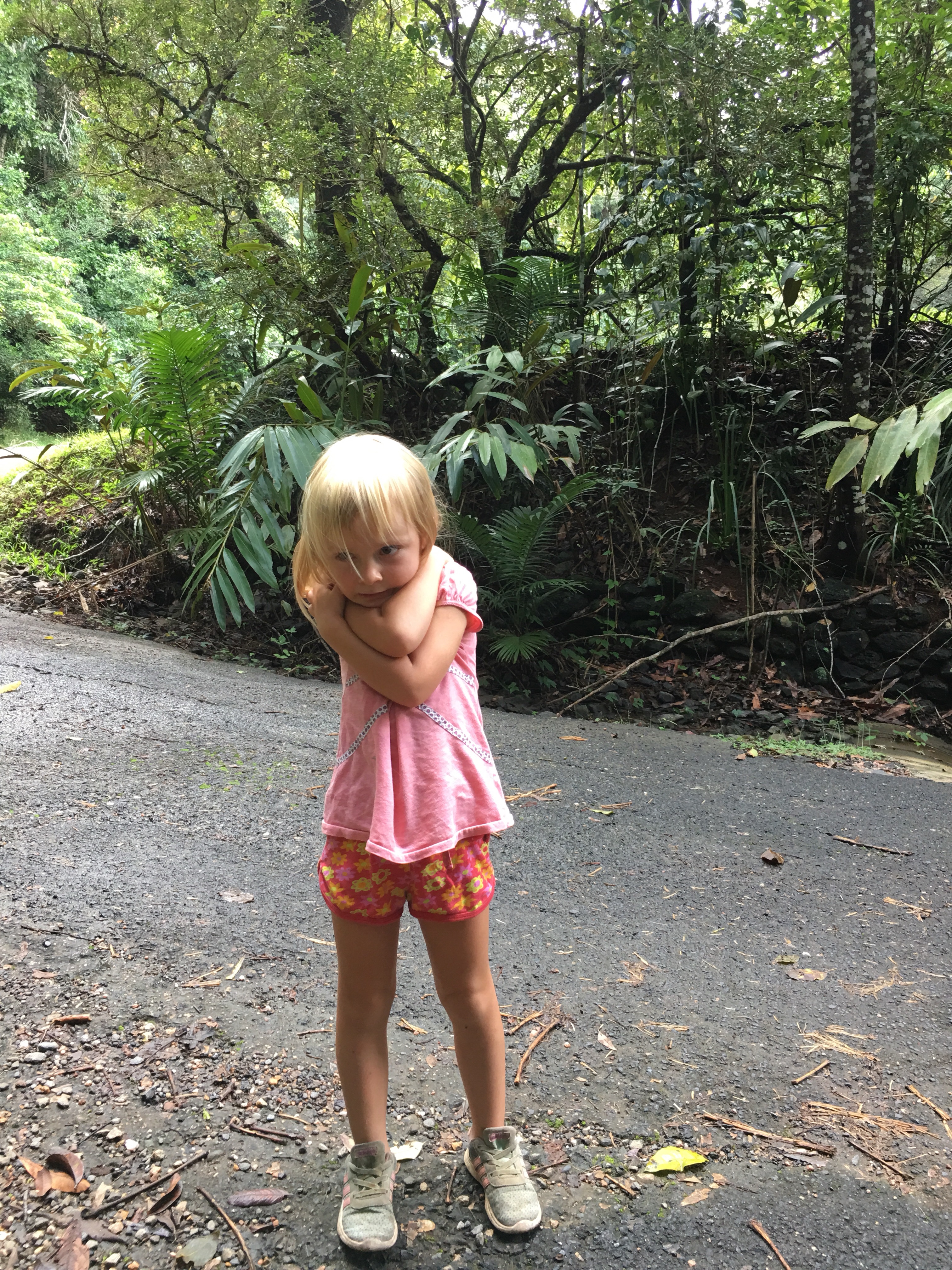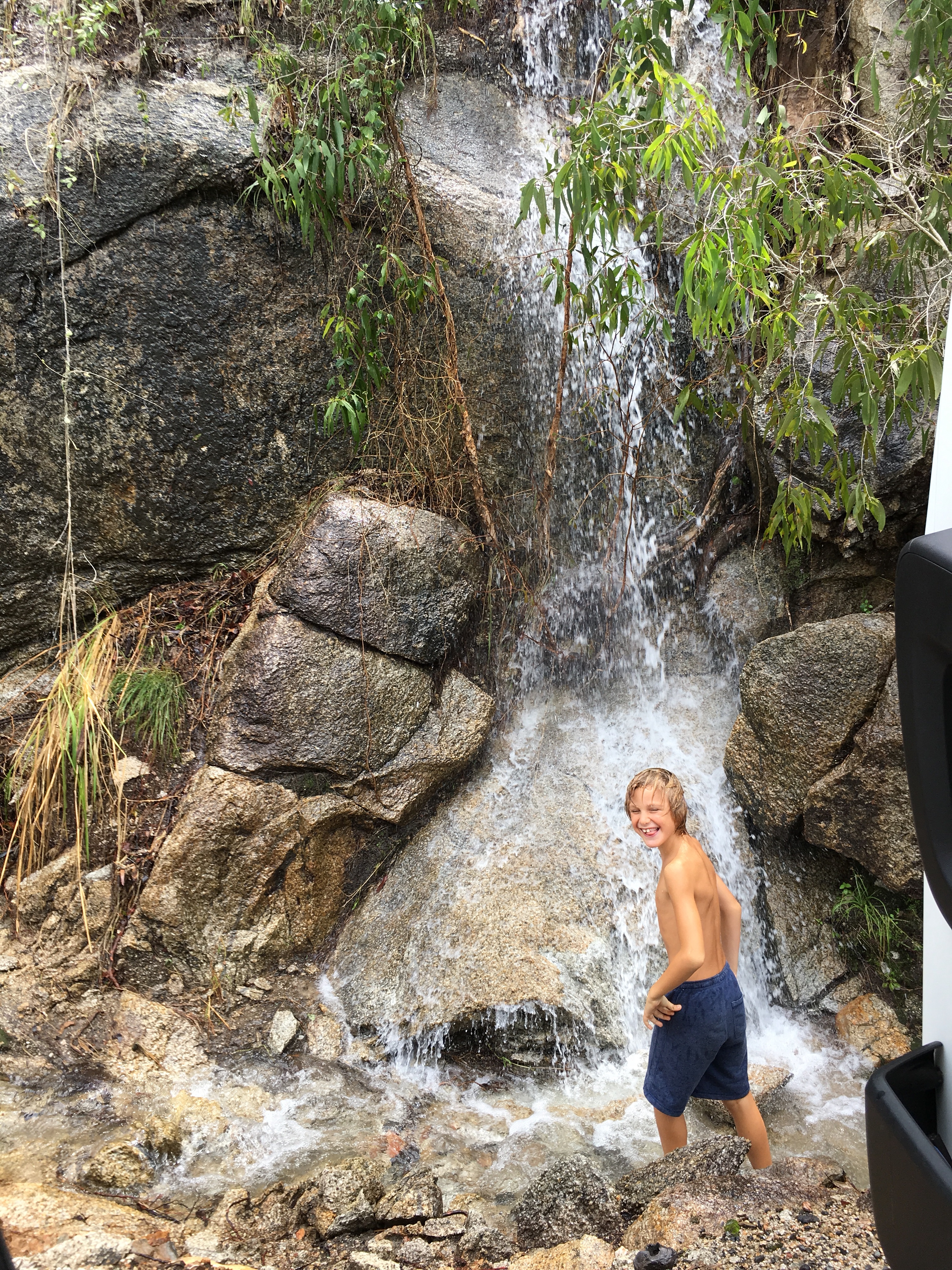 Die Kinder störten sich nicht am Wetter. Bei 25 bis 30 Grad kann man auch im Regen begeistert in Wasserparks und Pools herumtoben. Oder auch einen Wasserfall am Straßenrand für eine kurze Erfrischung nutzen.