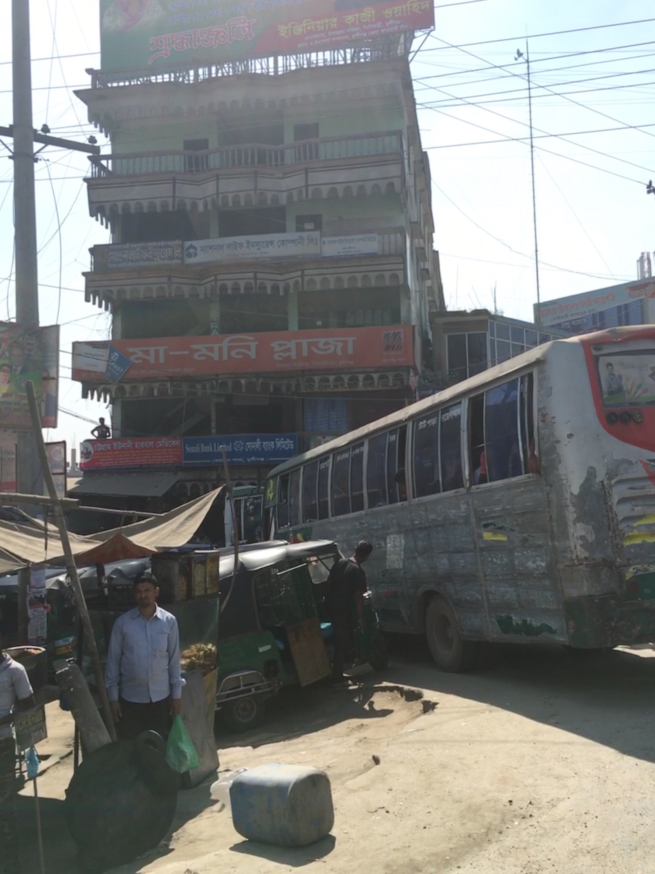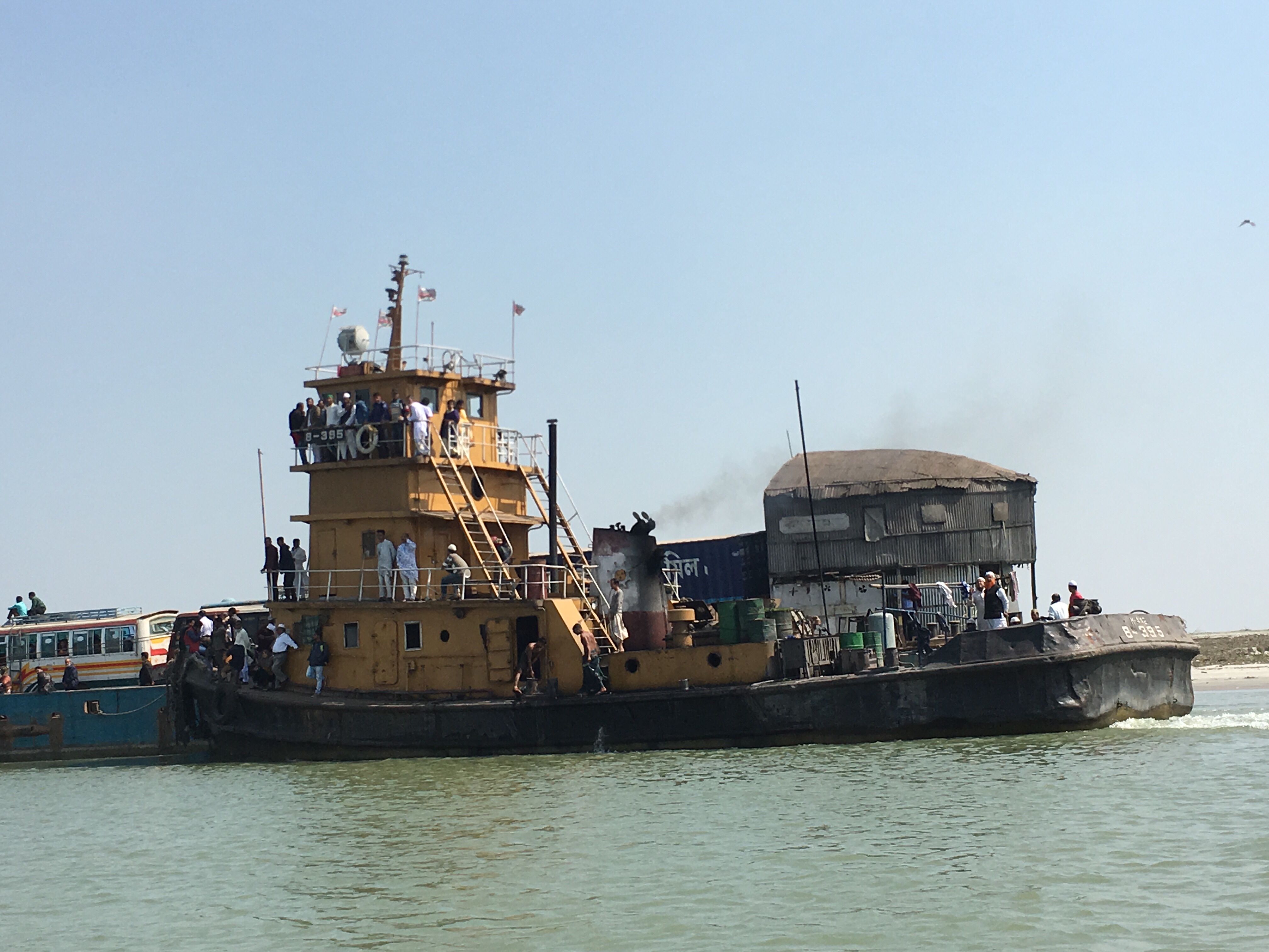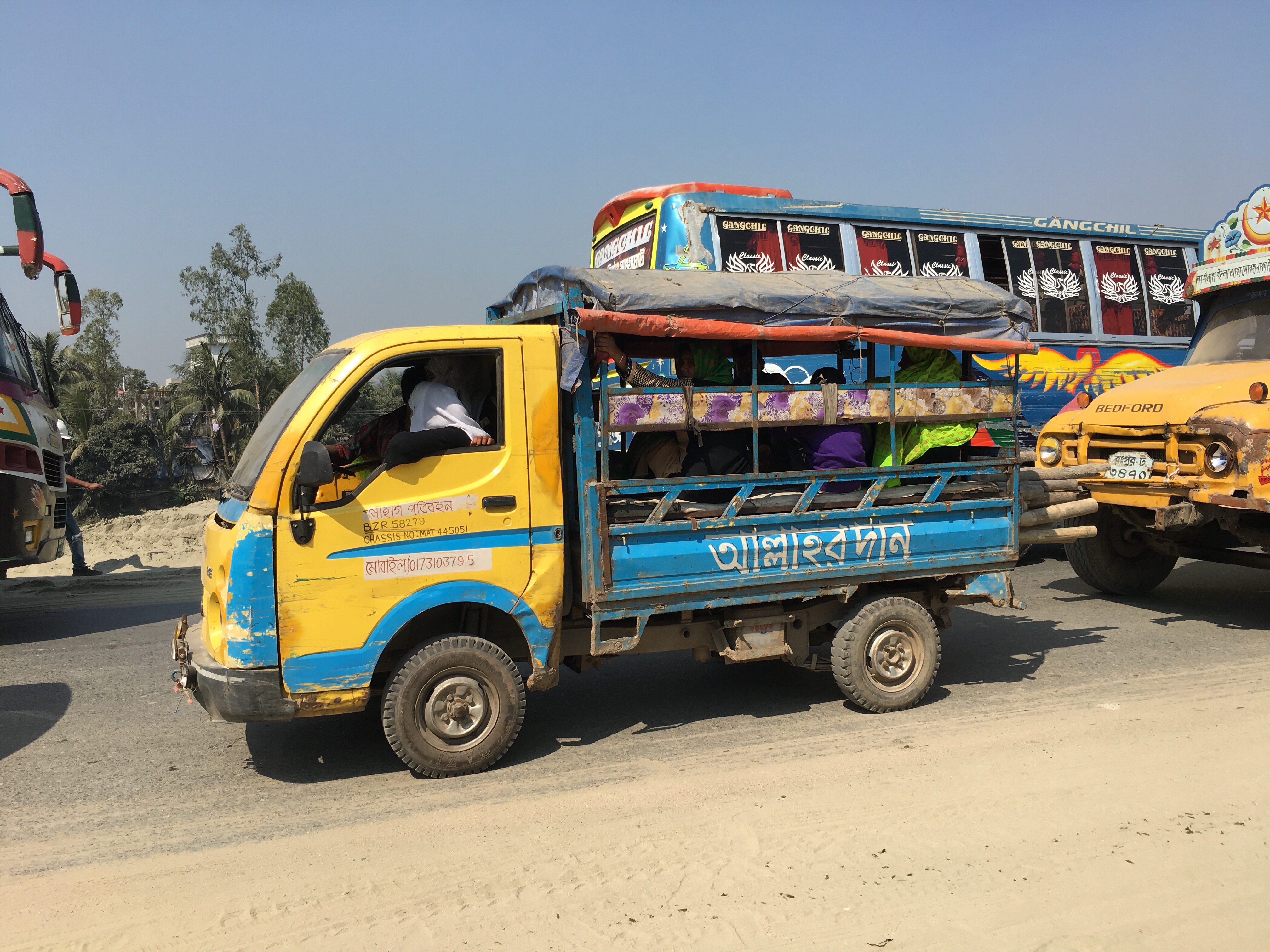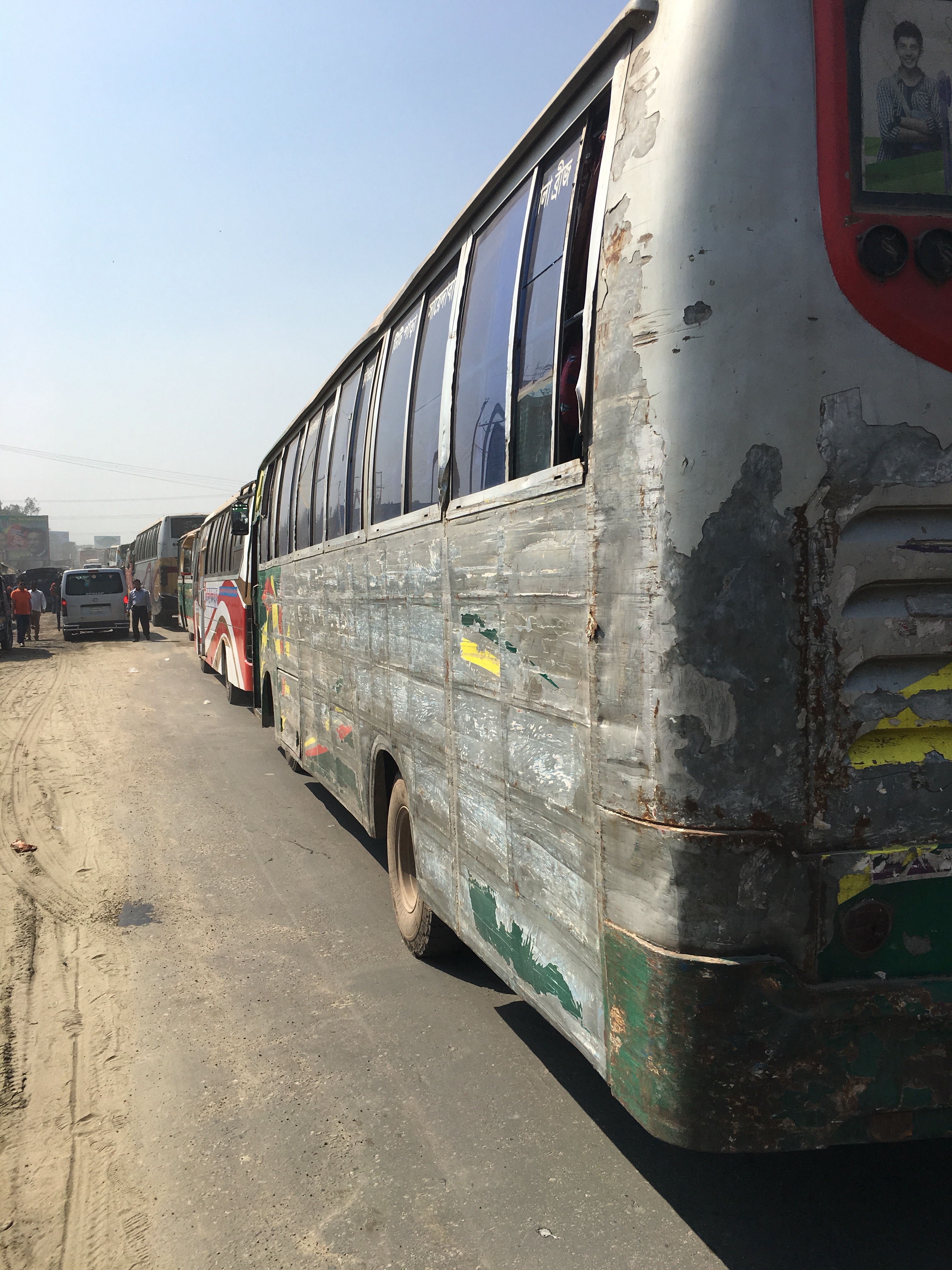 Es wird die erste Autobahn gebaut, noch ist die Straße nach Südwest nur eine einfache Landstraße, an jeder Kreuzung gibt es den Megastau, und obwohl es Freitag und damit im islamischen Bangladesch Feiertag ist, ist alles überfüllt. Das meiste sind uralte zerschrammte Busse und Fahrradrikschas, dazwischen Traktoren mit Ziegeln im Anhänger und Autos. Jeder überholt jeden bei jedem Stau und so gibt es kein vor und zurück weil jeder die Gegenfahrbahn zum vorbei fahren nutzen will. Wir üben uns in Geduld. Nach 3 Stunden haben wir es die 40 Kilometer aus der 17-Millionen-Metropole zum Fluss geschafft.