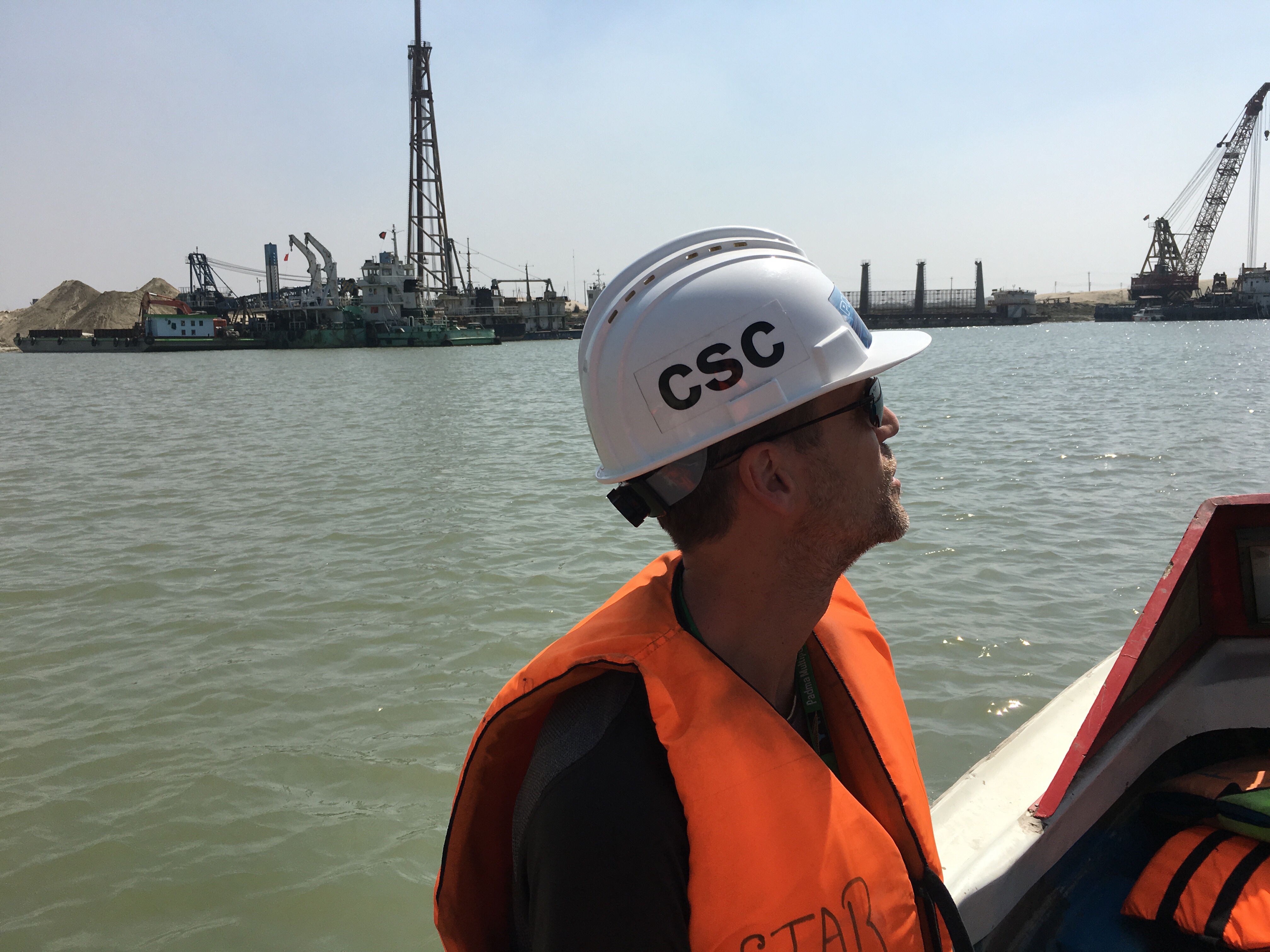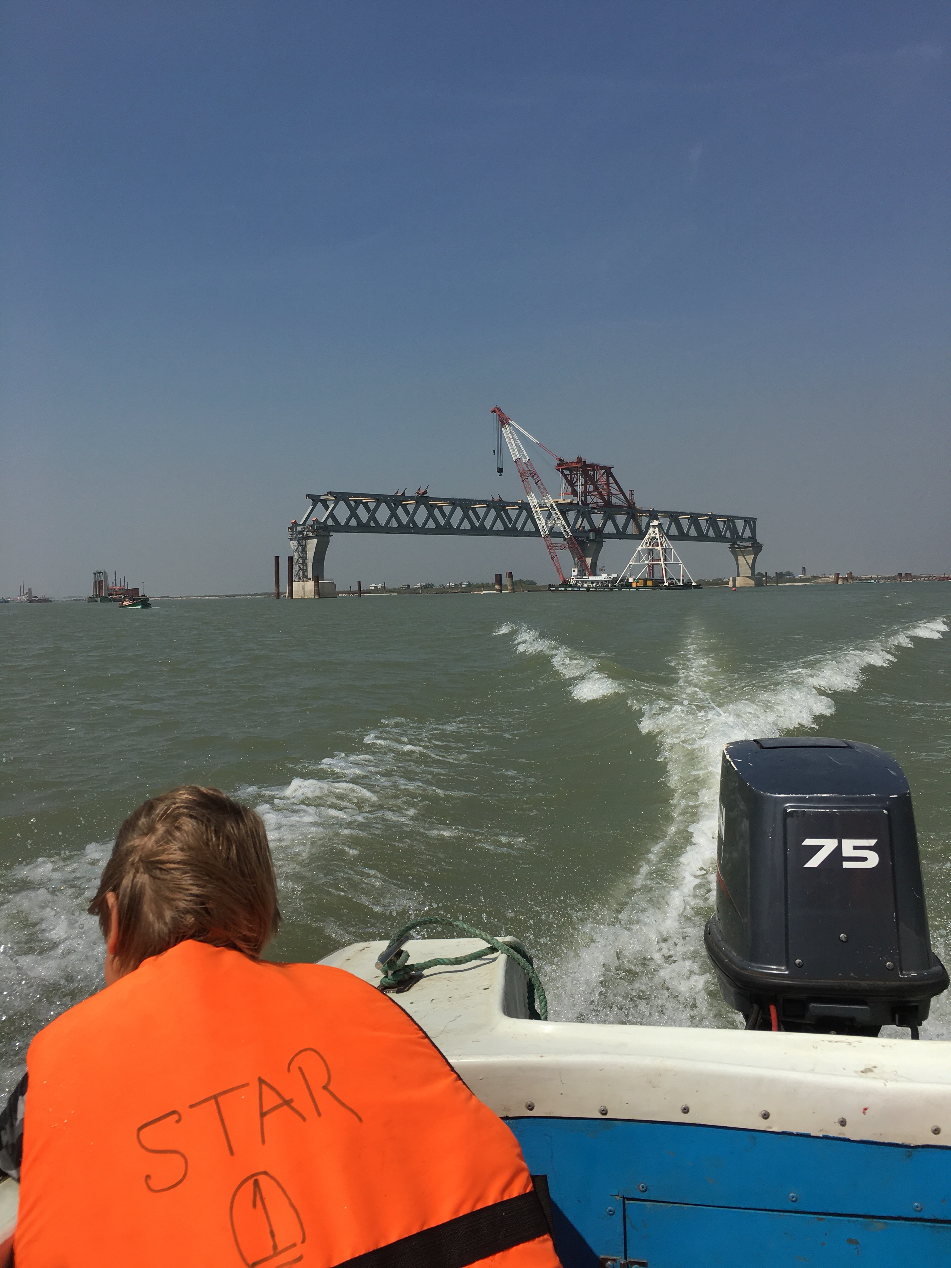 Es sind 6 bis 10 Kilometer bis zum anderem Ufer. Und hier ist auch die Baustelle der größten Flussbrücke der Welt. Erst mit dieser Brücke lässt sich der Südwesten des Landes und auch Indien von der Hauptstadt Dhaka aus ohne Fähre erreichen.