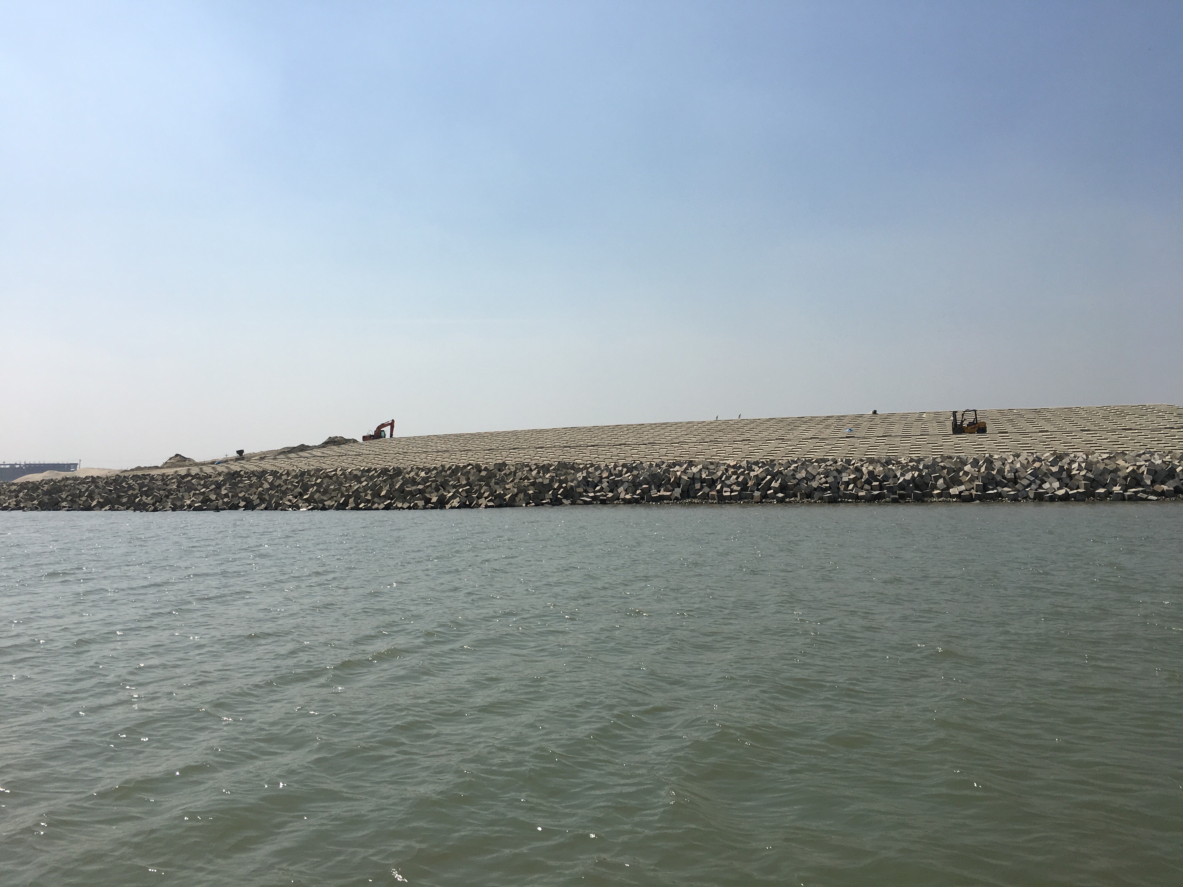 Dann sehen wir die Brücke. 2018 soll sie noch eröffnet werden, es wird mit Hochdruck gebaut. Die ersten 100 Meter langen Träger sind eingesetzt, oben soll eine vierspurige Straße laufen, darunter eine einspurige Eisenbahn in Meterspur und indischer Breitspur.