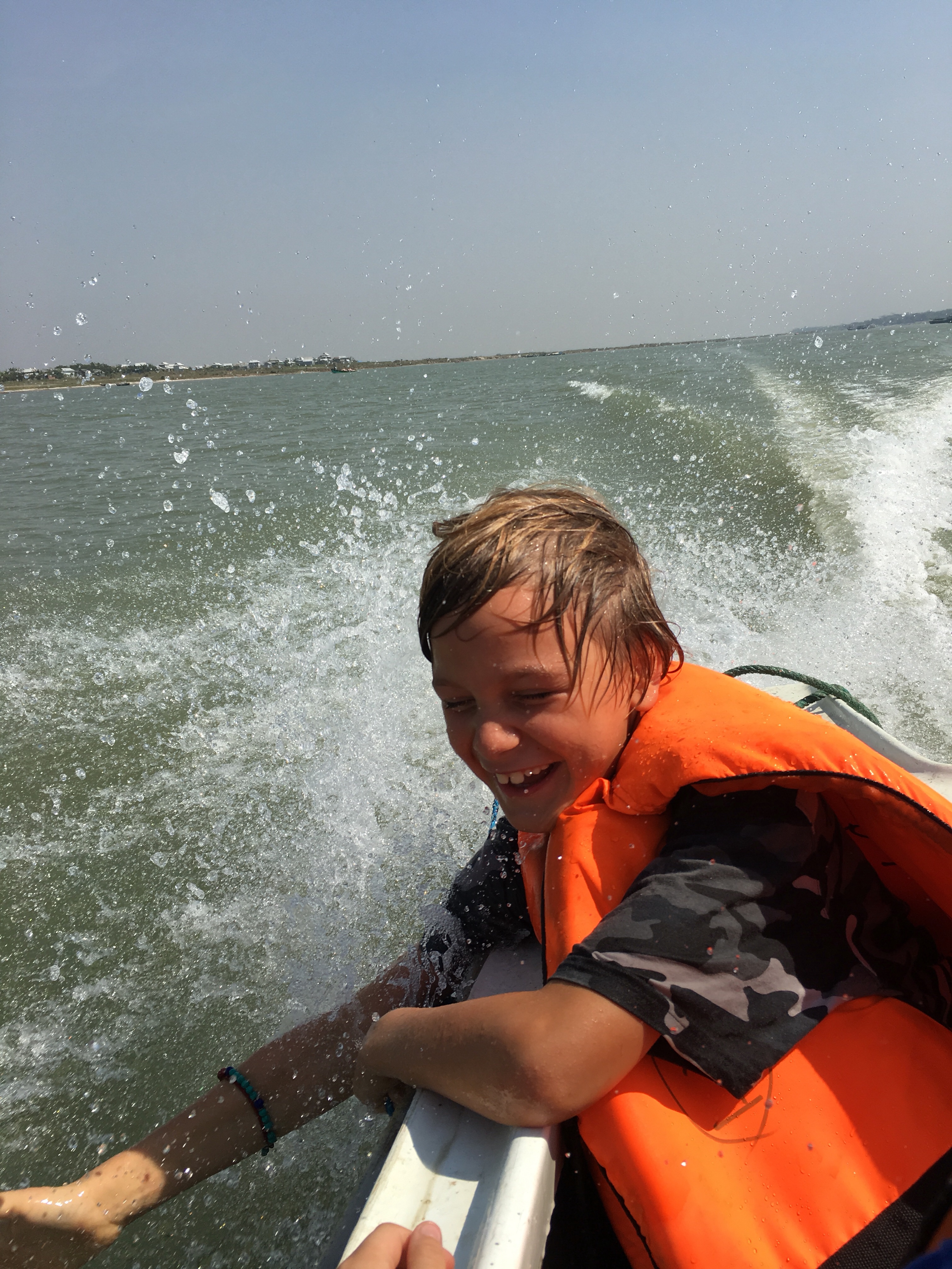 Wir steigen am Fähranleger in eines der Speedboote um, die mit dem 75kw-Motor uns auf den Fluss herausfahren. Jetzt steigt die Stimmung der Kinder schlagartig. Das Boot ist schnell. Wir fahren an unglaublich verrosteten und überfüllten Fähren vorbei. Draußen ist es herrlich, es riecht und fühlt sich an wie daheim in Sandstedt an der Unterweser, wo wir im Sommer immer Urlaub machen.