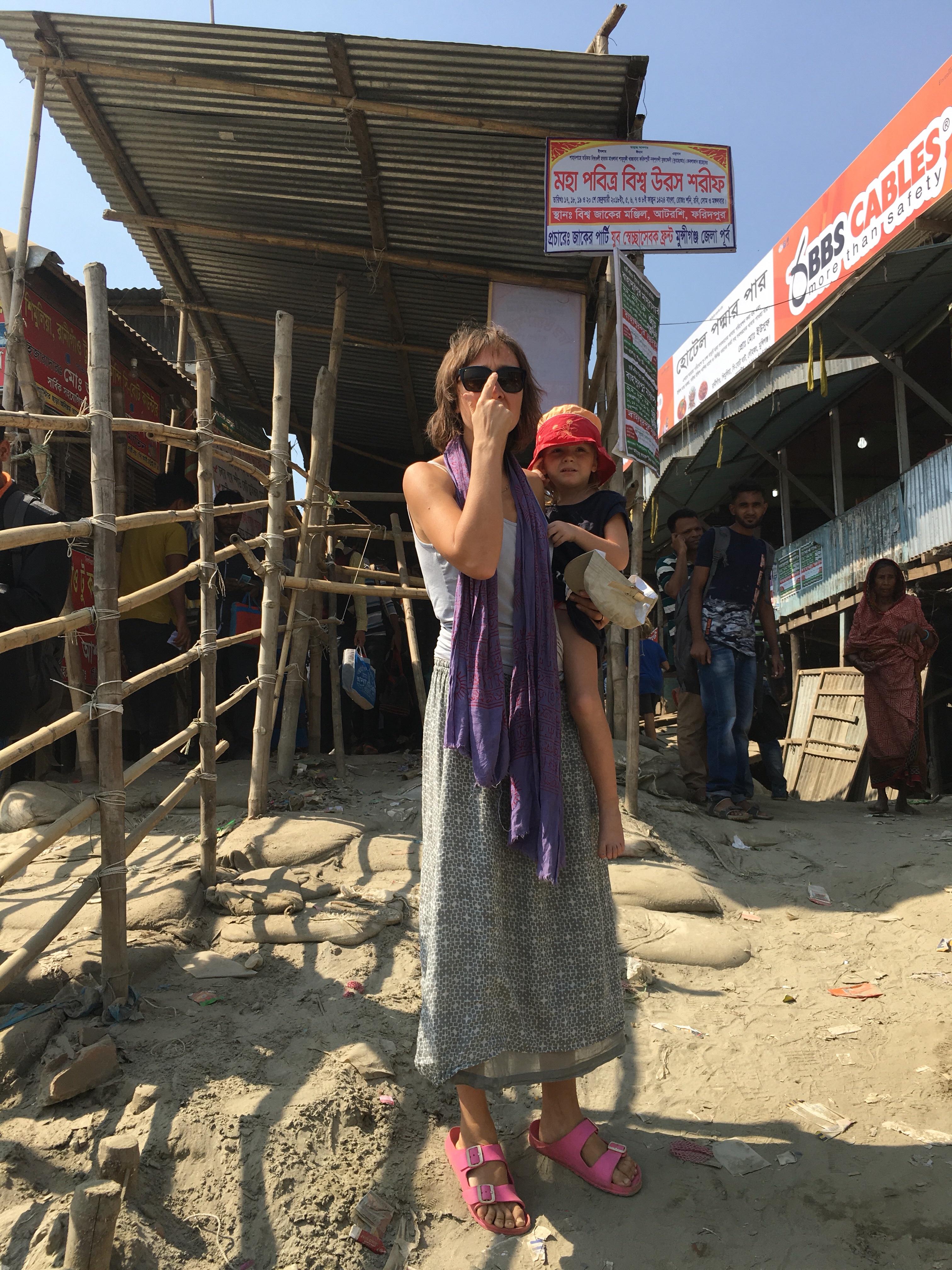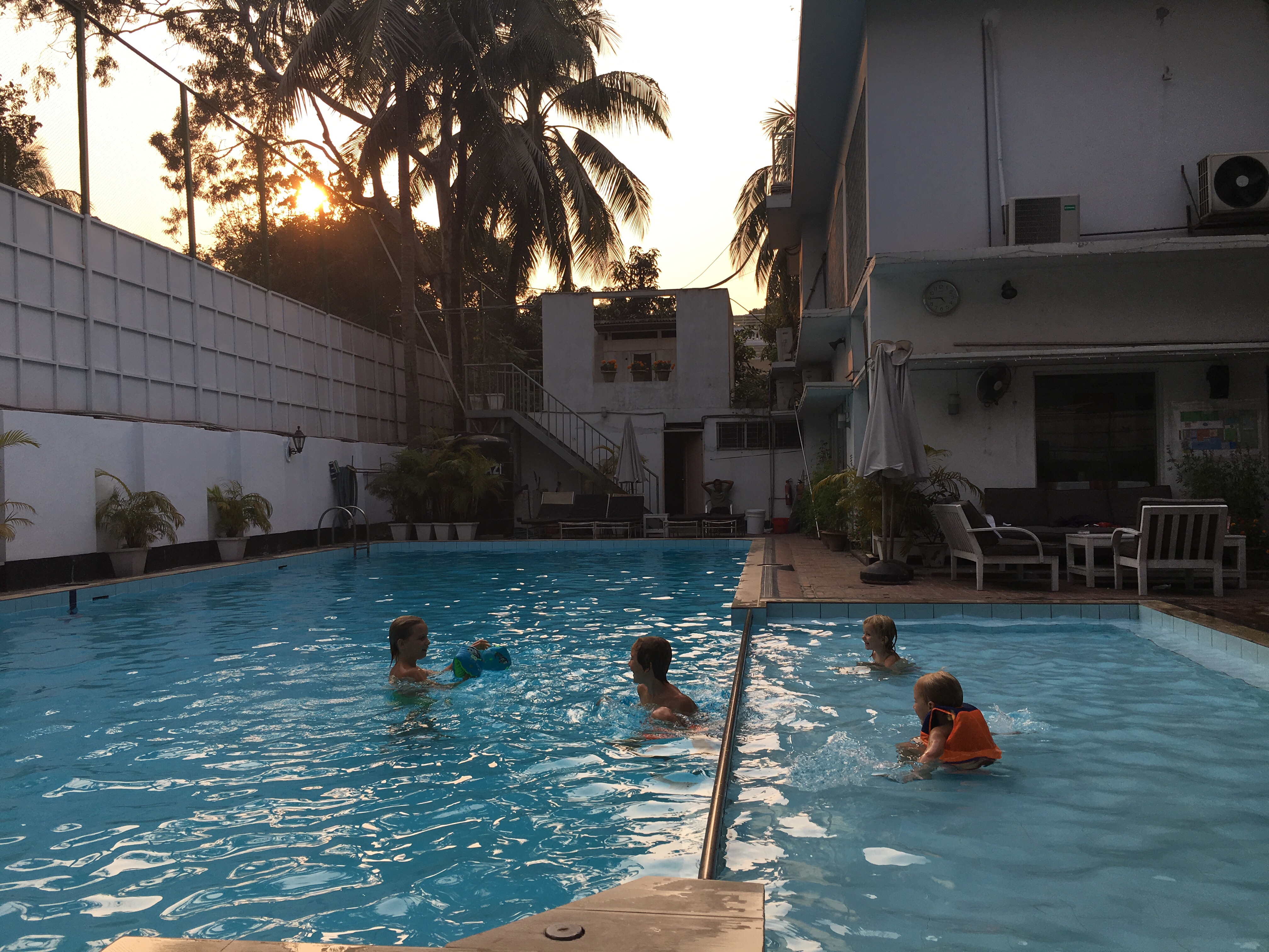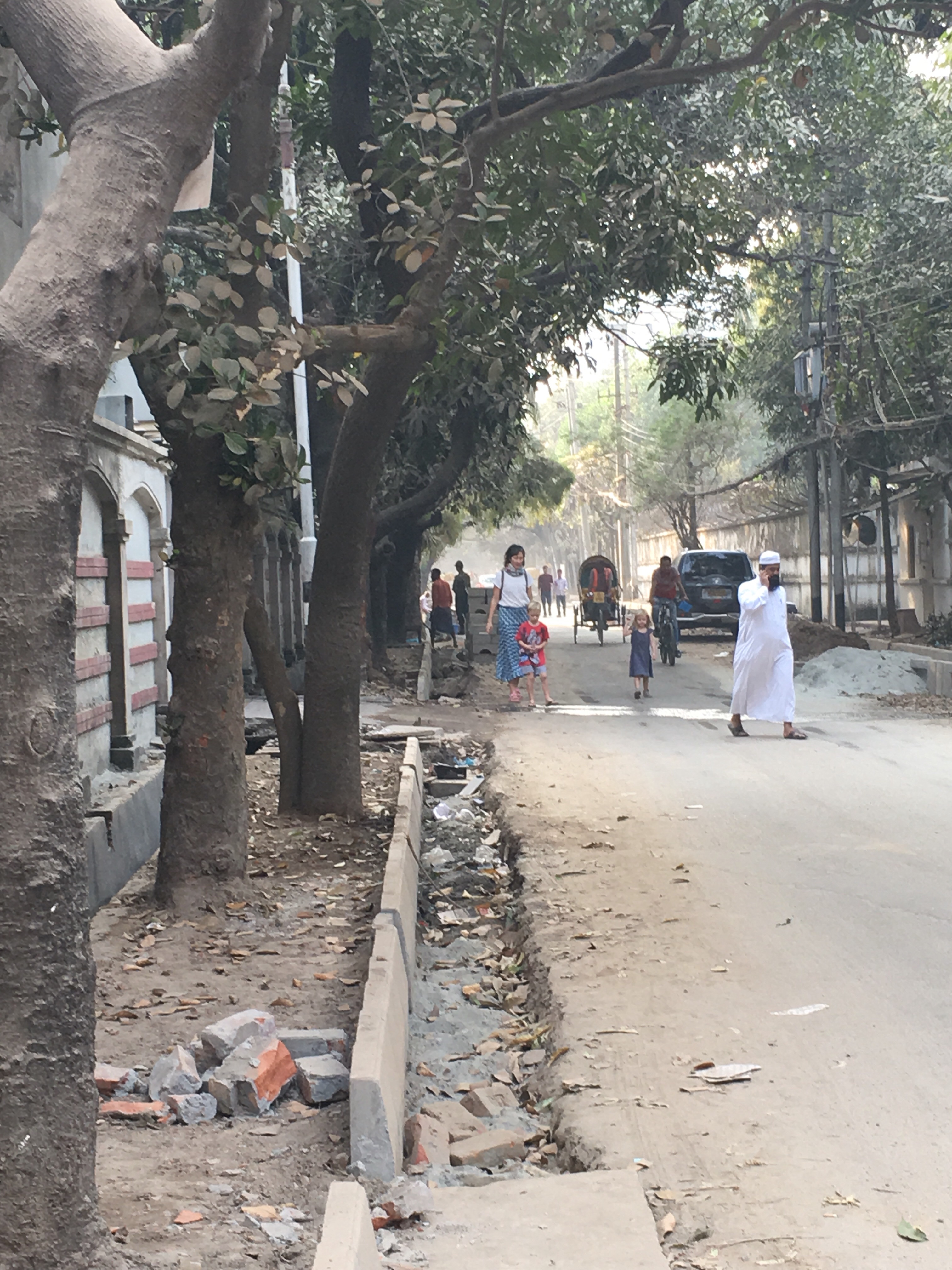 Und wir genießen die schöne Wohnung von Knut, besuchen den Nordic Club, wo es Wiener Schnitzel und Bier gibt in einem Land ohne Alkohol. Die Kinder springen Trampolin, es gibt viele blonde Kinder neben unseren und einen Swimmingpool. Wir lernen andere Deutsche kennen, die uns erklären dass Dhaka den Ruf hatte besonders familienfreundlich zu sein, dank guter Schulen und einer engen Community. Nach dem Anschlag auf die Holey-Bäckerei (dort kommen unser leckeren Croissants her)vor zwei Jahren zogen dann alle ab. Langsam kehren die Ausländer zurück. Aber die Straßensperren und Sicherheitskontrollen bleiben.