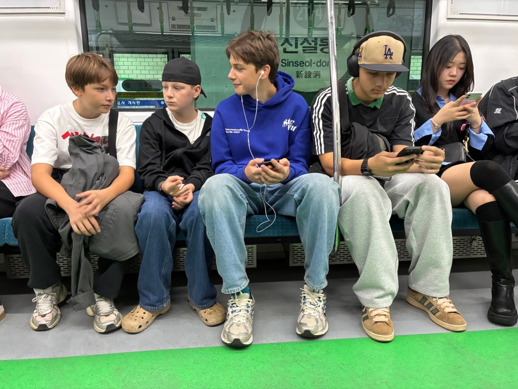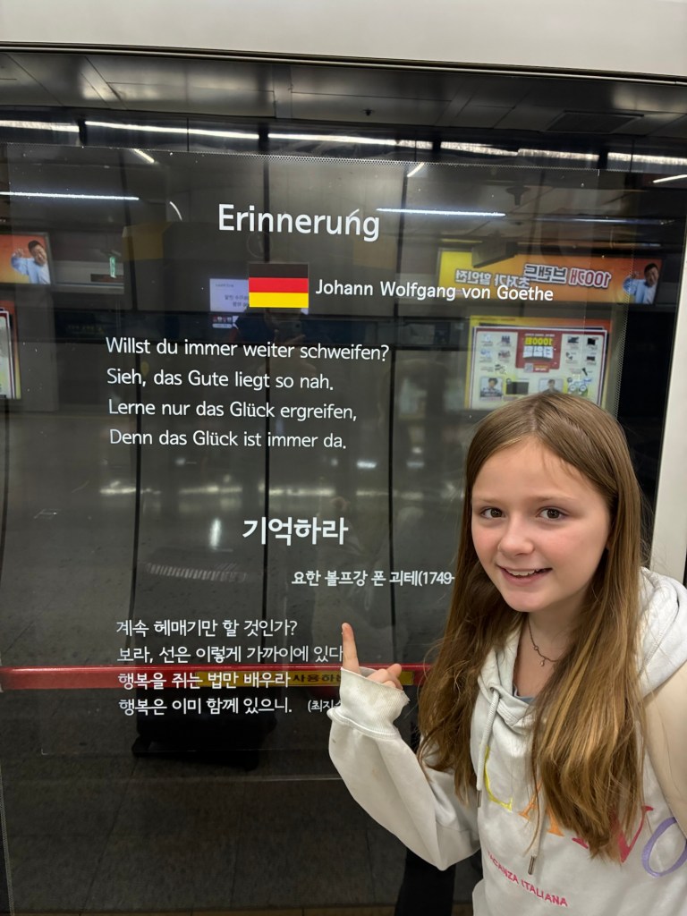 Alle Kinder sind im Lese-Fieber, und Velis hat passend zum Lotte Fieber auch schon die Leiden des jungen Werther von Goethe gelesen – ein lustiger Zufall. Schließlich stehen in diesem Land auch an den U-Bahn Türen Goethe, Zitate. Tara und Morpheus haben jetzt die Kindle App auf dem Handy, und lesen eifrig die immer längeren Bände von Harry Potter. Nadine ist mit dem „Five a.m. Club“ unterwegs, und ich lese mein All Time Favorite Anthony Robbins mit „Awaken the Giant within“ noch einmal. Und unterwegs beim Laufen üben wir das große Einmaleins. Als Fun fact – Südkorea hier ist eines der wenigen Länder in Asien, das die deutsche Schutzkontakt -Steckdose übernommen hat.