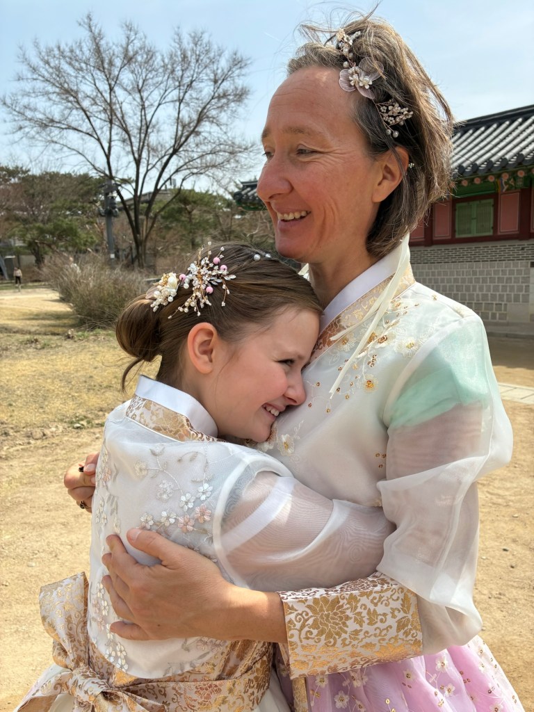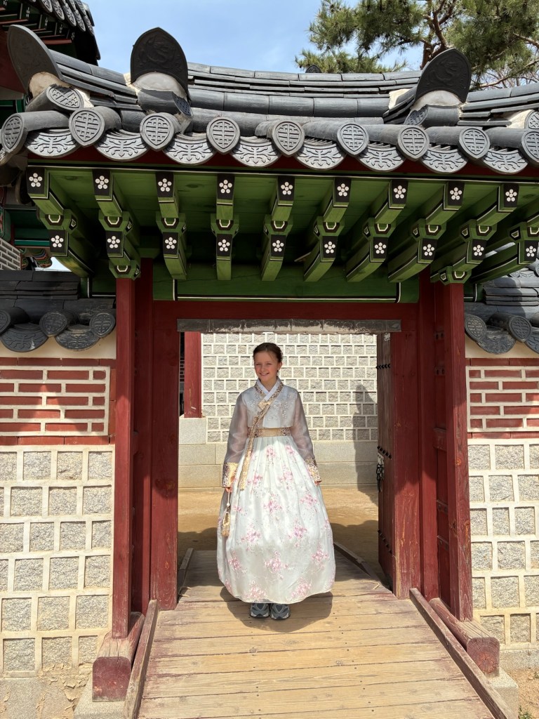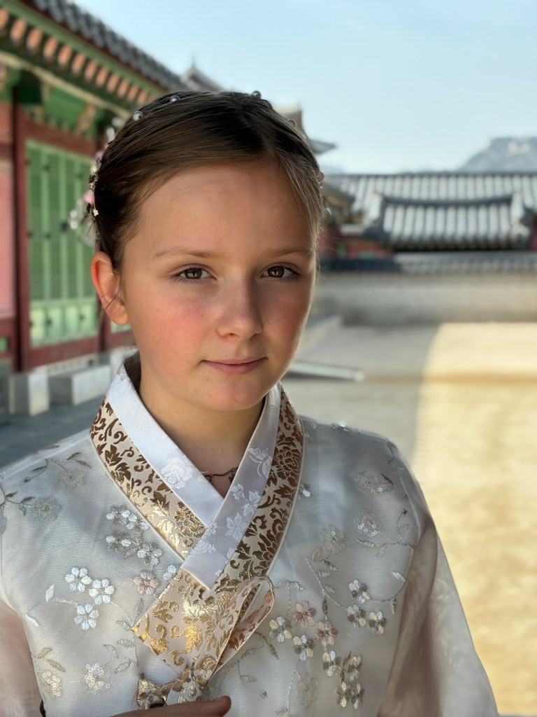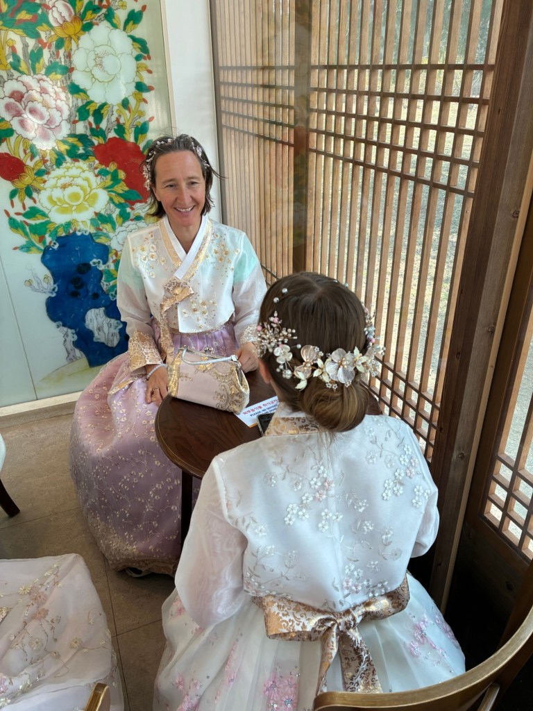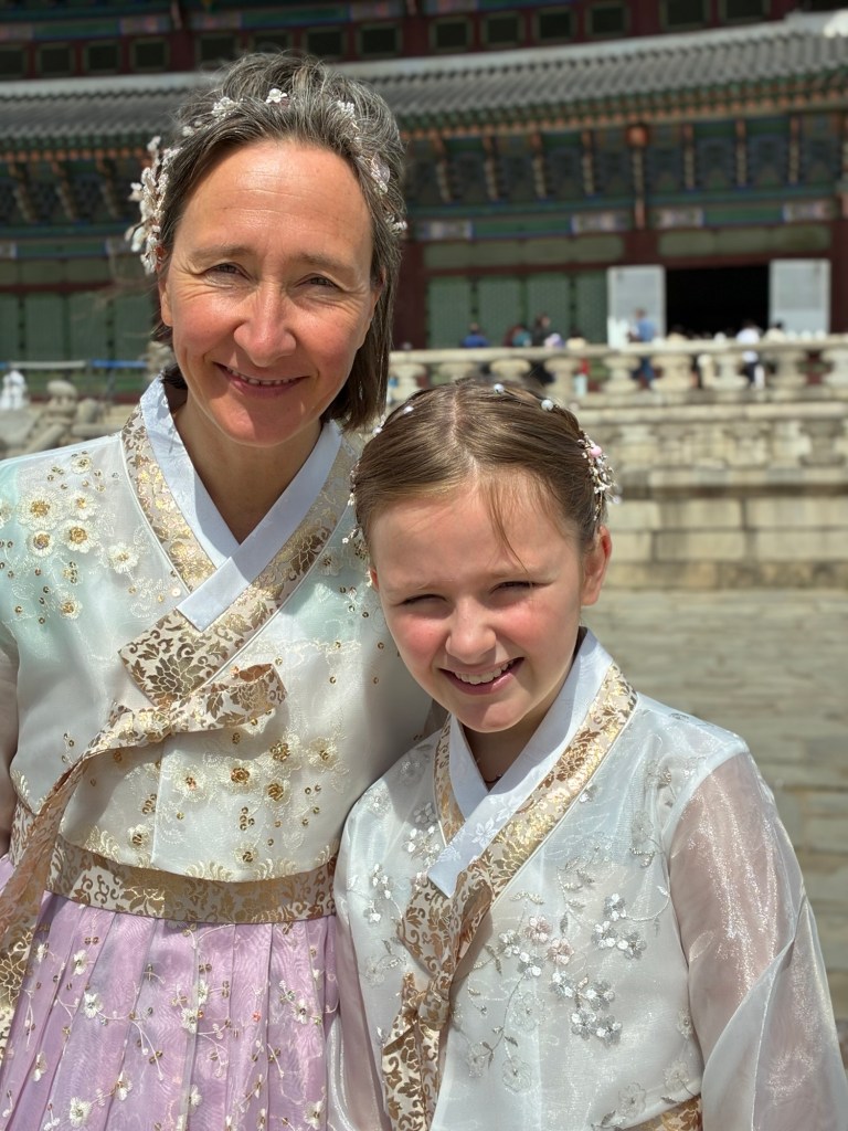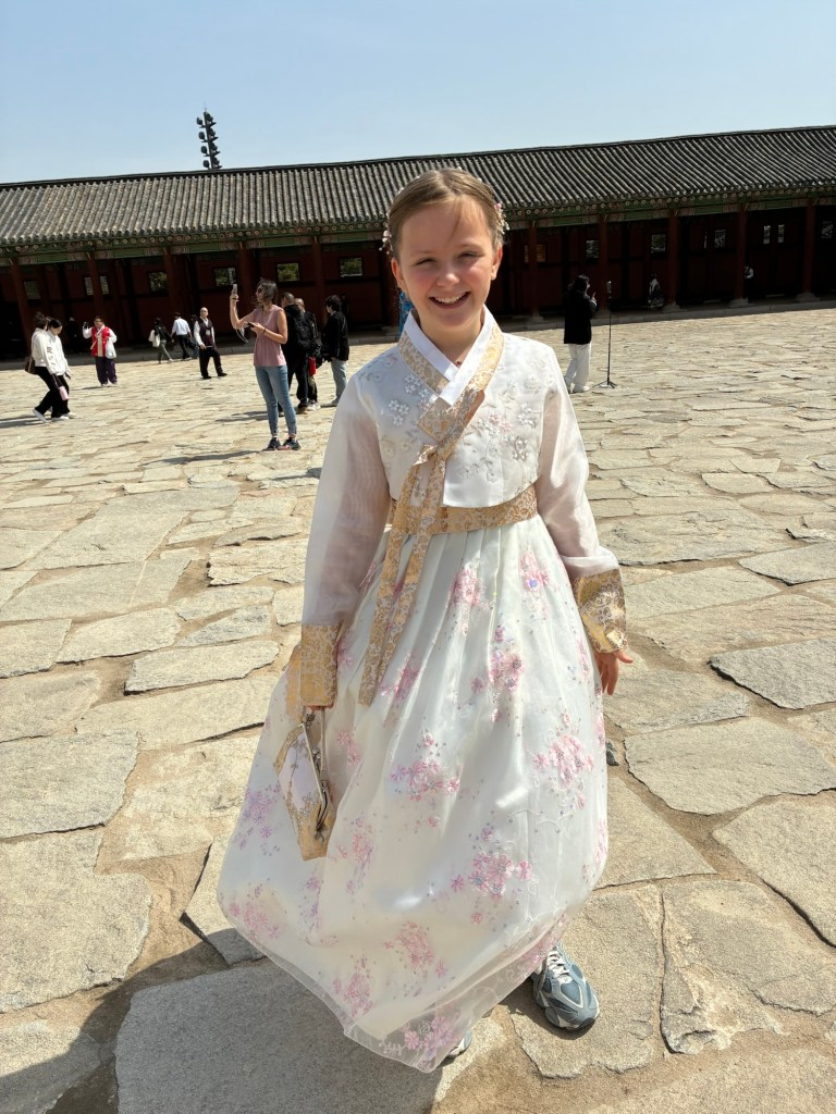 Auf unseren Handys und auf meiner Apple Watch bekommen wir immer wieder Alert-Meldungen vor den Waldbränden in Korea. Wir bekommen davon aber nichts mit. In der Innenstadt gibt es aber Demonstrationen, mit lauten Ansprachen und viel Polizei, angesichts der Regierungskrise. Aber es ist auch National Culture Day – alle Museen und der Königspalast können kostenlos besucht werden. Das führt zu einer großen Kostüm-Verkleidung- alle tragen tradtionelle Gewänder, auch viele Touristen.