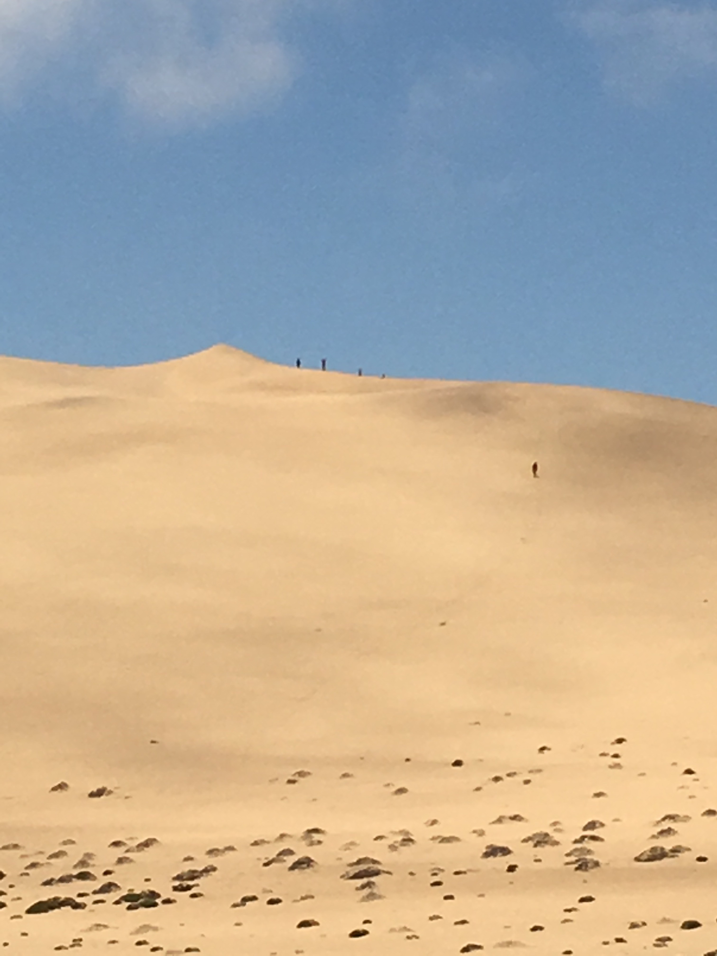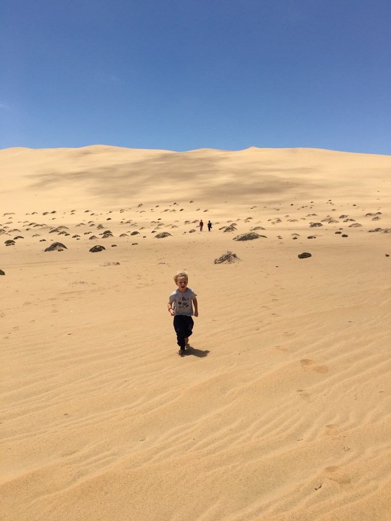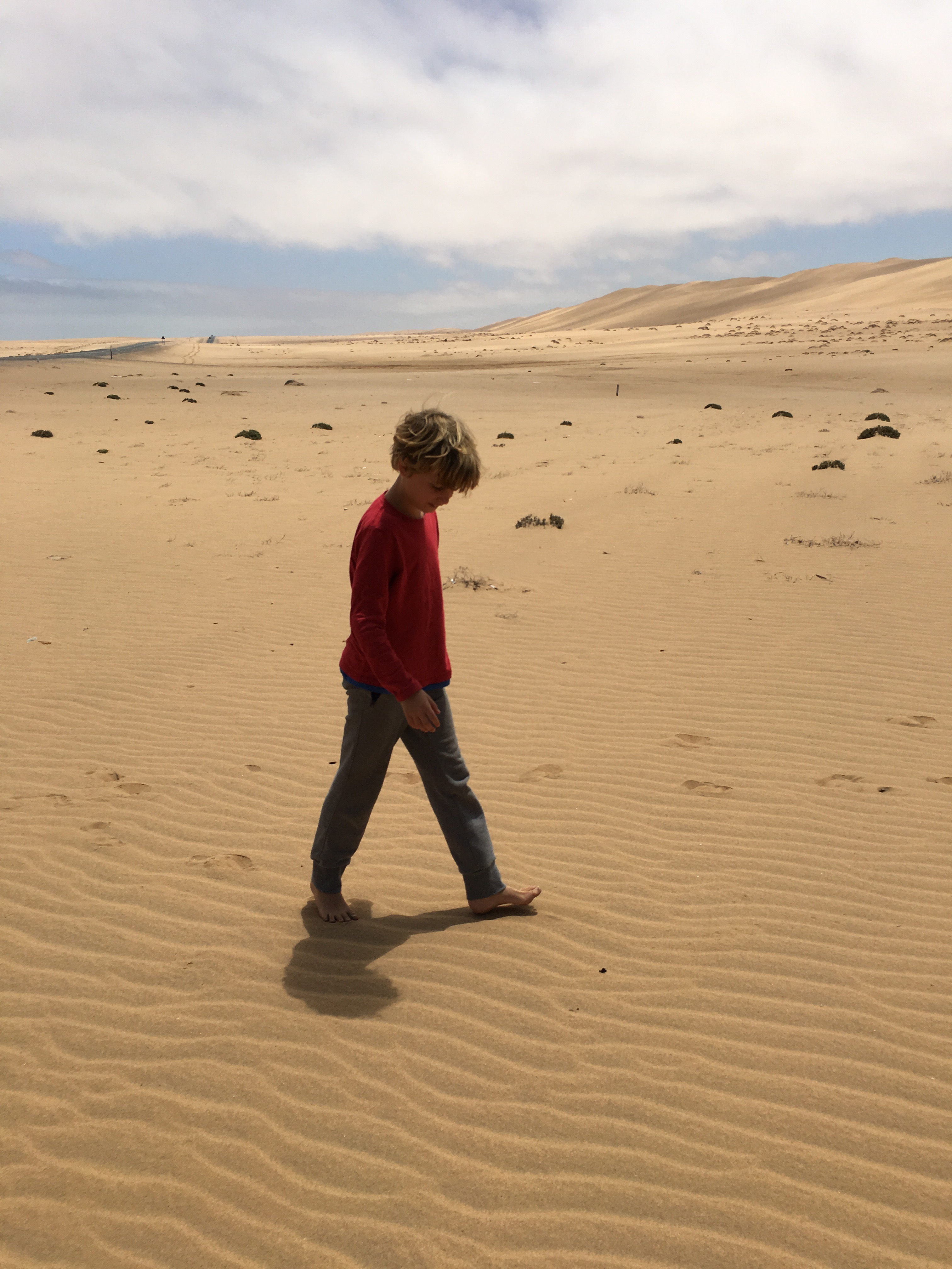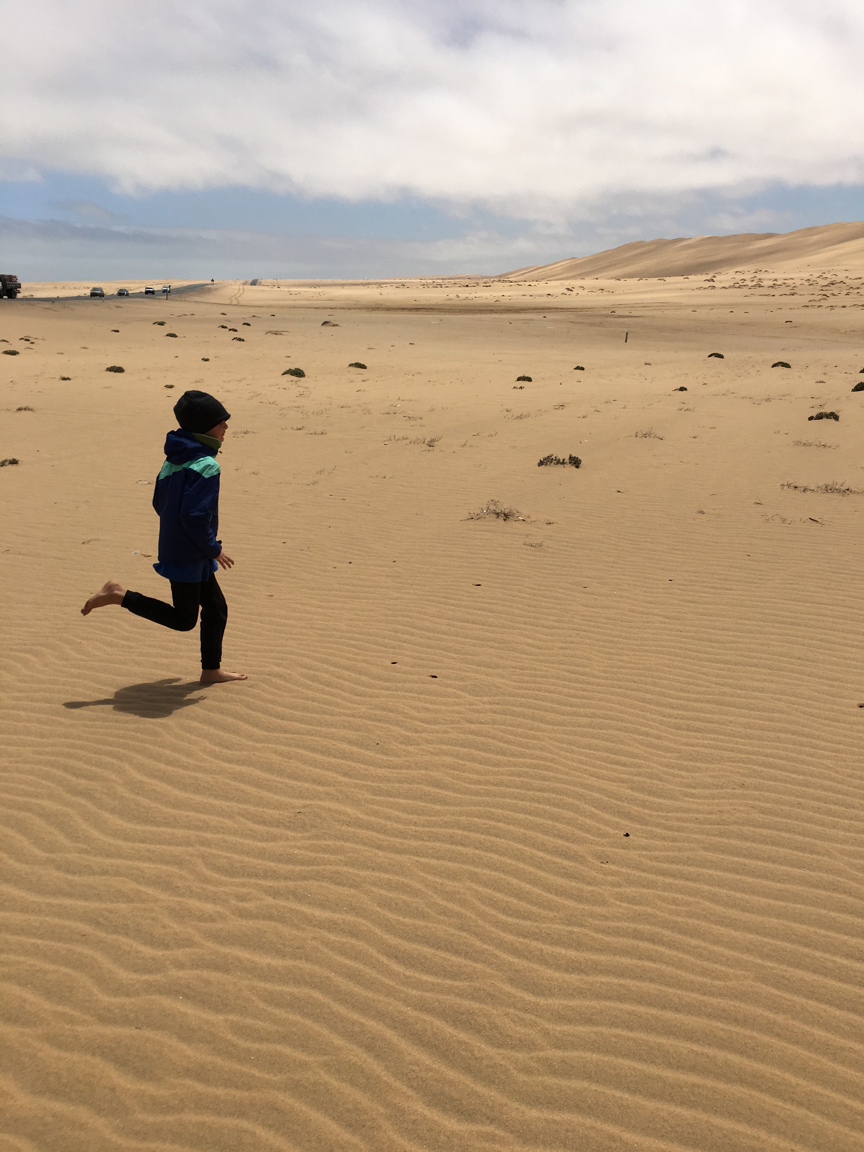 Die Kinder sind einfach toll. Wir fahren durch Dünenlandschaften, und halten kurz an. Richtung Meer sieht man schon die Schiffe des Hochseehafens Walvisbay. Doch die Kinder wollen die Düne besteigen, die man dort am Horizont aufragen sieht. Ich sage: Auf geht’s! Und schon sind sie alle unterwegs, während ich mit Nadine beim Auto bleiben. Bald sehe ich nur noch kleine Punkte, drei vorne, einer etwas hinterher. Und immer wieder die Rufe: „Tara!“, um die kleine Schwester anzuspornen. Nadine läuft hinterher, ich passe auf den Wagen auf. Schließlich, ich kann sie kaum mehr erkennen haben sie es geschafft. Ganz oben auf der Düne. Ein paar Wolken sind aufgezogen, aber sonst ist die Sonne wieder herausgekommen nach dem grauen Tag gestern und heute morgen.