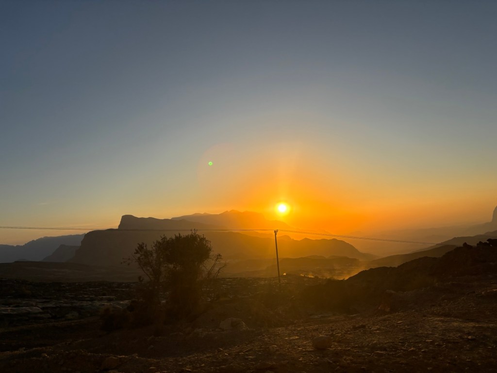 Um 6:30 Uhr klingelt der Wecker, wir haben Fladenbrot, Honigmelone, Gurken und Käse in den Rucksack gepackt, und frühstücken noch einmal kurz in einem alleinstehenden Café. Dort sehen wir schon den Wadi Ghul, auch Grand Canyon des Omans genannt.