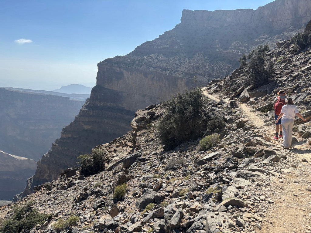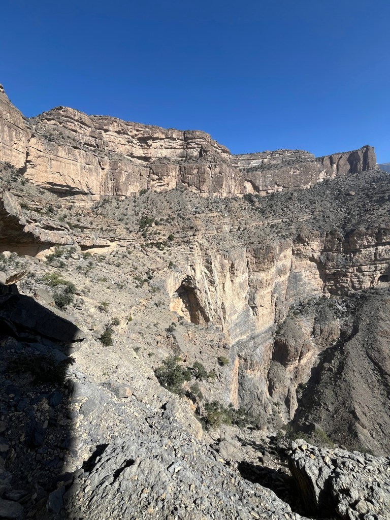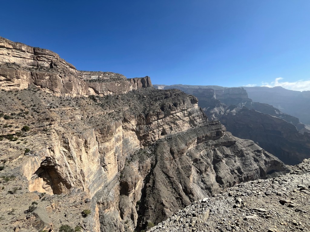 The alarm clock rings at 6:30 a.m. We have packed flatbread, honeydew melon, cucumber and cheese in our rucksacks and have a quick breakfast in a stand-alone café. There we can already see the Wadi Ghul, also known as the Grand Canyon of Oman.