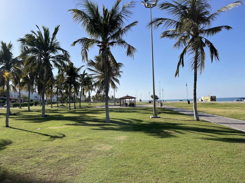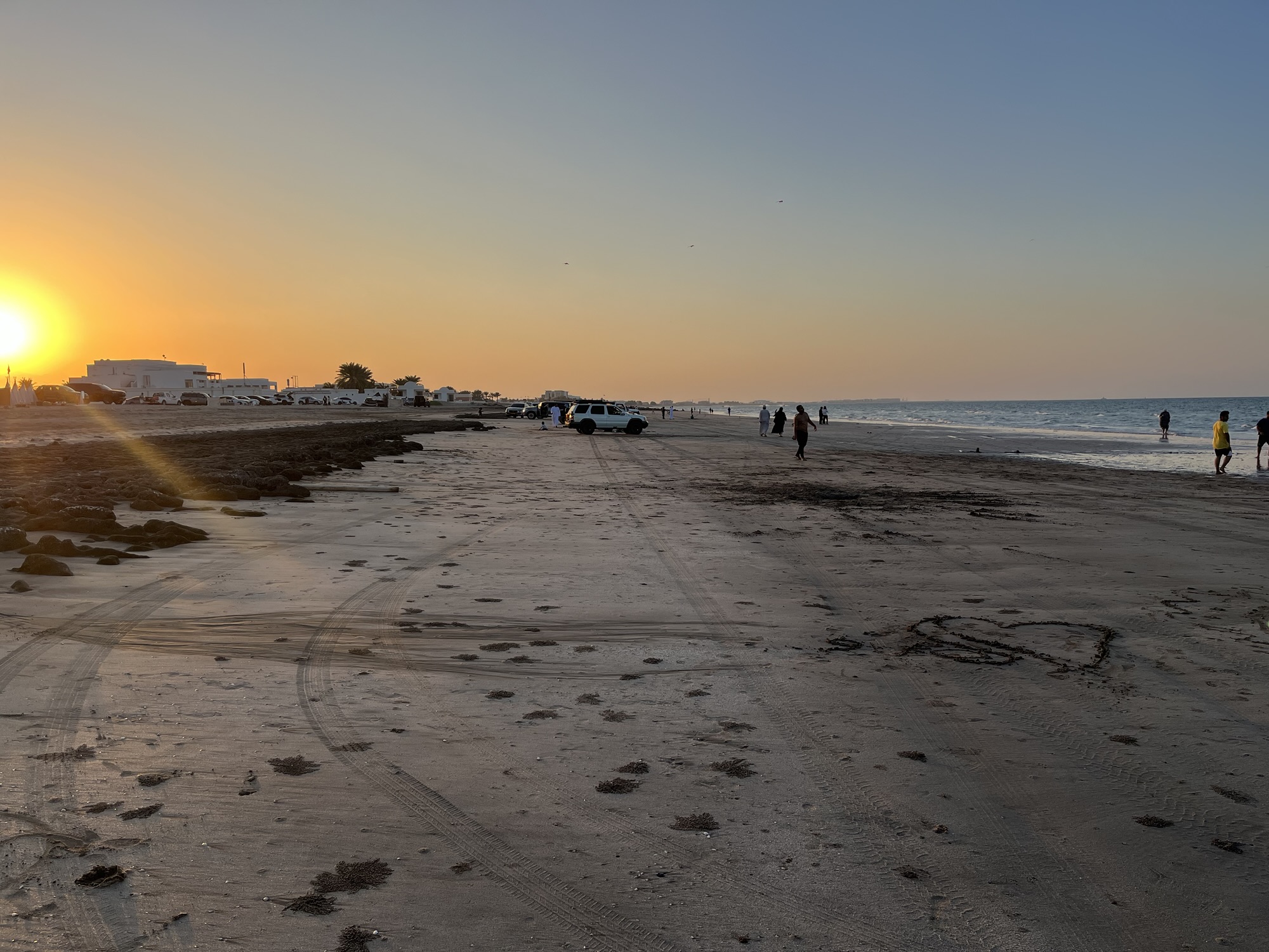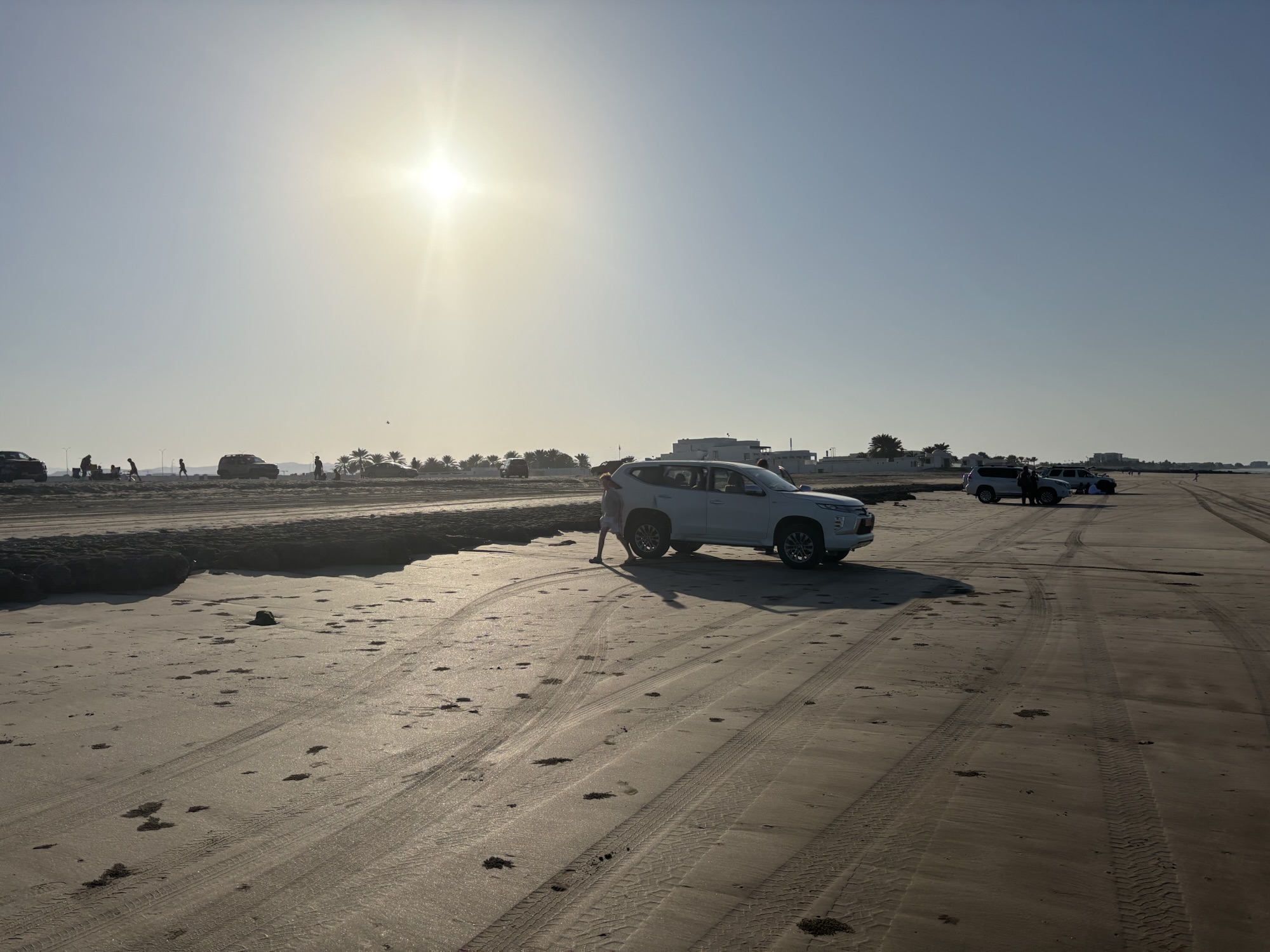 Im Oman fährt man mit dem Auto an den Strand, das haben wir gleich verstanden. Wir parkten dennoch brav auf dem Parkplatz, staunten über die hochmoderne Toilette und die Parkanlage mit Fitnessbereich, Fußballfeld und Beachvolleyball, alles frei zugänglich und fast menschenleer.