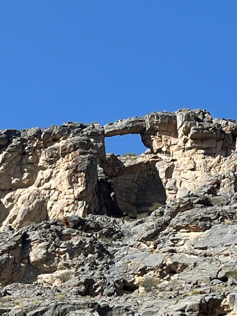 Nach zweieinhalb Kilometern machen wir die erste Rast. Bald danach sieht man einen großen Felsenbogen in der Wand, darüber liegt das Ziel, eine verlassene Siedlung in der Felswand an einer Quelle. Leider kickt Tara kurz vor dem Ziel mit dem Knöchel um und hat starke Schmerzen. Gut, dass wir so gut vorbereitet sind, kühles Gel, elastische Binde, Schmerztablette und Ablenkung mit Musik helfen, Tara rasch wieder auf die Beine zu kommen.