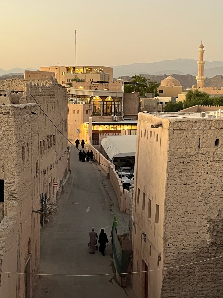 Nach etwas Sucherei mit hungrigen Kindern, die erstaunlich gut die Stimmung hielten, erreichten wir unser super schönes Haus und wurden freundlich mit Datteln und Kaffee empfangen – und zum Sonnenuntergang der Blick über die Stadt mit Blick auf die Berge, über Palmen und historische Gebäude hinweg, einfach traumhaft. Ein Schluck Rum aus der duty free Flasche half beim relaxen, bevor wir uns durch die Altstadt zu einem Original indischen Restaurant aufmachten. Dieses hätte exakt so auch in Goa ausgesehen, und bei Dahl Chicken Masala und vegetable Kuruma, mit Fladenbrot und dazu Lemon, Mint Juice kam schon Vorfreude auf Indien auf. Aber man muss sagen dieses Land hat wirklich etwas zu bieten und Oman hat zurecht erkannt, dass Tourismus Zukunft ist.