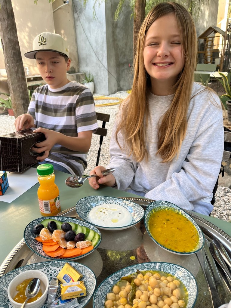 Back we went to the supermarket (quickly covering our knees, everyone looked for a scarf or a pair of trousers), we found everything we needed for spaghetti with tomato sauce and salad. Cooking at home, some normality like at home. Everyone enjoyed it. So you can use night flights and still enjoy the day – but now the children have fallen into bed tired and soon we will too.