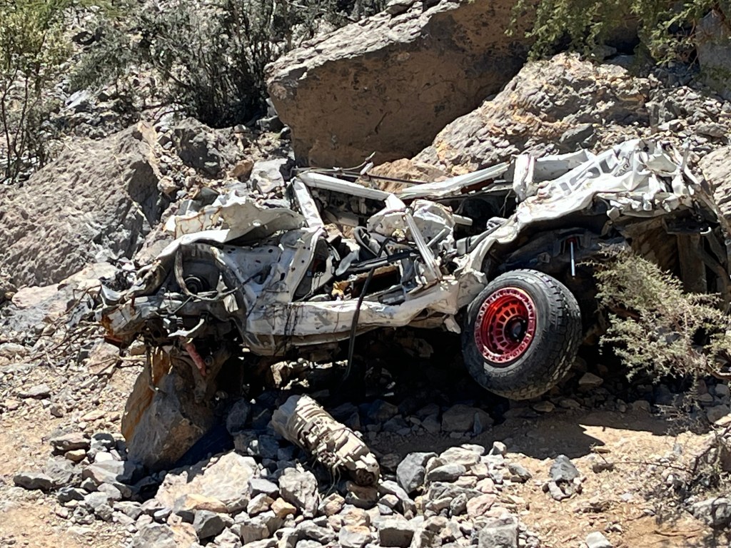 About 50 m below us, we see the gruesome wreckage of an off-road vehicle that has obviously crashed from the cliff above. It’s just a tangle – no wonder after a fall of a few hundred meters.