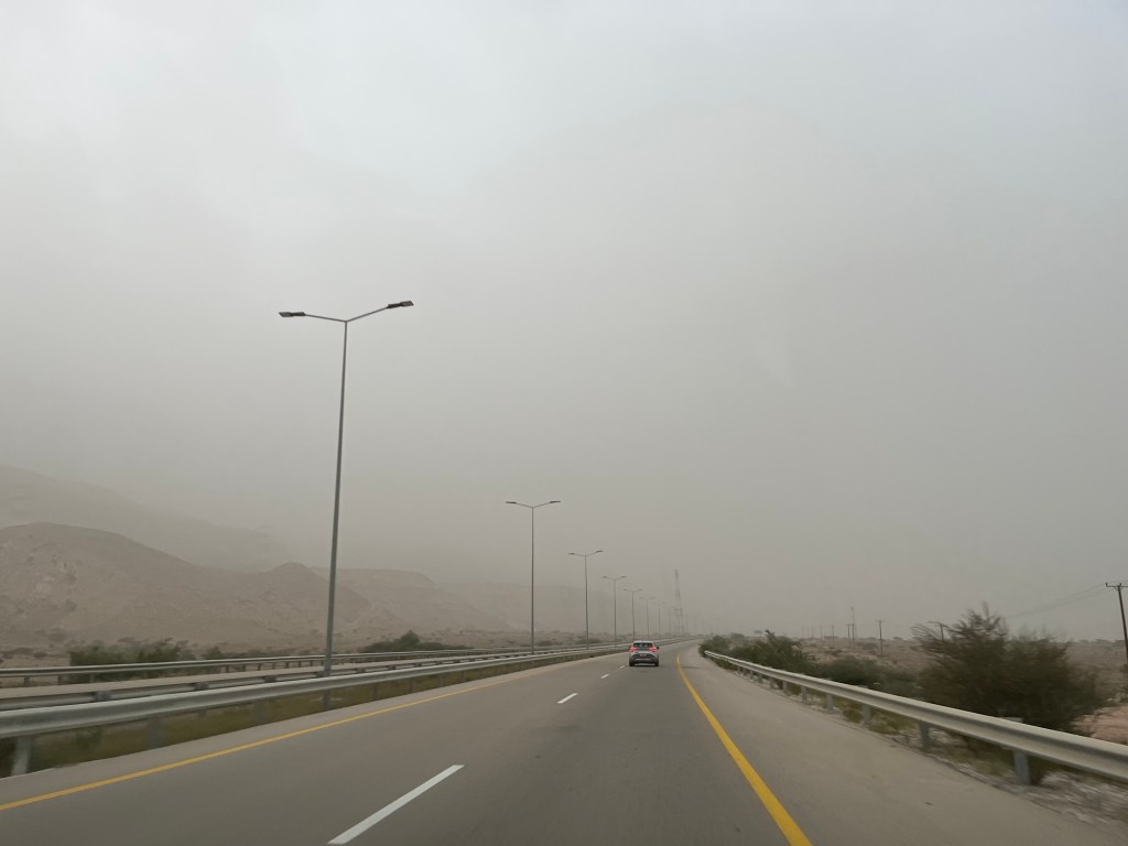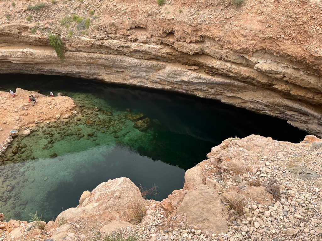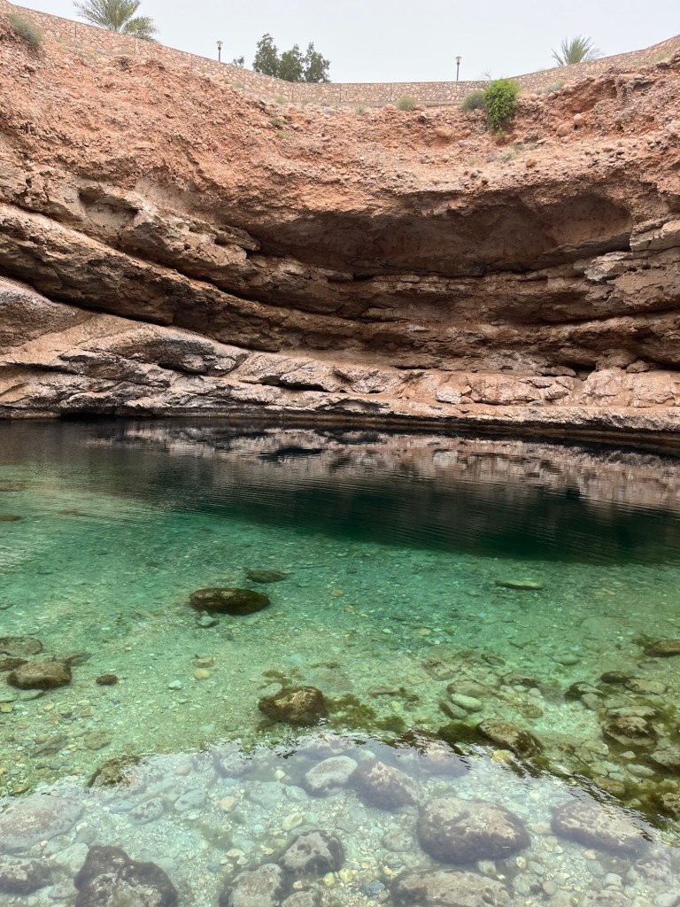 Tag 12- An unserem letzten Tag im Oman war es windig und bedeckt, die Sonne kam nicht heraus. Fast dachte man es würde gleich zu regnen anfangen, und der Wind ließ den Himmel vom Sand gelb erscheinen. Eine in den Fels in Serpentinen aufwärts gehauenen nagelneue Autobahn führte und Richtung Osten aus der Stadt heraus, in Richtung Sur. An der Tankstelle verkaufte ein Laden Campingausrüstung- an den langen Stränden sieht man Zelte und Canper stehen. Ich bekomme Lust beim nächsten Mal die Wüste und den Süden zu erkunden und zu campen. Wir haben ja nur die Umgebung von Maskat dieses mal erkunden können. Die beiden Ziele zum Abschluss waren nur 90 Minuten Fahrt entfernt, aber haben uns alle in Erstaunen und Begeisterung versetzt. Im Bimmah Sinkhole kann man im Salzwasser in einem Felsenloch schwimmen, und wird dabei von kleinen Fischen sanft angeknabbert.