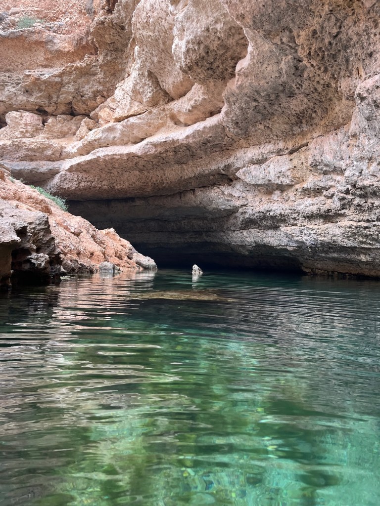 Um in den Wadi Shab zu kommen, beginnt die Reise mit einer kurzen Bootstour unter der Autobahnbrücke. In einer grandiosen Landschaft geht es dann das Flussbett aufwärts eine Stunde bis die Schlucht enger wird und der Fluss die einzige Möglichkeit ist weiter zu kommen- teils schwimmend, teils kletternd oder über Kieselsteine und glitschigen Felsen laufend. Schließlich muss man durch eine Felsenspalte knapp kopfbreit schwimmen und kommt in eine Höhle mit Wasserfall. Meine orange Schwimmboje half Tara, und hielt mein Handy, Geldbeutel und Autoschlüssel trocken- zumindest bis kurz vor Schluss- vielleicht hätte ich doch in der Höhle nicht versuchen sollen, das IPhone herauszuholen. Doch zum Glück ist ja die Technik wasserfest.