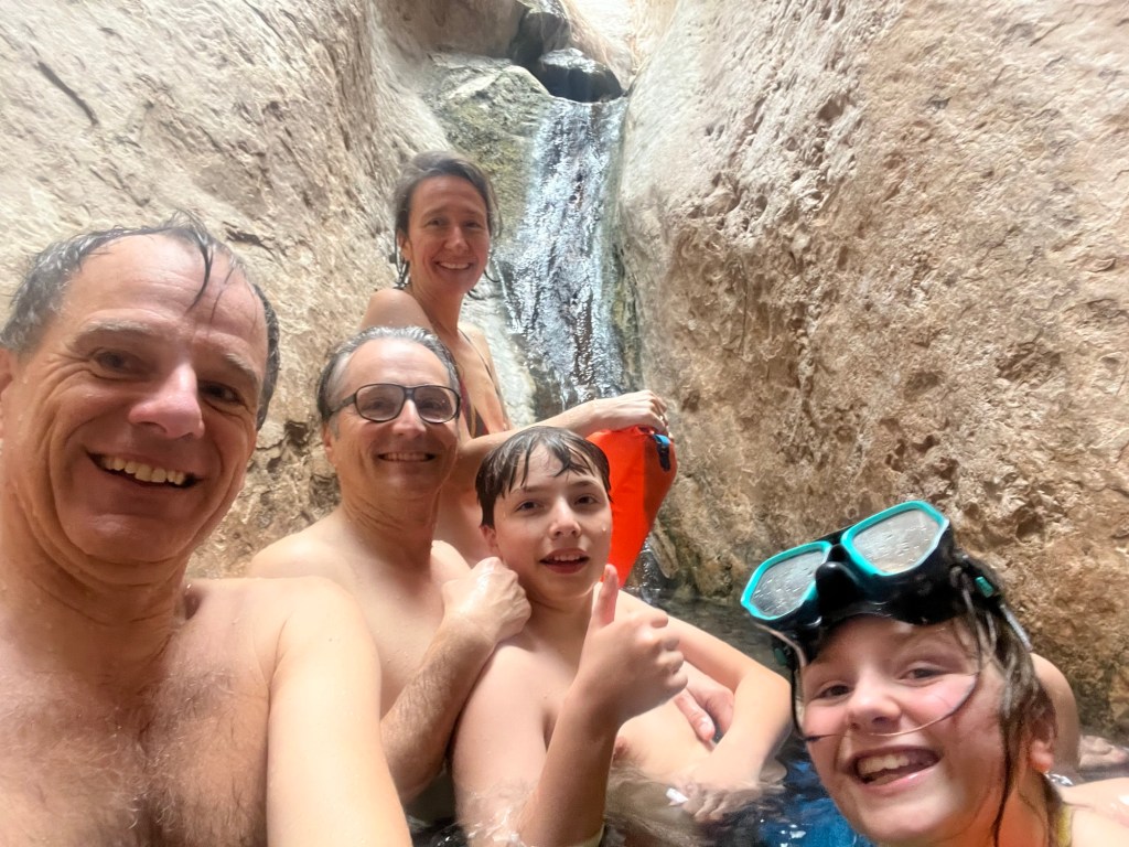 To get to Wadi Shab, the journey begins with a short boat trip under the highway bridge. We then walk up the riverbed in a magnificent landscape for an hour until the gorge narrows and the river is the only way to continue – partly swimming, partly climbing or walking over pebbles and slippery rocks. Eventually, you have to swim through a crevice almost as wide as your head and enter a cave with a waterfall. My orange buoy helped Tara and kept my cell phone, wallet and car keys dry – at least until just before the end – maybe I shouldn’t have tried to get my iPhone out in the cave. But luckily, technology is waterproof.