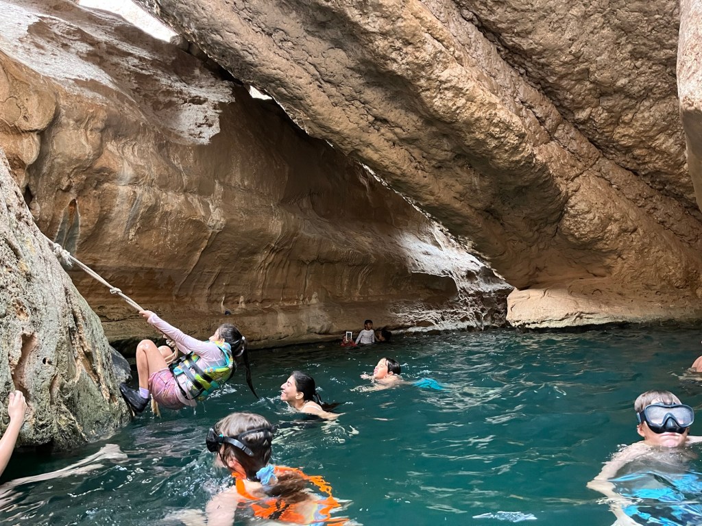 Day 11 – On our last day in Oman, it was windy and overcast and the sun never came out. We almost thought it was going to start raining, and the wind made the sky appear yellow from the sand. A brand new highway carved into the rock in serpentines led east out of the city towards Sur. At the petrol station, a store sold camping equipment – you can see tents and campers on the long beaches. It makes me want to explore the desert and the south and go camping next time. We were only able to explore the area around Muscat this time. The two final destinations were only a 90-minute drive away, but left us all amazed and thrilled. In the Bimmah Sinkhole, you can swim in salt water in a rock hole and be gently nibbled on by small fish.