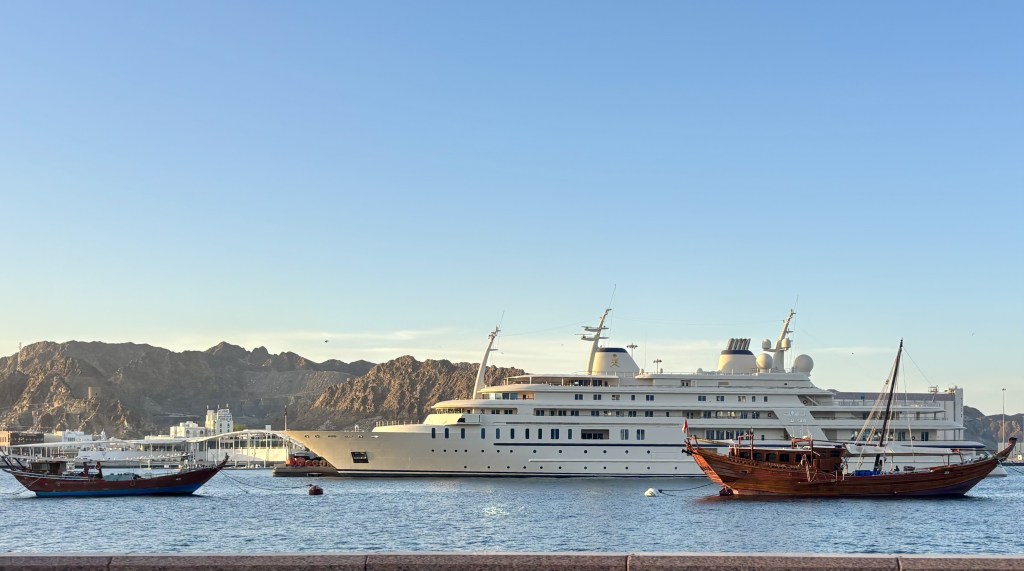 Oman ist ein Auto-Land, das wird uns schnell klar. Vieles erinnert an die USA; an Los Angeles oder Las Vegas. Draußen die heiße Wüste, ewig viel Platz und riesige Parkplätze, dahinter Shopping-Malls, Hotels oder Hafenanlagen. Wir passieren einen Kreuzfahrt-Riesen und die Yacht des Sultans, die Al Said. Nummer 7 in der Welt der Mega-Yachten, mit 155 Meter Länge, ein Prachtexemplar der Lürssen-Werft aus Bremen.