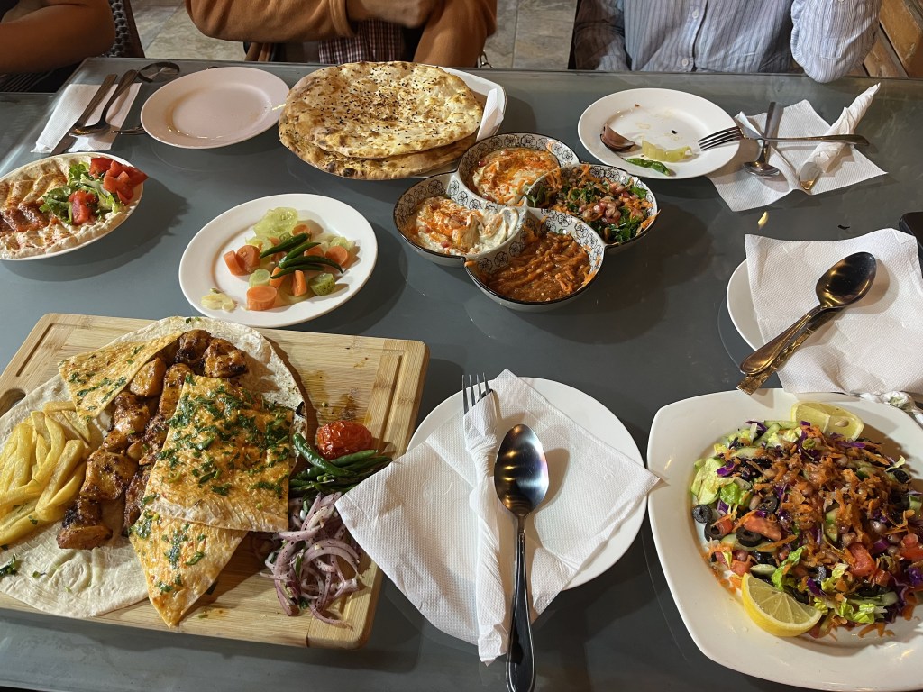 Auf der Fahrt zurück an der Küste überrascht uns eine grüne Sumpflandschaft, die einen starken Kontrast zu den felsigen Bergen des Hintergrunds bildet. Dort wollen wir morgen hinfahren. Und um die Badesachen auszupacken ist es schon zu spät, so begnügen wir uns mit einem Spaziergang zum Sonnenuntergang. Als wir eine Street-Food-Ecke bei Google Maps ausfindig gemacht haben, stellen wir fest, dass dies eher amerikanische Größenordnungen mit Parkplätzen und Restaurants sind, die Essen aus allen Ländern kredenzen – wir sind bei einem türkischen Restaurant gelandet und erstaunt, was wir für 40 Euro zu siebt alles geboten bekommen, von den frisch gepressten Fruchtsäften in XL über die Salate, Vorspeisen und Grillgerichte. Alle sind begeistert, es ist günstiger und mindestens so lecker wie in Istanbul.