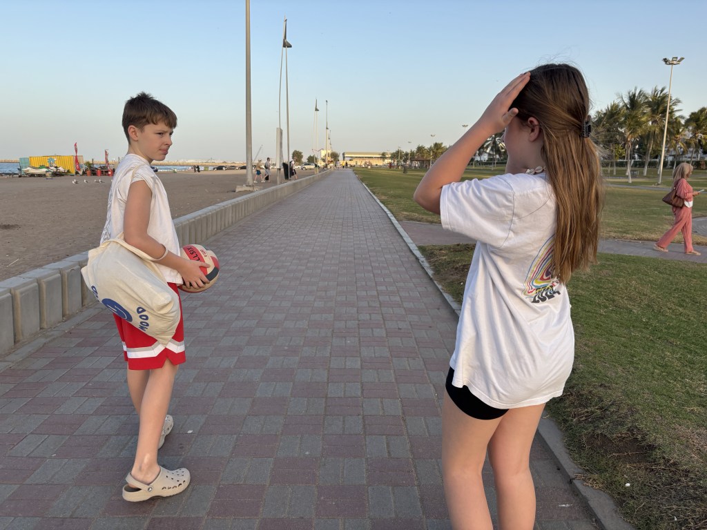 Nach unserem morgendlichen Sportprogramm gibt es Frühstück. Tara liest die fünf Grundregeln des Islam vor – und danach wird Mathe gemacht. Wir versuchen neue Routinen einzuführen. Gegen 13:00 Uhr dann Reste von Gestern Essen und einen Salat, den wir in unserer kleinen Küche im Apartment bereiten, danach geht es los zum National Museum of Oman. Wir sind erstaunt, dass es 20 km weg ist, und ich verfahre mich in dem Labyrinth der Schnellstraßen gleich mehrfach.