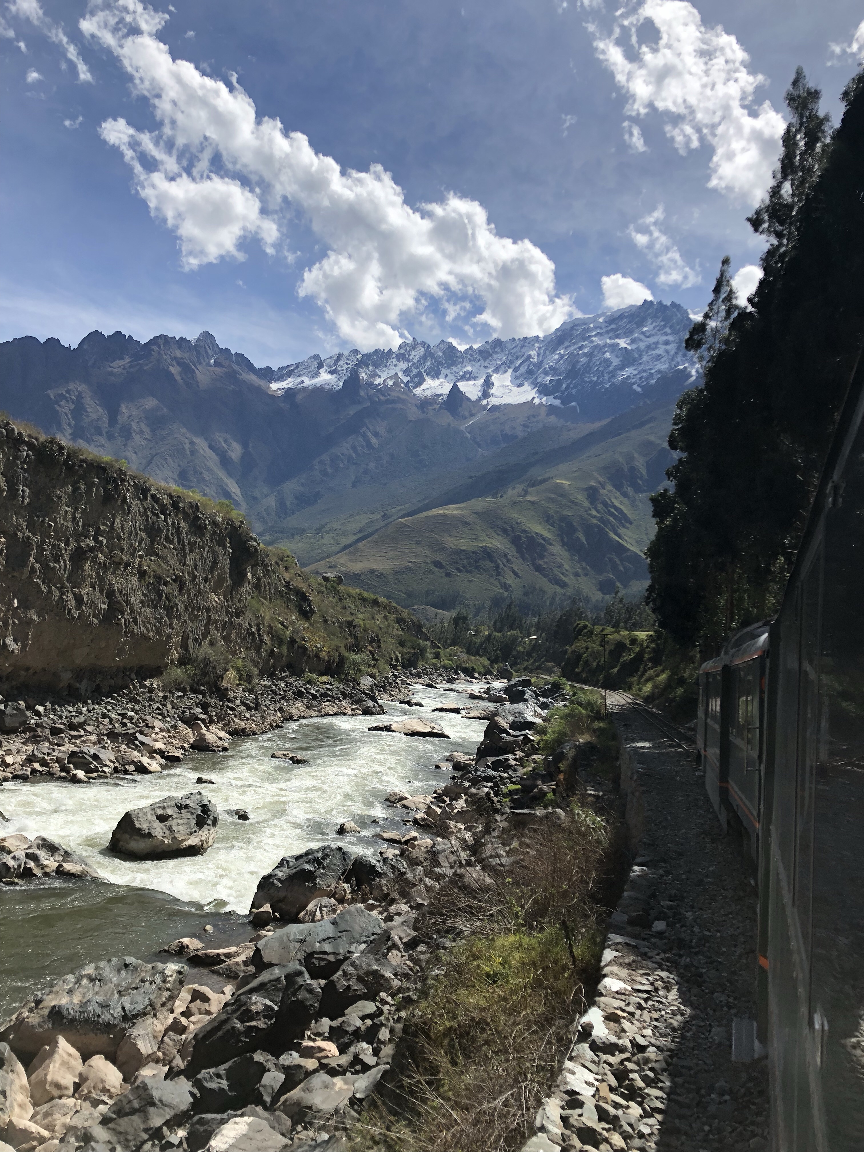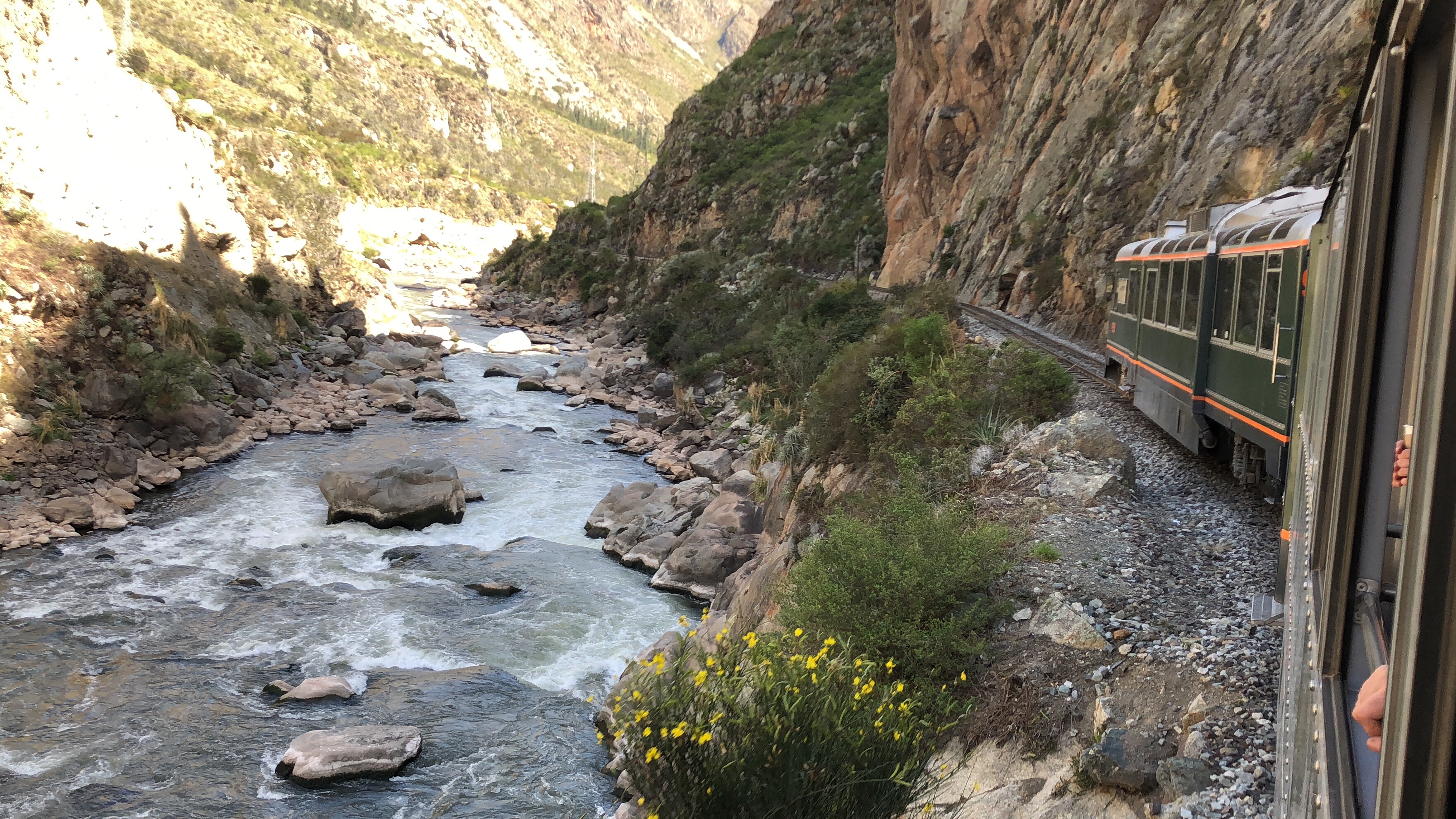 Die Fahrt ist eine moderne Fahrt in die Vergangenheit. Wir reisen zu einer der wenigen Orte auf der Welt, die nur zu Fuß oder per Zug zu erreichen sind. Die über 100 Jahre alte Schmalspurbahn schmiegt sich harmonisch in immer engeren Kurven den Flusslauf des Urubamba 1000 Höhenmeter Meter hinab bis Aguas Calientes.