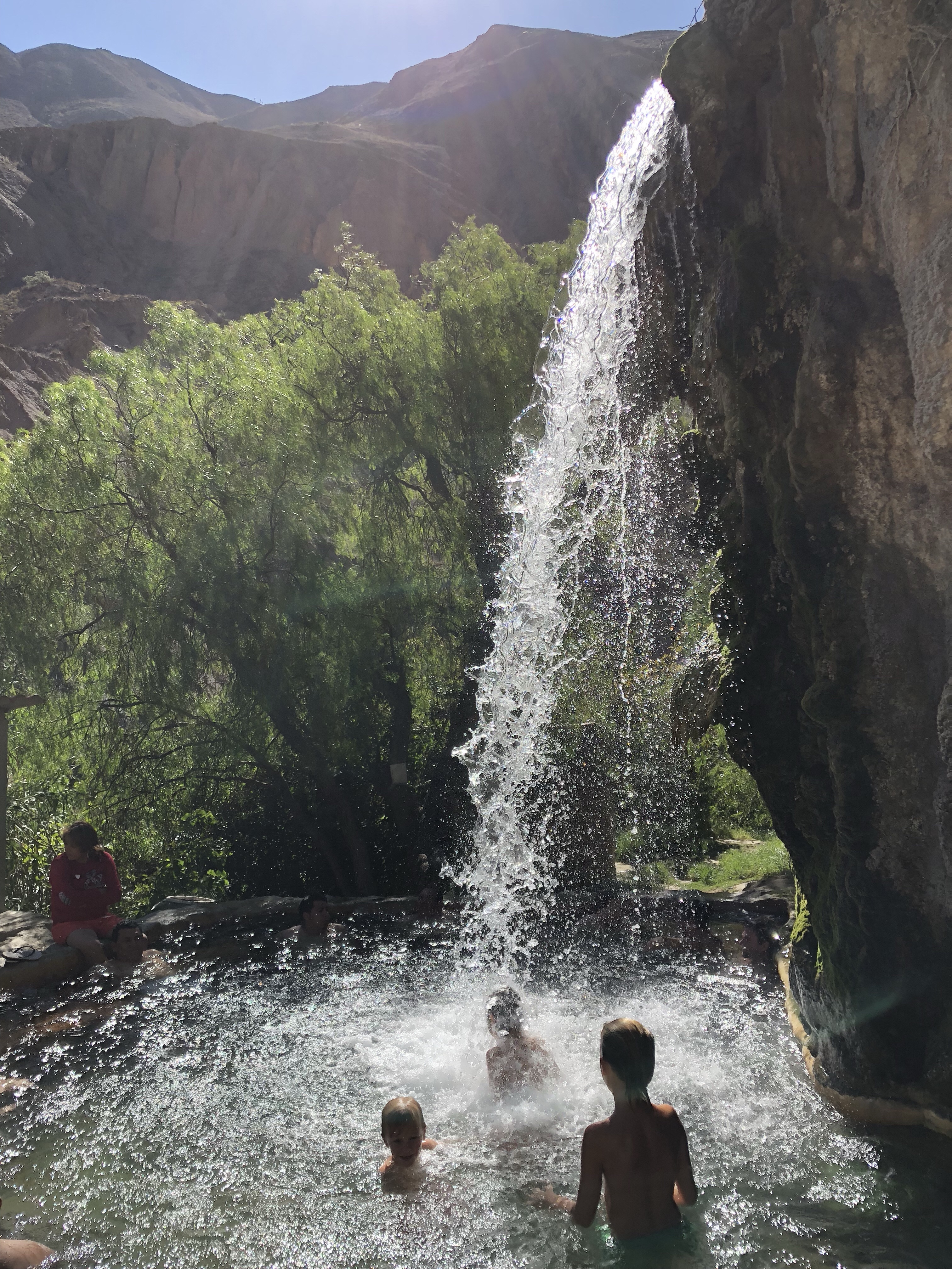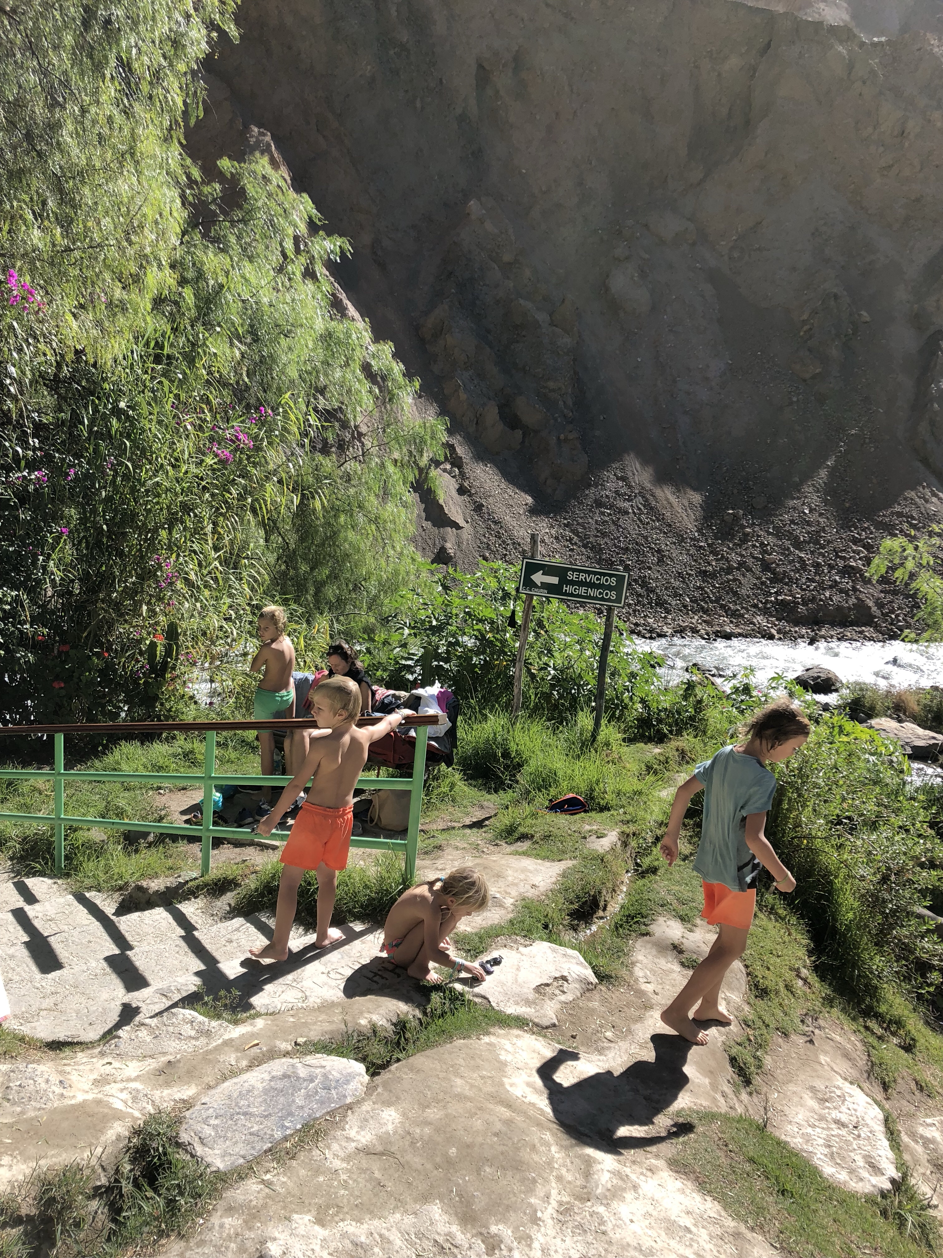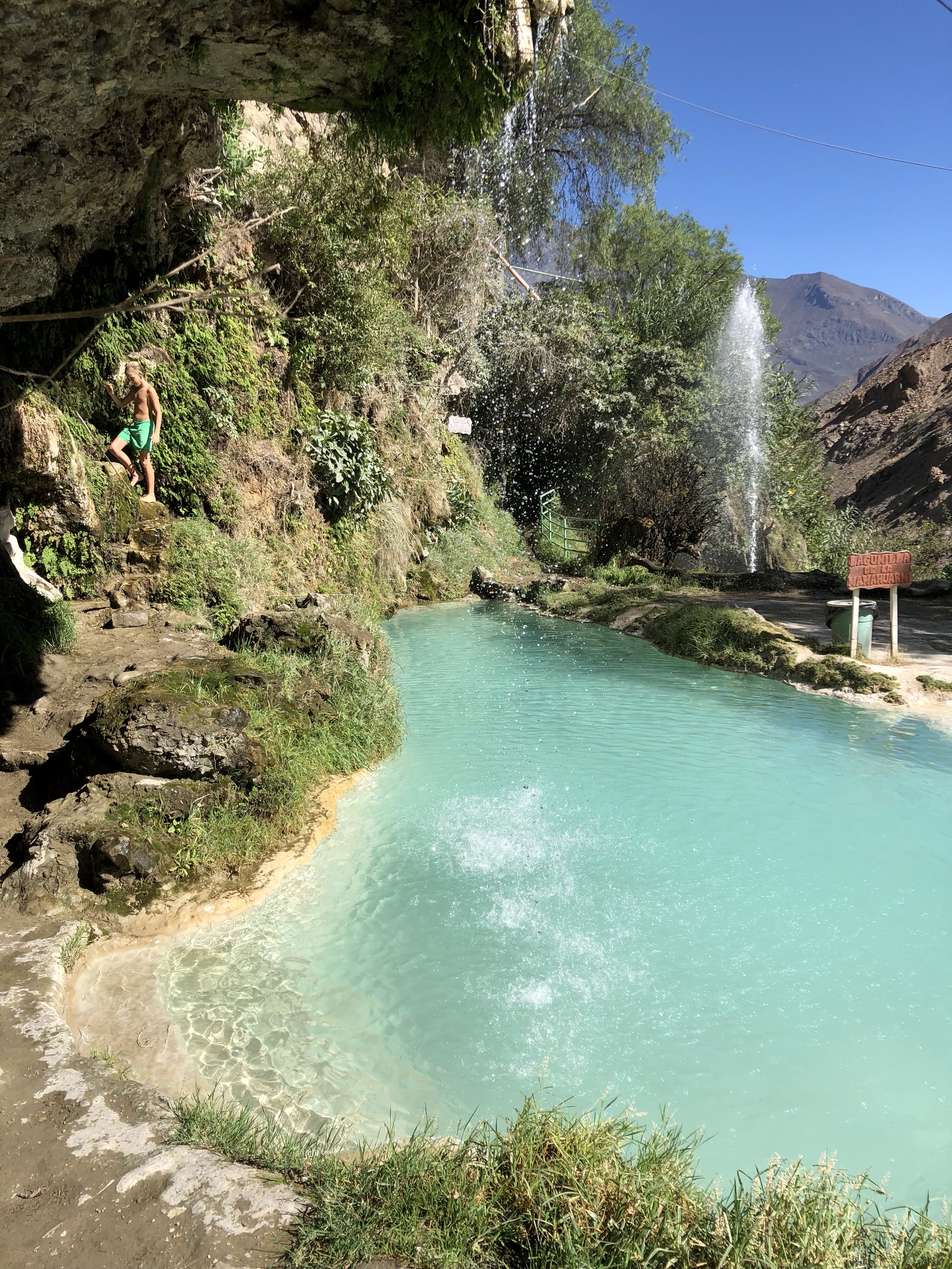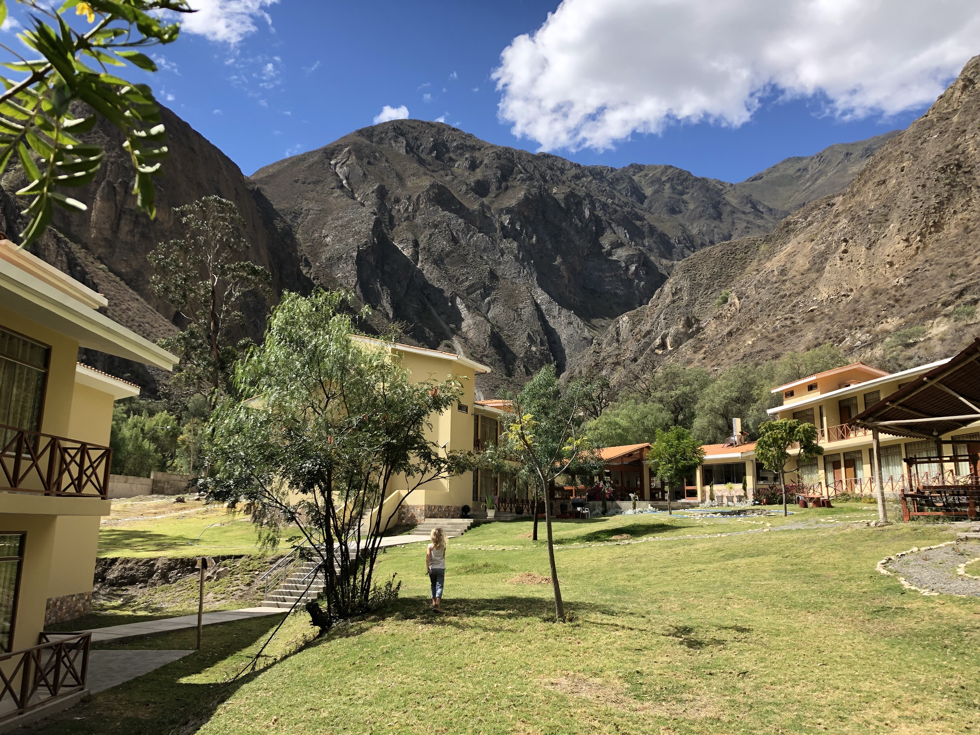 Dann noch mal eine Durstrecke, als es immer heißer wird und lauter Geröllabschnitte kommen. Doch schließlich erreichen wir einen verstaubten Bergort, wo eine kleine unbefestigte Straße rechts hinauf zu unserem Hotel führt. Es ist eine schöne, großzügige Anlage. Die Kinder spielen mit dem Wasserschlauch, es gibt grünen Rasen und ich lege mich in die Sonne und schlafe kurz ein. Ein Alpaca grast, rund um uns herum Bergwände, die Sonne scheint, es ist grün. Herrlich. Und so brechen wir nach kurzer Rast (die dünne Höhenluft, obwohl nur 2300 Meter macht einen müde) in den Ort auf. Das Bad ist urtümlich und das Wasser im Bad das noch offen hat nur 25-30 Grad warm, aber alle sind happy. Das Essen im Restaurant schmeckt, und es ist gar nicht so kalt wie befürchtet.