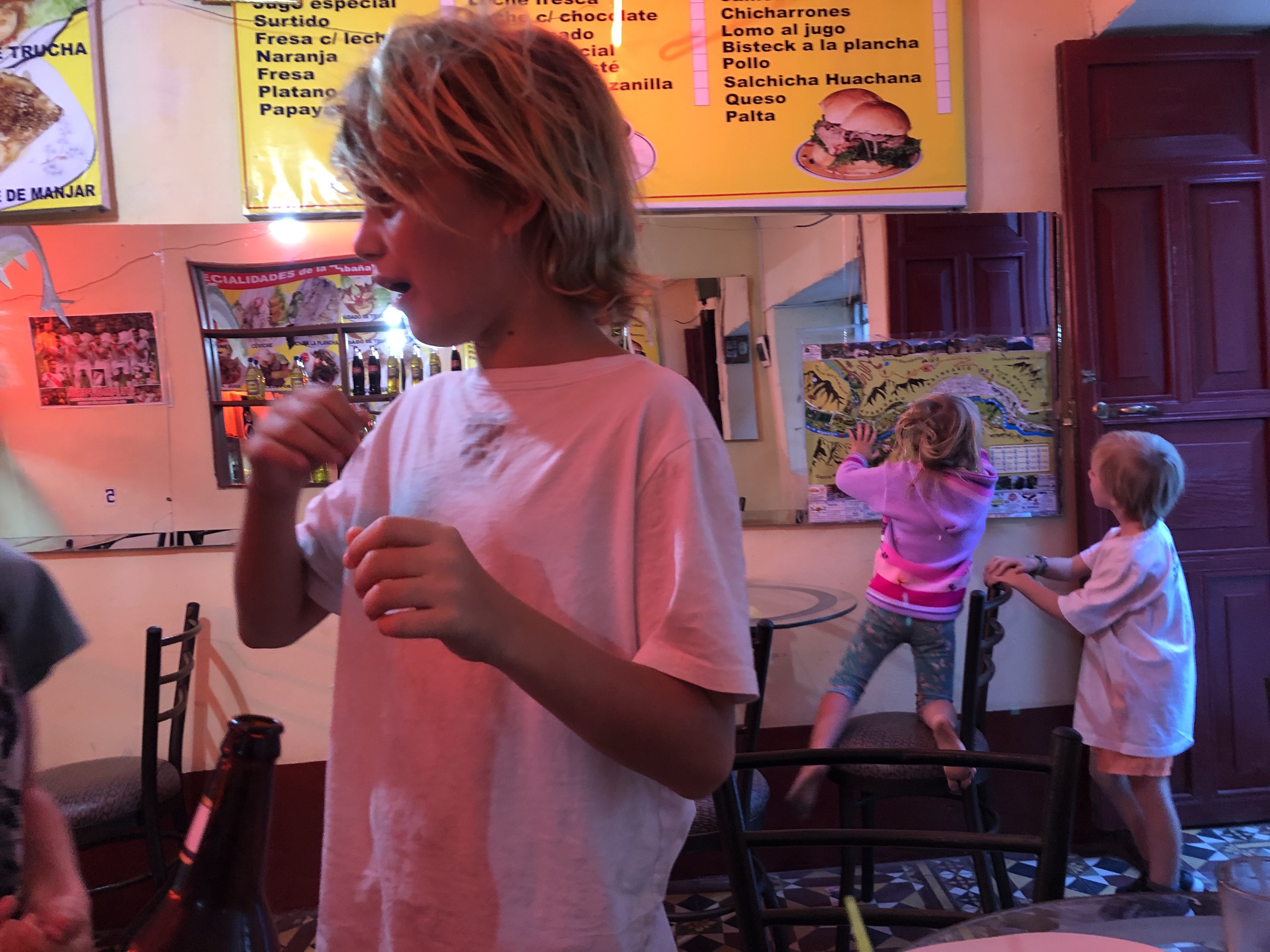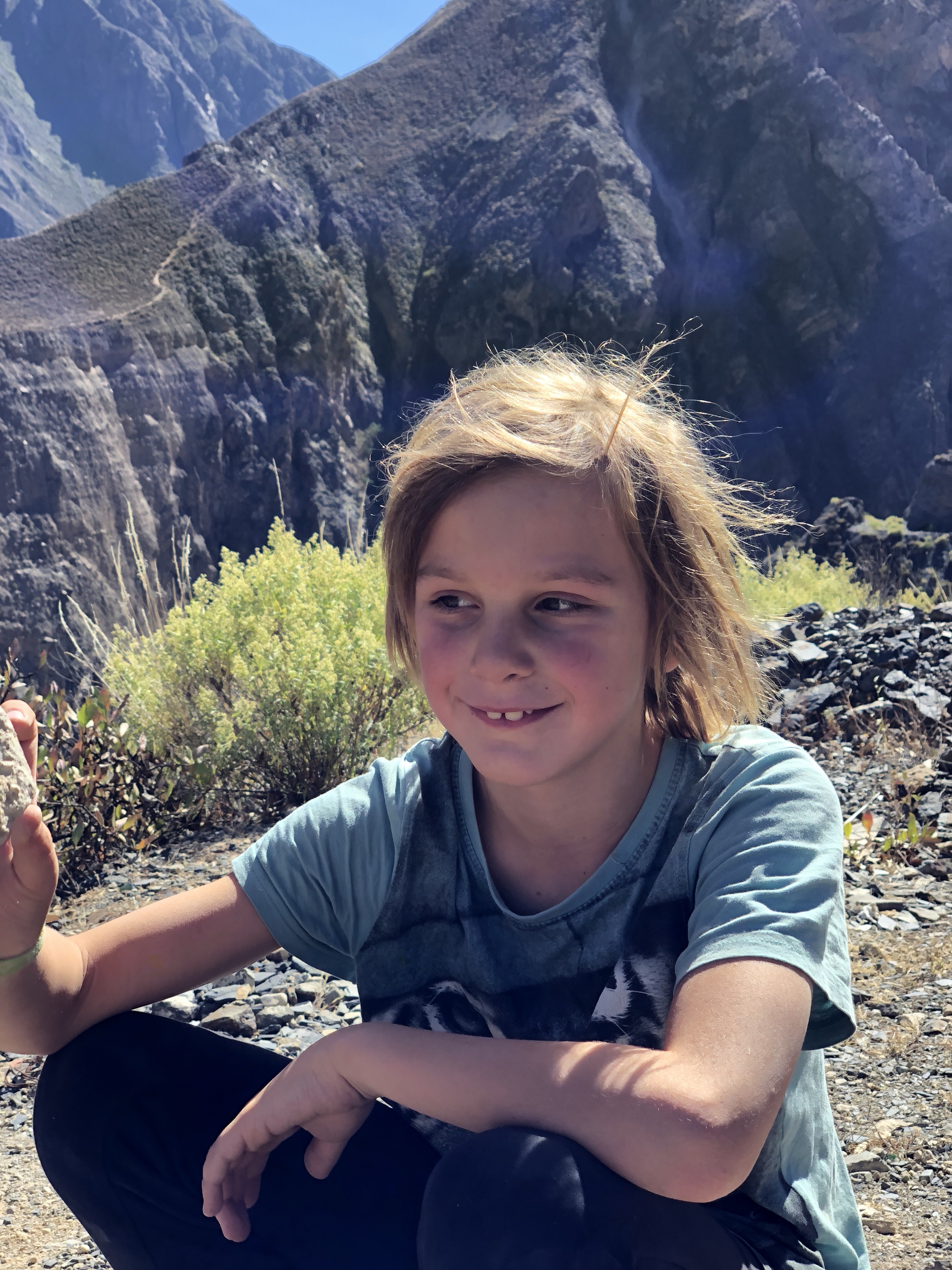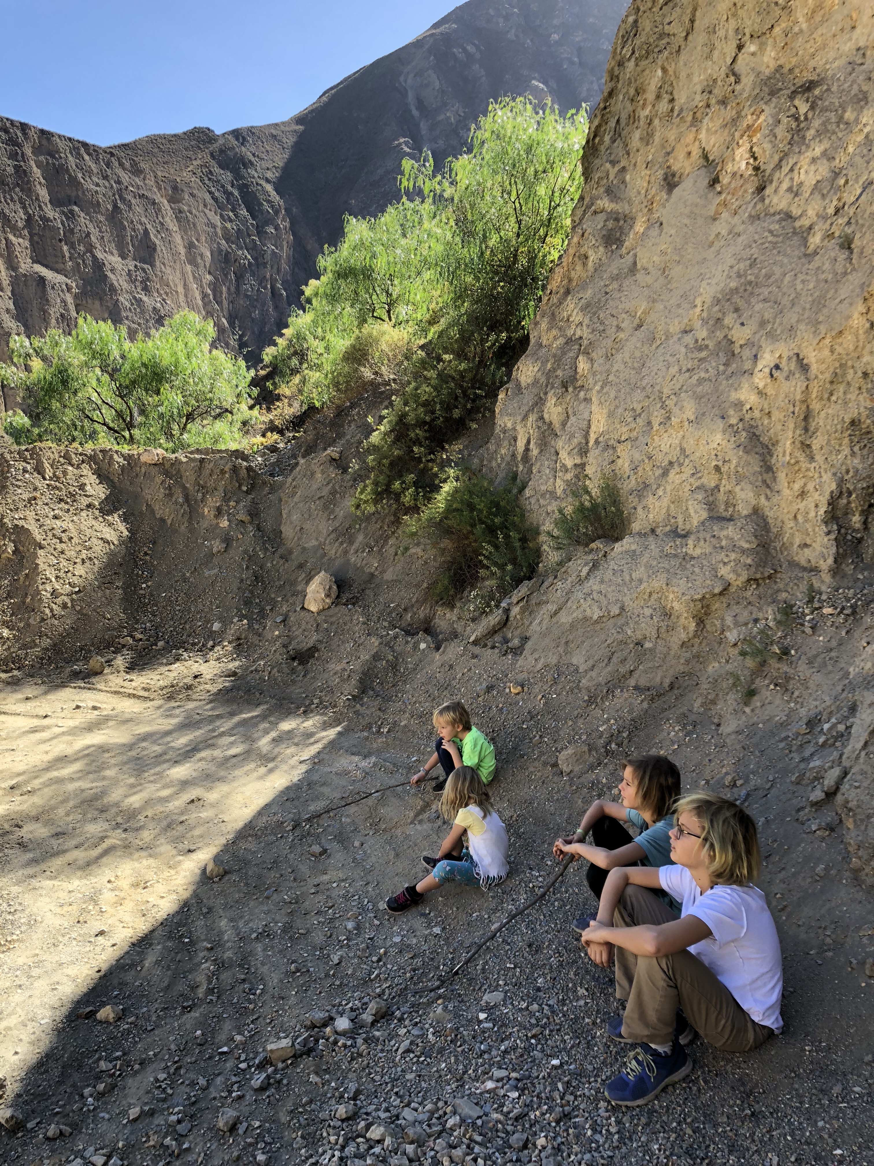 Dann noch mal eine Durstrecke, als es immer heißer wird und lauter Geröllabschnitte kommen. Doch schließlich erreichen wir einen verstaubten Bergort, wo eine kleine unbefestigte Straße rechts hinauf zu unserem Hotel führt. Es ist eine schöne, großzügige Anlage. Die Kinder spielen mit dem Wasserschlauch, es gibt grünen Rasen und ich lege mich in die Sonne und schlafe kurz ein. Ein Alpaca grast, rund um uns herum Bergwände, die Sonne scheint, es ist grün. Herrlich. Und so brechen wir nach kurzer Rast (die dünne Höhenluft, obwohl nur 2300 Meter macht einen müde) in den Ort auf. Das Bad ist urtümlich und das Wasser im Bad das noch offen hat nur 25-30 Grad warm, aber alle sind happy. Das Essen im Restaurant schmeckt, und es ist gar nicht so kalt wie befürchtet.