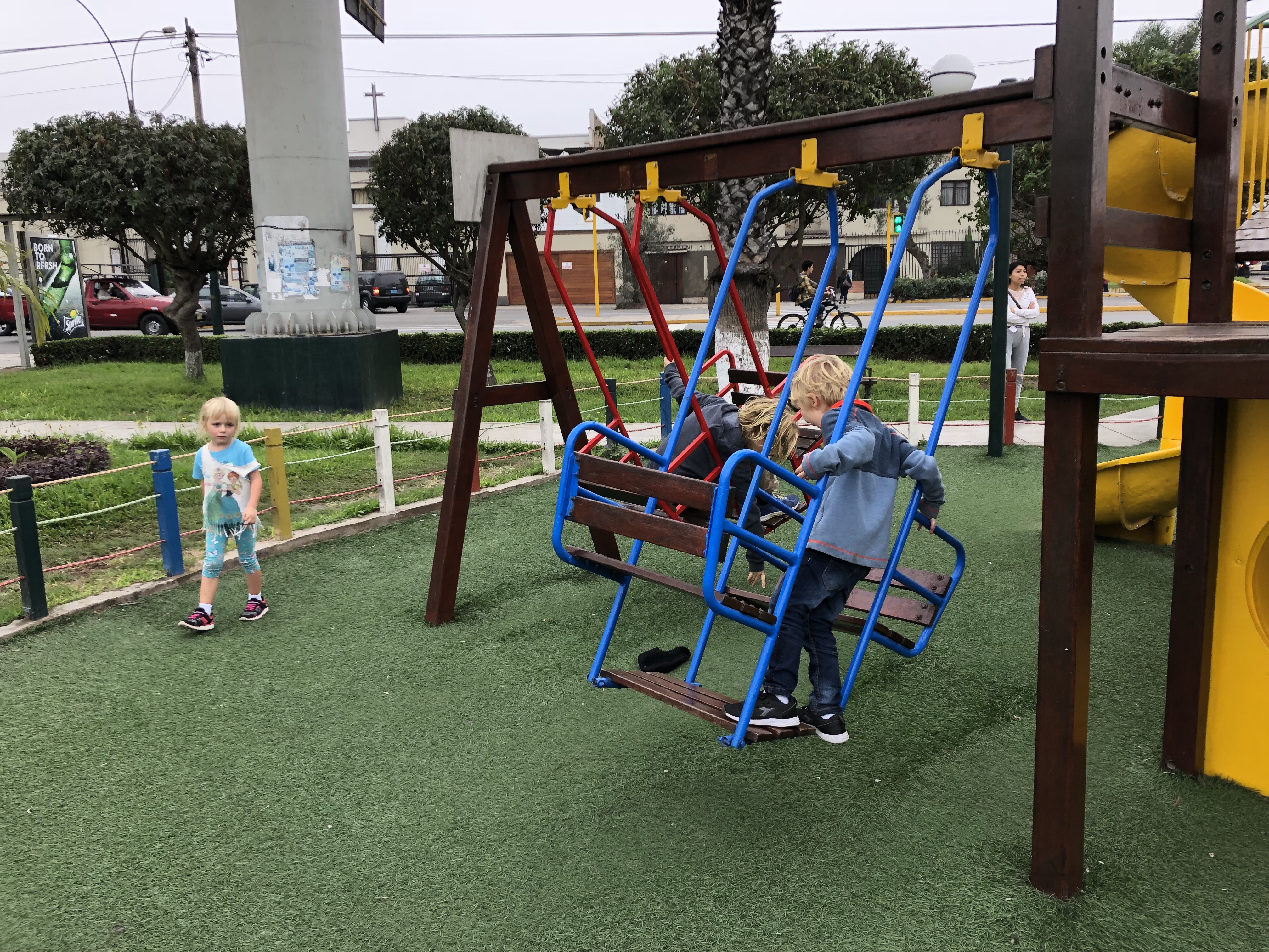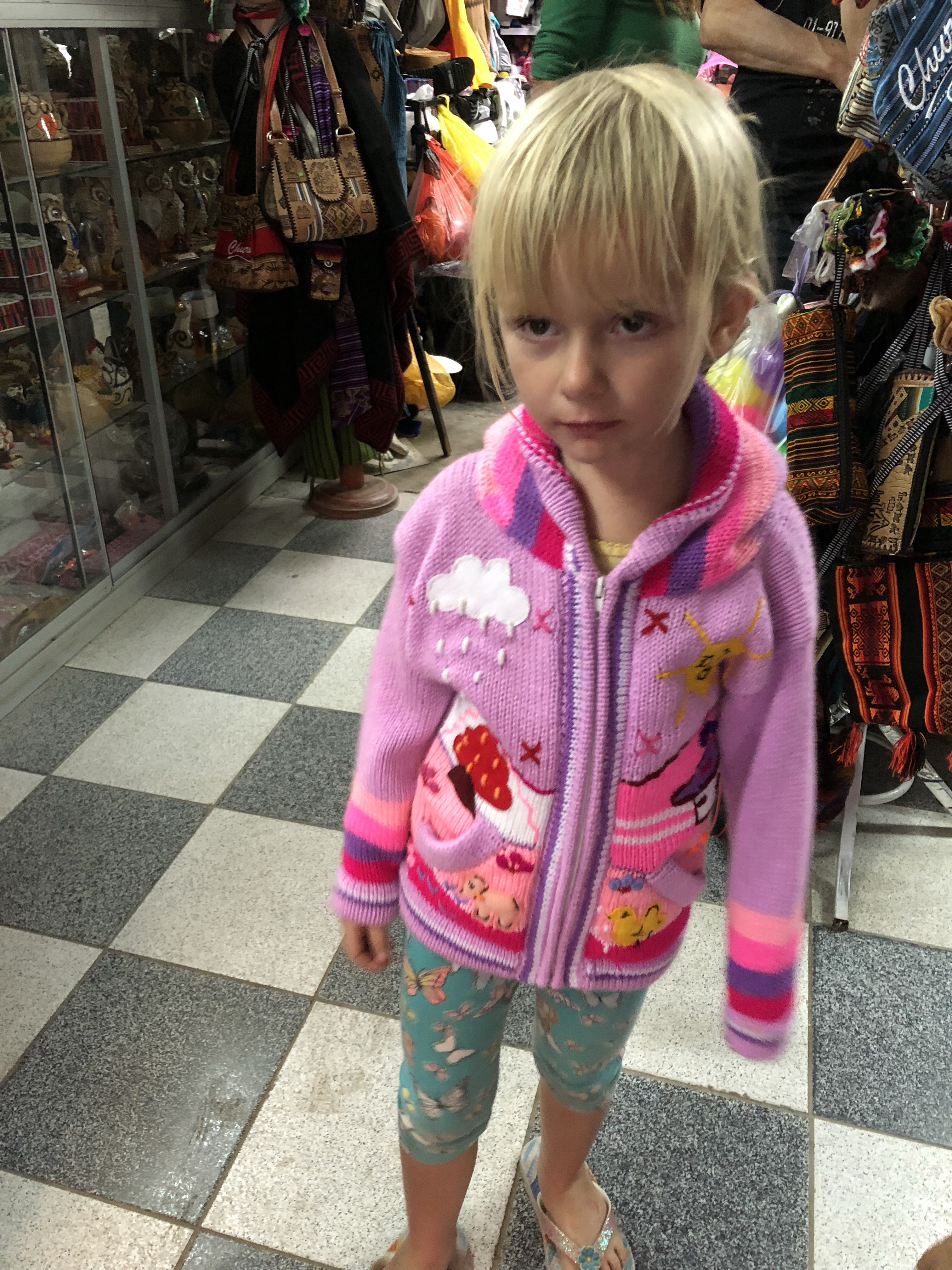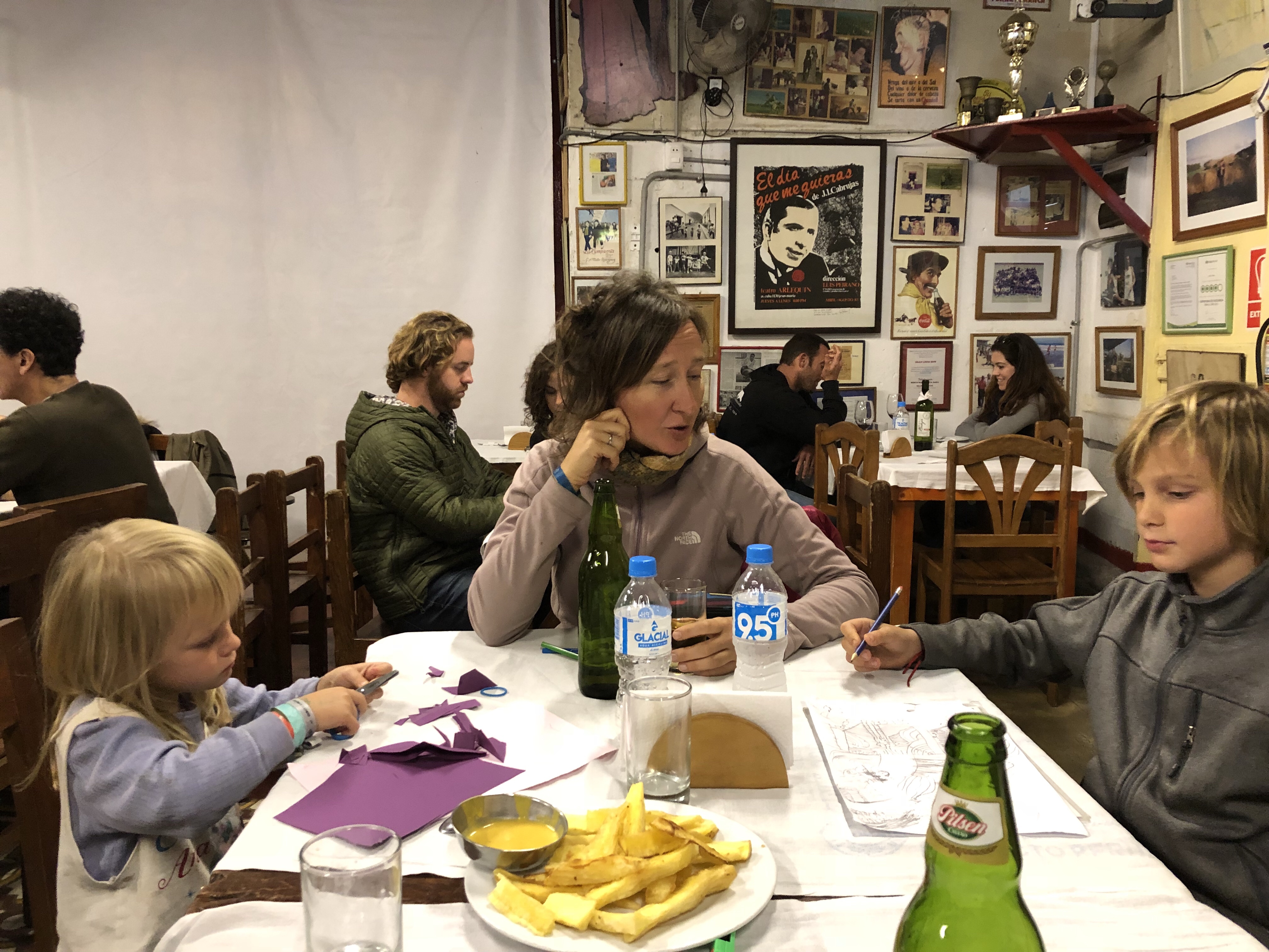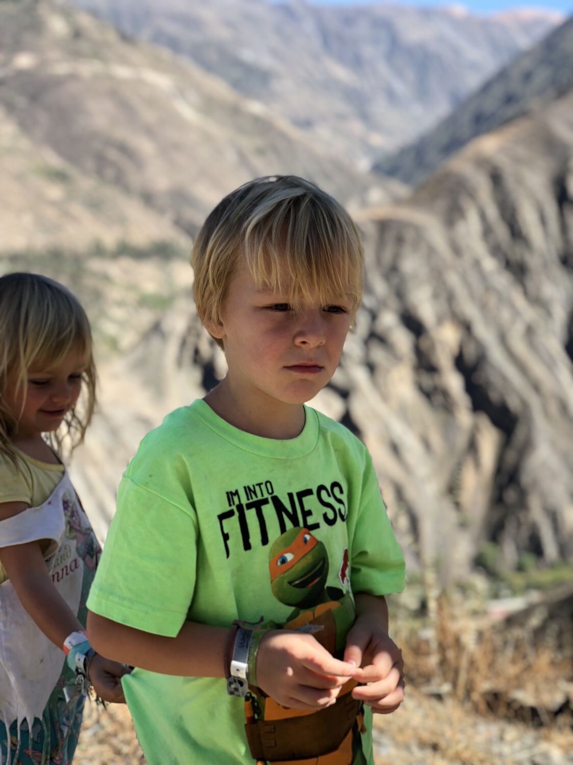 Dann noch mal eine Durstrecke, als es immer heißer wird und lauter Geröllabschnitte kommen. Doch schließlich erreichen wir einen verstaubten Bergort, wo eine kleine unbefestigte Straße rechts hinauf zu unserem Hotel führt. Es ist eine schöne, großzügige Anlage. Die Kinder spielen mit dem Wasserschlauch, es gibt grünen Rasen und ich lege mich in die Sonne und schlafe kurz ein. Ein Alpaca grast, rund um uns herum Bergwände, die Sonne scheint, es ist grün. Herrlich. Und so brechen wir nach kurzer Rast (die dünne Höhenluft, obwohl nur 2300 Meter macht einen müde) in den Ort auf. Das Bad ist urtümlich und das Wasser im Bad das noch offen hat nur 25-30 Grad warm, aber alle sind happy. Das Essen im Restaurant schmeckt, und es ist gar nicht so kalt wie befürchtet.