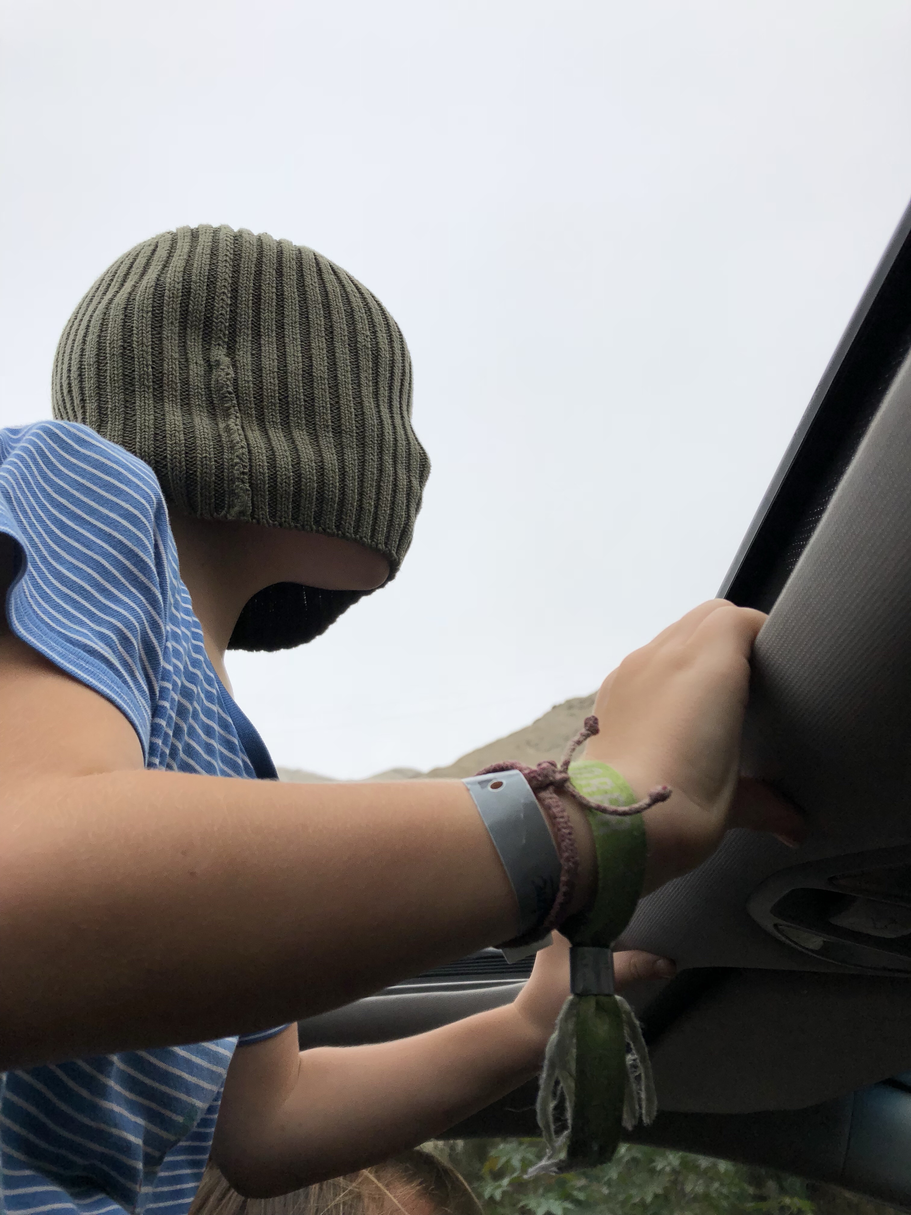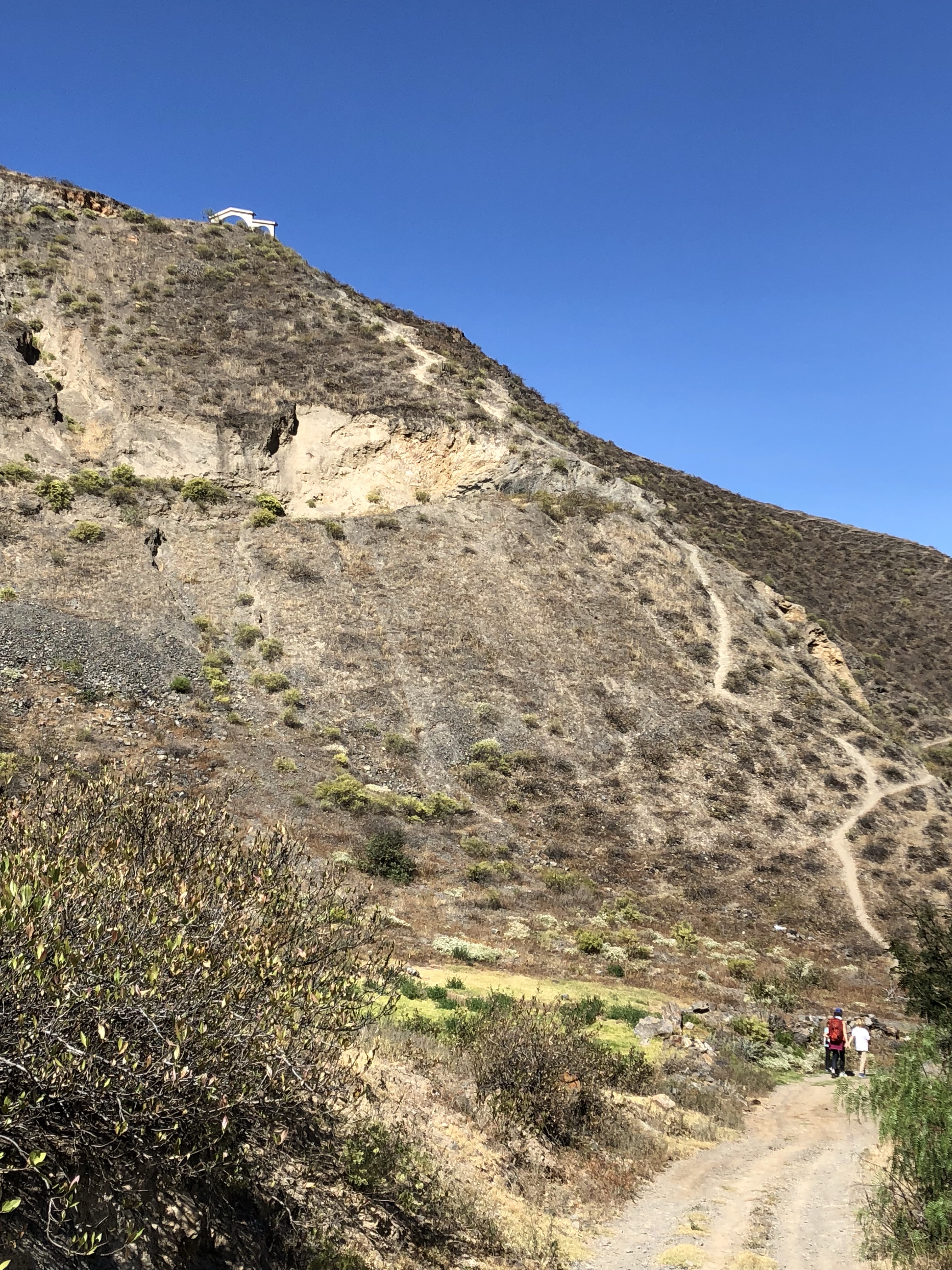 Wir sind 300 Meter aufgestiegen, gleich nach dem Frühstück ging es los. Lysander wollte die Berge hinter dem Haus hoch, und ganz oben sah man ein weißes Tor, hoch über uns. Wir haben es geschafft. Es ist ein tolles Wetter, trocken und nachts kühl, morgens wenn die Sonne herauskommt wird es warm. Ein kühler Wind aber weht und macht es angenehm.
