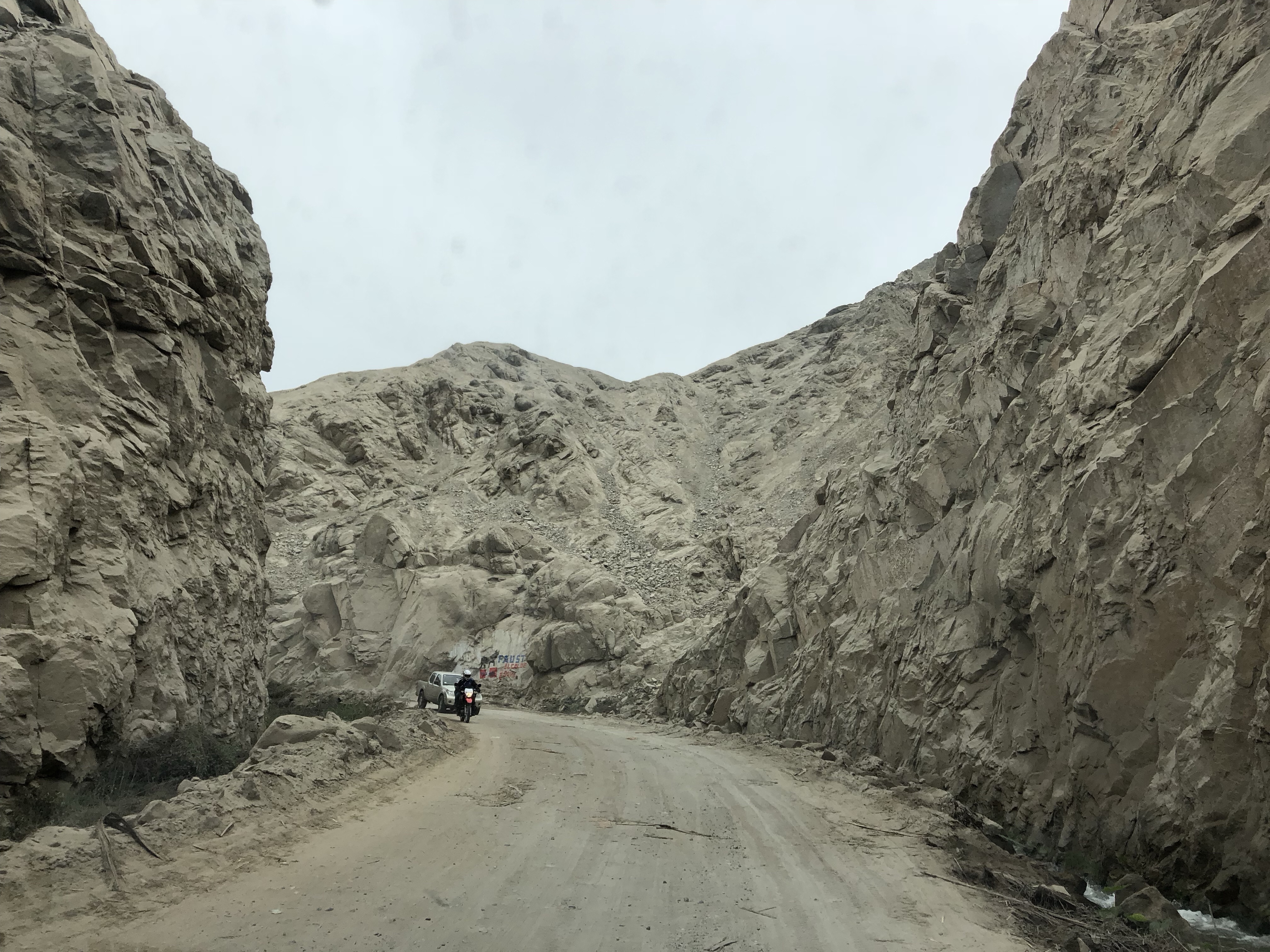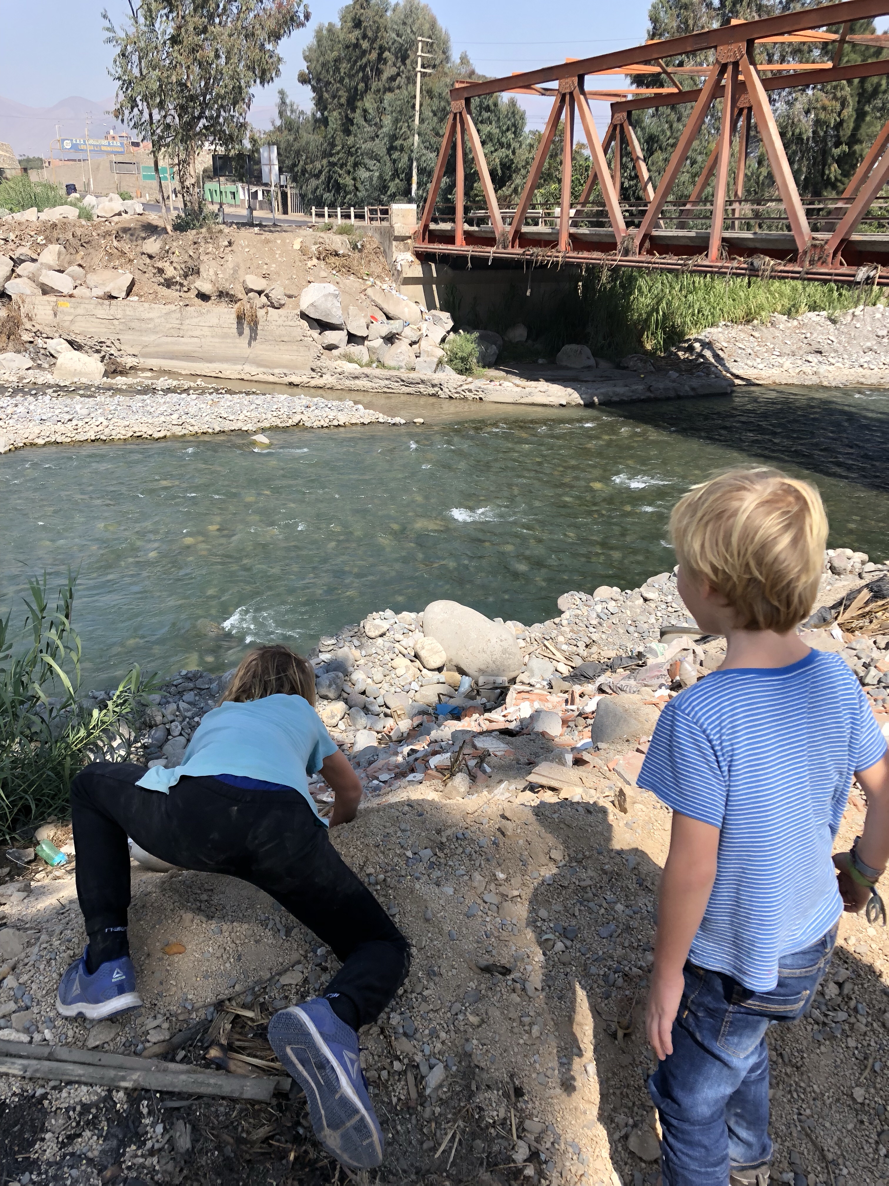 Nach zwei Stunden Richtung Norden beginnt keine klassische Wüste, sondern ein Nebelgebiet. Die Panamerikana ist von Warnschildern geprägt, die Autos machen das Warnlicht an, die Sichtweite ist 20 Meter oder geringer. Schließlich biegen wir ab ins Landesinnere. Halten an einem Fluss, der erste Stop nach der Tankstelle heute morgen in Lima noch. Alle sind guter Stimmung, wir haben es geschafft. Die Sonne ist wieder da. Und wir sind in Peru auf dem Land mit dem eigenen Wagen unterwegs.