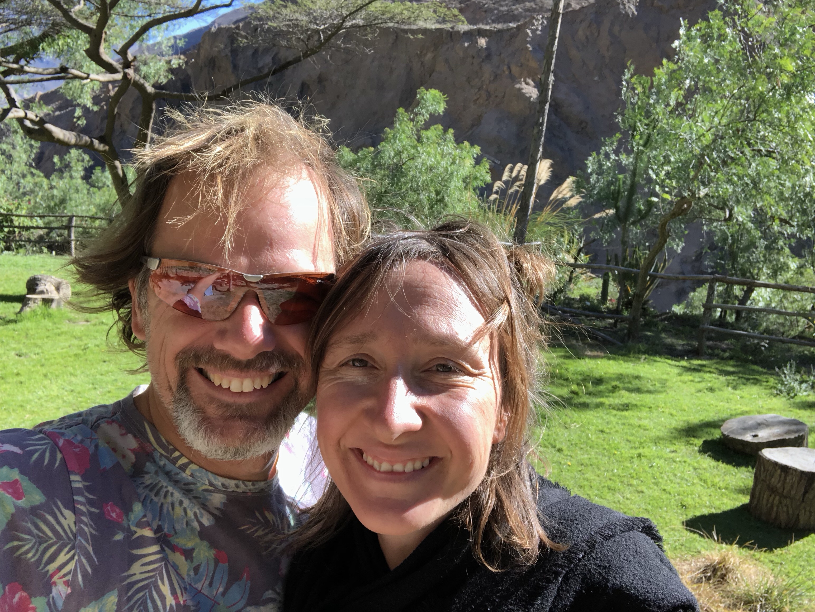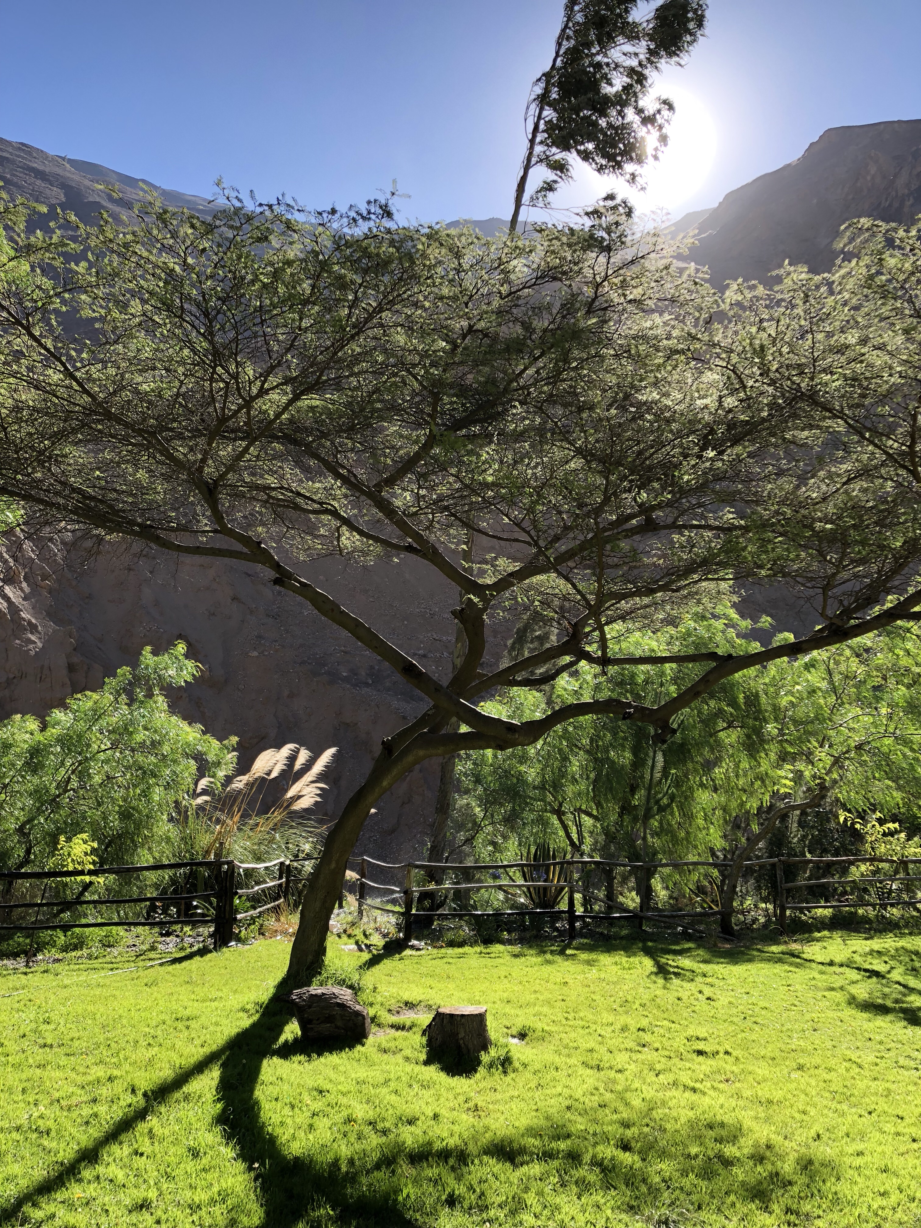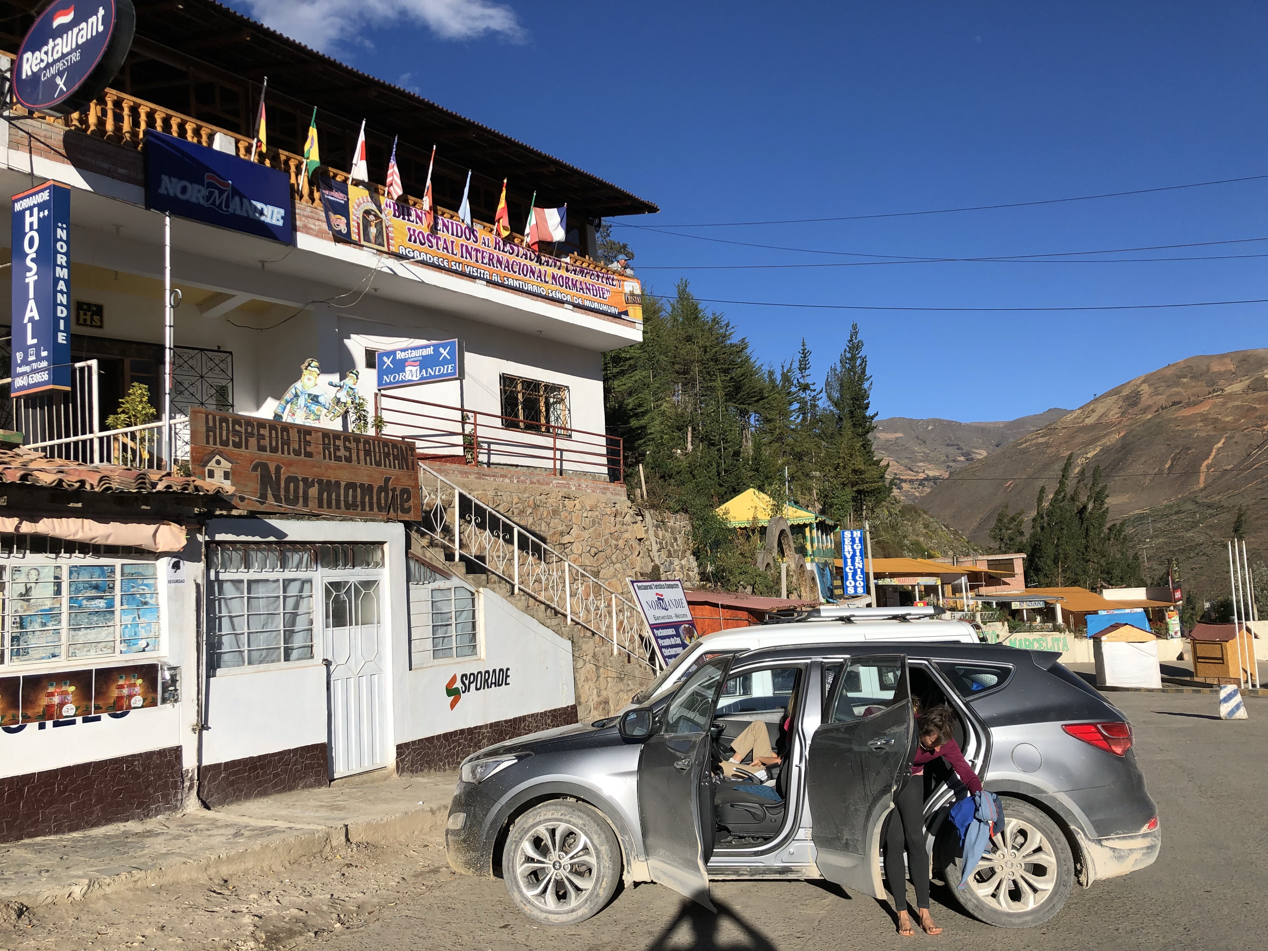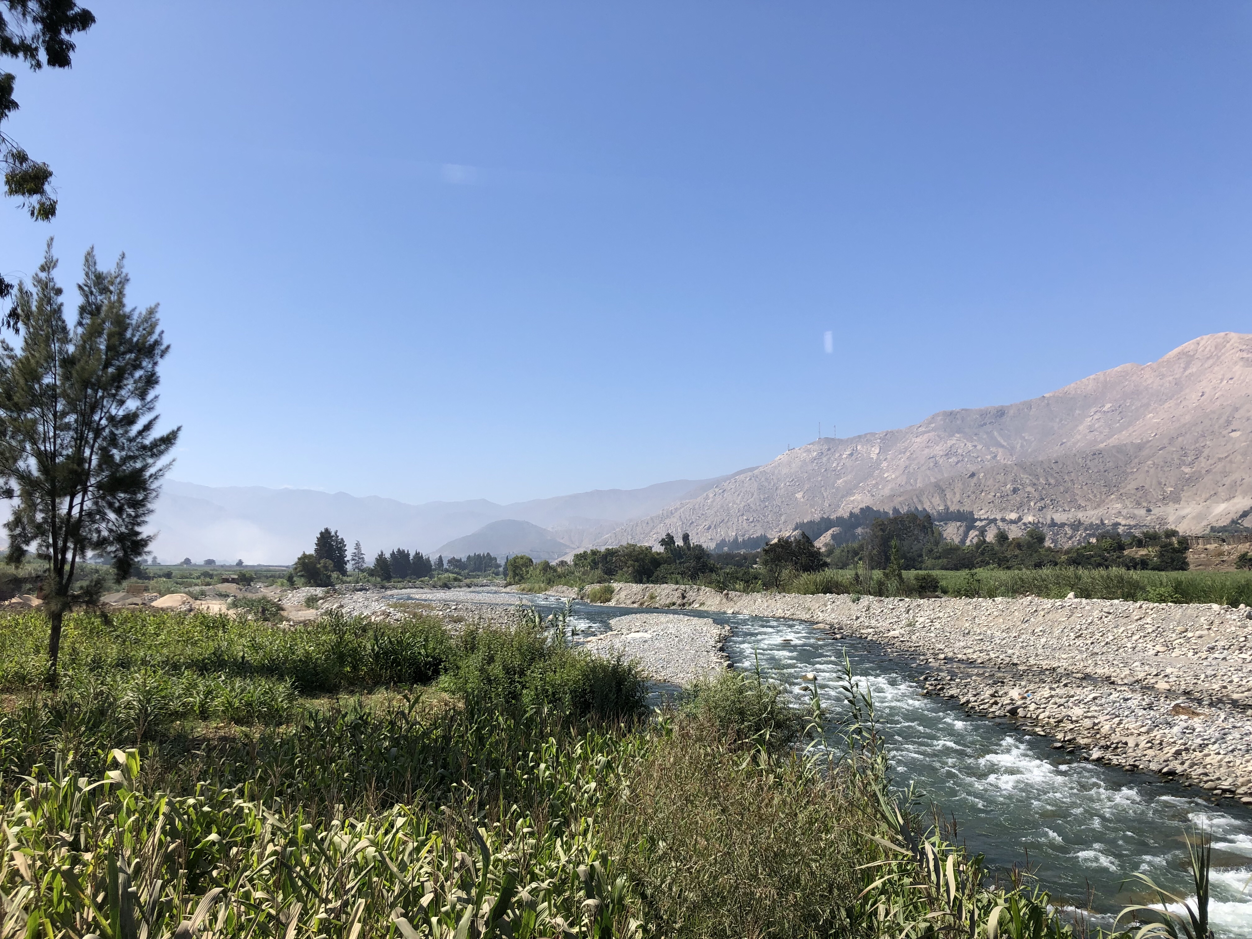Ich sitze in der Sonne in der Bergluft, man hört den Bach rauschen. Ich bin sehr glücklich, wieder zurück in meinem Peru zu sein. Es ist so herrlich, von der nebligen Wüste nach 120 Kilometer wieder in die Sonne zu kommen. Alle im Auto waren begeistert, als die Sonne herauskam, das Tal begann und in der Mitte der Fluss rauschte, links und rechts von Maisfeldern eingesäumt. Immer karger und felsiger wird die Landschaft. Nadine findet eine super Musik, Christian Löffler, und die Jungs entdecken dass man das Dach vom Auto aufmachen kann und sie stellen sich in den Fahrtwind. Herrlich ist es, wunderbar. Ein tiefes Glücksgefühl durchströmt mich, mit meiner Liebsten und meinen Kindern durch Peru zu reisen. Mit dem Auto, es ist ein toller Wagen, ein SUV mit Vierradantrieb. Man kann damit wunderbar die Geröllabschnitte fahren, wo die Straße von den letzten Erdrutschen nur einspurig ist.