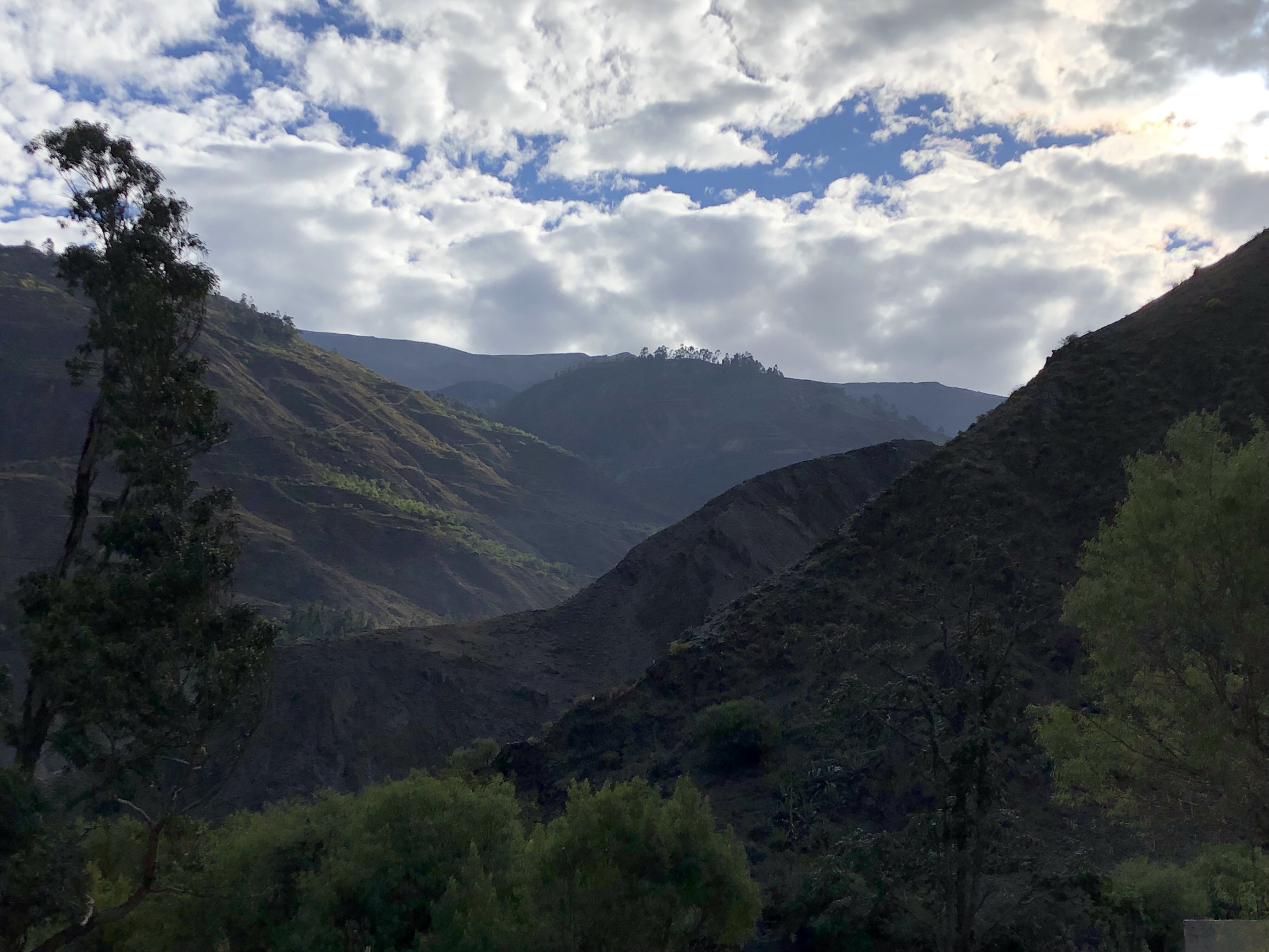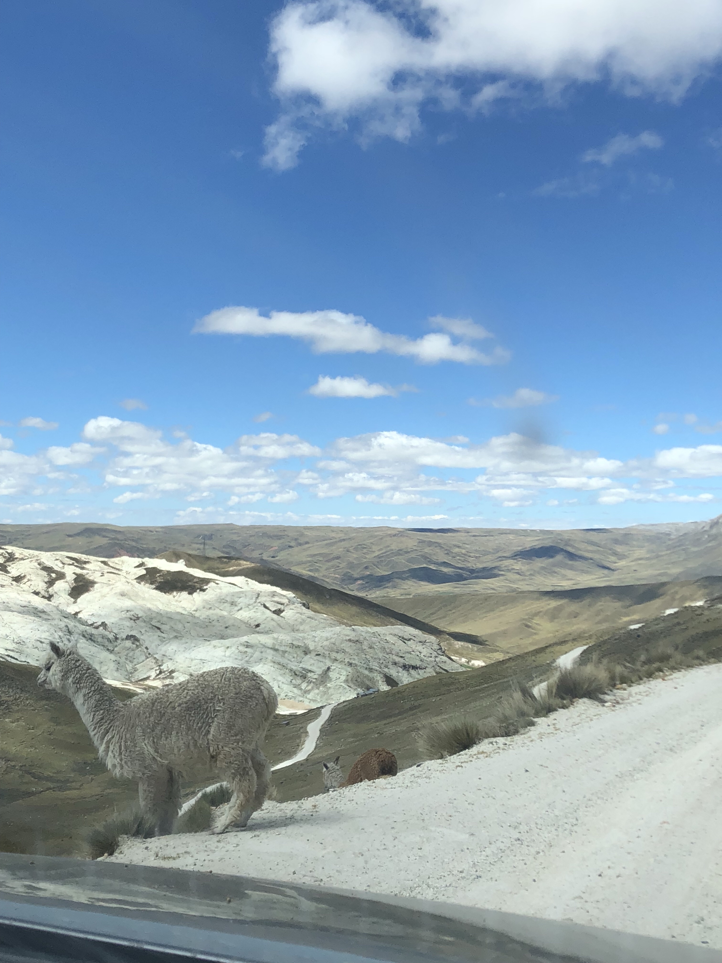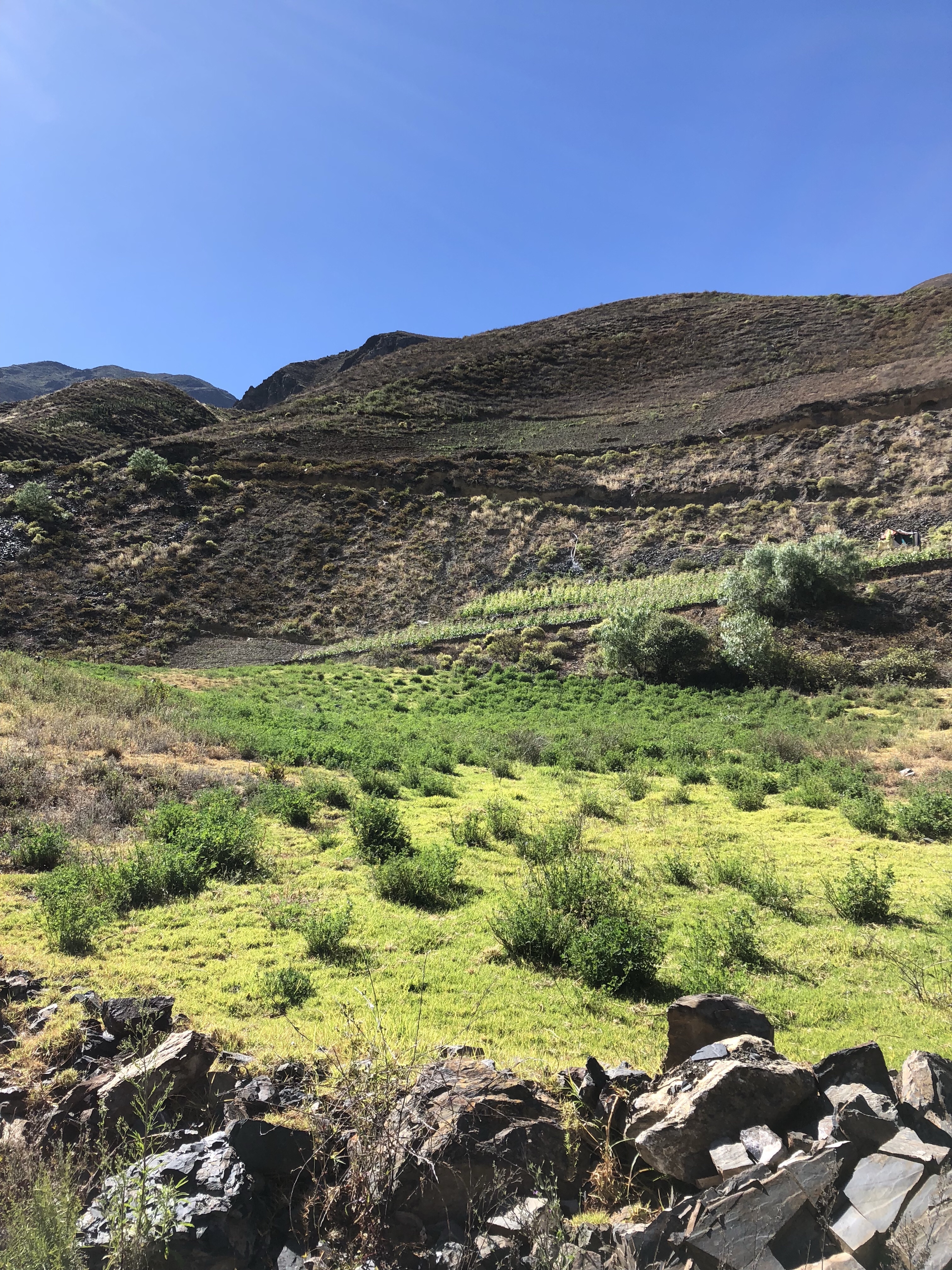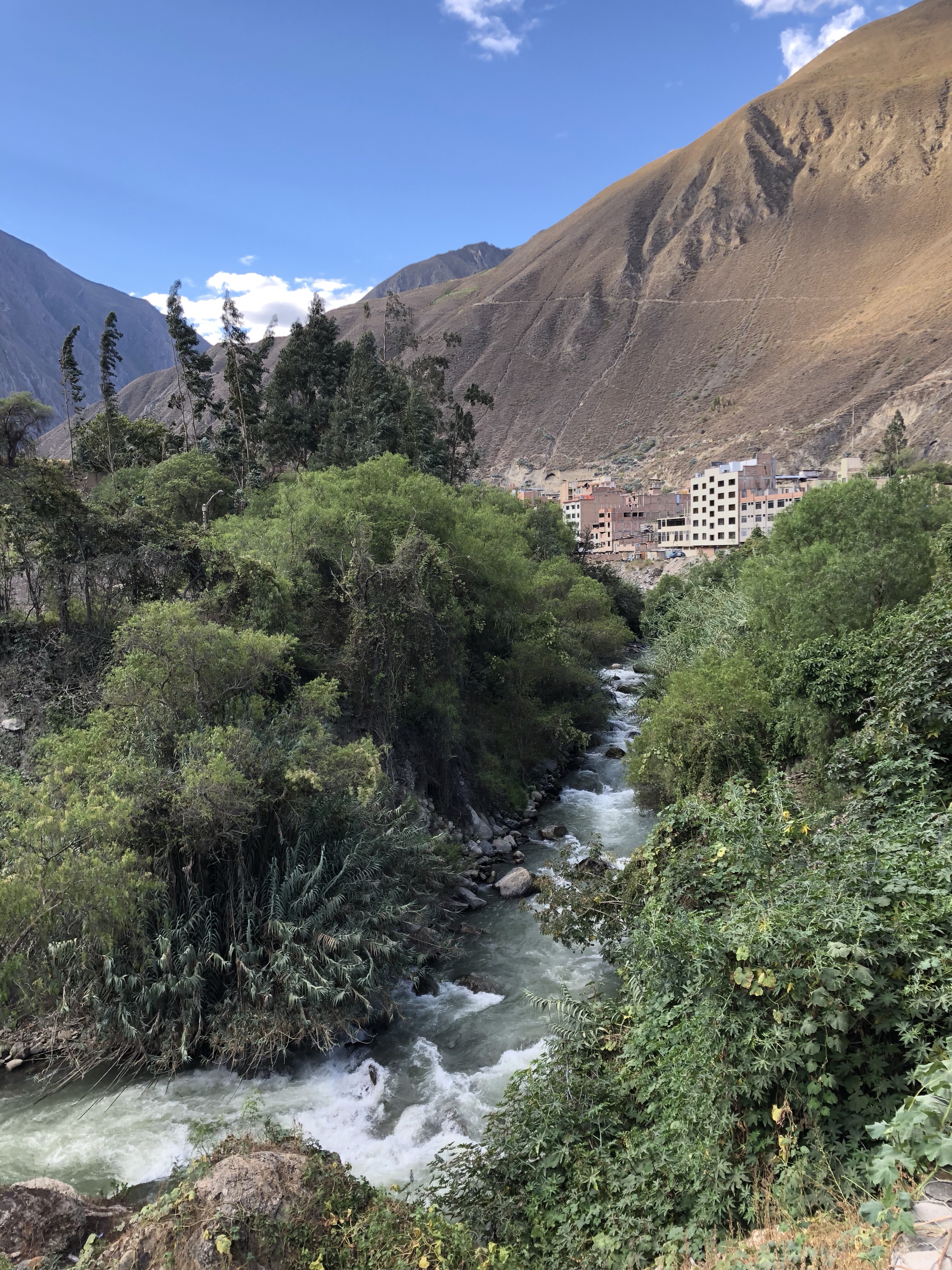 Ich sitze in der Sonne in der Bergluft, man hört den Bach rauschen. Ich bin sehr glücklich, wieder zurück in meinem Peru zu sein. Es ist so herrlich, von der nebligen Wüste nach 120 Kilometer wieder in die Sonne zu kommen. Alle im Auto waren begeistert, als die Sonne herauskam, das Tal begann und in der Mitte der Fluss rauschte, links und rechts von Maisfeldern eingesäumt. Immer karger und felsiger wird die Landschaft. Nadine findet eine super Musik, Christian Löffler, und die Jungs entdecken dass man das Dach vom Auto aufmachen kann und sie stellen sich in den Fahrtwind. Herrlich ist es, wunderbar. Ein tiefes Glücksgefühl durchströmt mich, mit meiner Liebsten und meinen Kindern durch Peru zu reisen. Mit dem Auto, es ist ein toller Wagen, ein SUV mit Vierradantrieb. Man kann damit wunderbar die Geröllabschnitte fahren, wo die Straße von den letzten Erdrutschen nur einspurig ist.