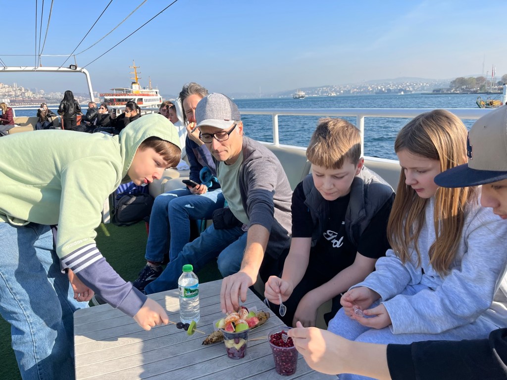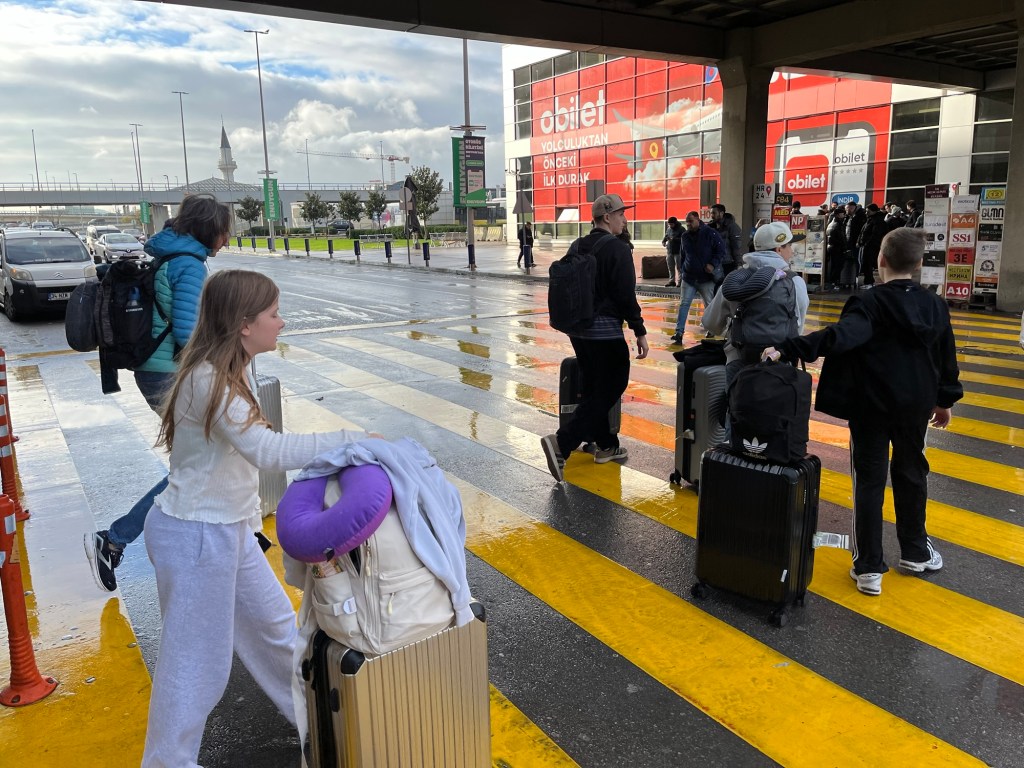 An unserem Treffpunkt im Gülhane-Park finden wir alle wieder zusammen, holen das Gepäck ab und machen uns auf dem Weg mit der Metro Richtung Flughafen. Das klappt erstaunlich gut, man kann meistens die Fahrkarte einfach mit der Kreditkarte am Drehkreuz lösen, und wir sind nach einmal umsteigen und einer Stunde Fahrt wieder am Flughafen Sabiha Gökçen angekommen, der praktisch angelegt ist, und voller Passagiere. 3 Stunden bis zum Abflug brauchen wir auch und sind nun mit einer letzten Nudelsuppe für die Kinder und Spekulatius meiner Mama, zwei Avocados und Sesamkringel gestärkt beim Boarding für unseren vom Nachtflug von knapp 5 Stunden mit Pegasus nach Maskat– no Frills. Der Oman kann kommen- Istanbul war ein großartiger Auftakt – es geht weiter!