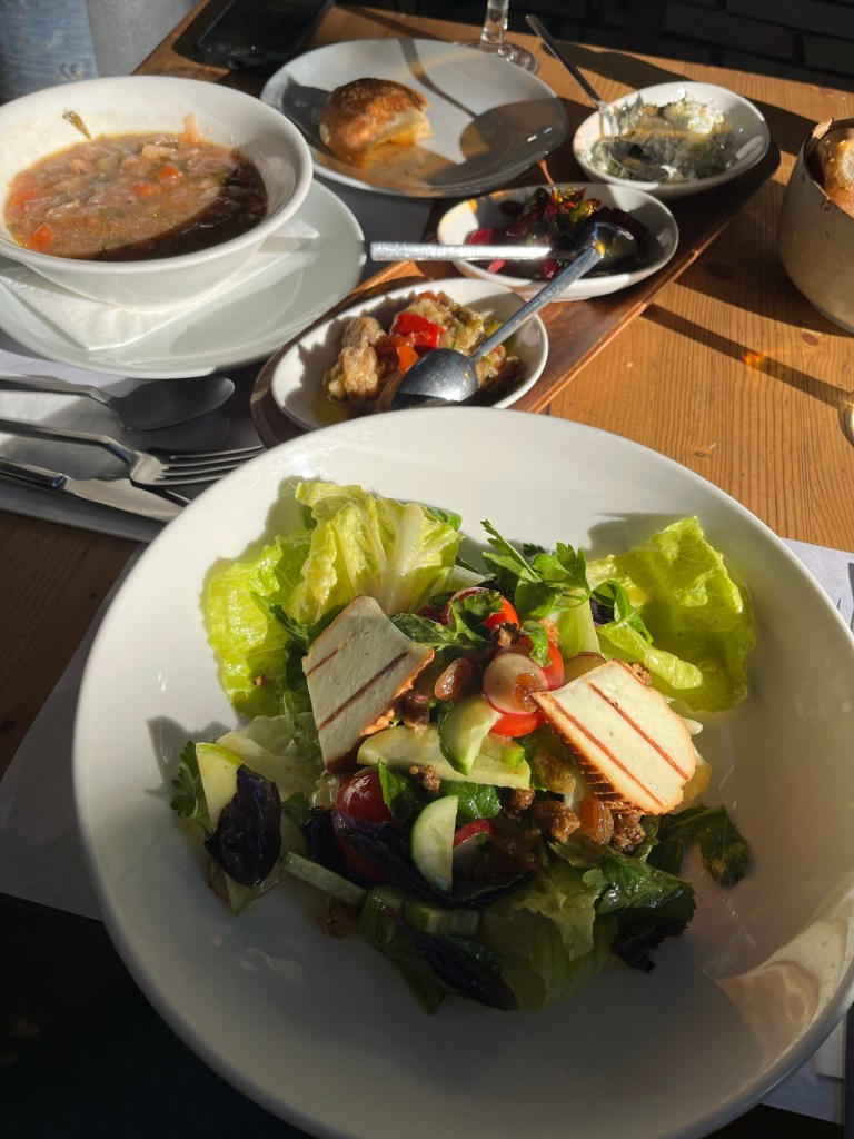 Während die Kinder uns Videos von Haien schicken, schlendern wir den Berg durch kleine Gassen hinauf zu einem Geheimtipp von Inci unauffällig in einer Straße verborgen befindet sich der Eingang zum Limonlu bahce, über eine enge Treppe hinab und durch einen langen Ganggang zu einem schattigen begründen Innenhof mit einem angesagten Studentencafe und Restaurant. Der Salat mit warmen Ziegenkäse, die Gemüsesuppe und die Auberginenpaste schmecken hervorragend!