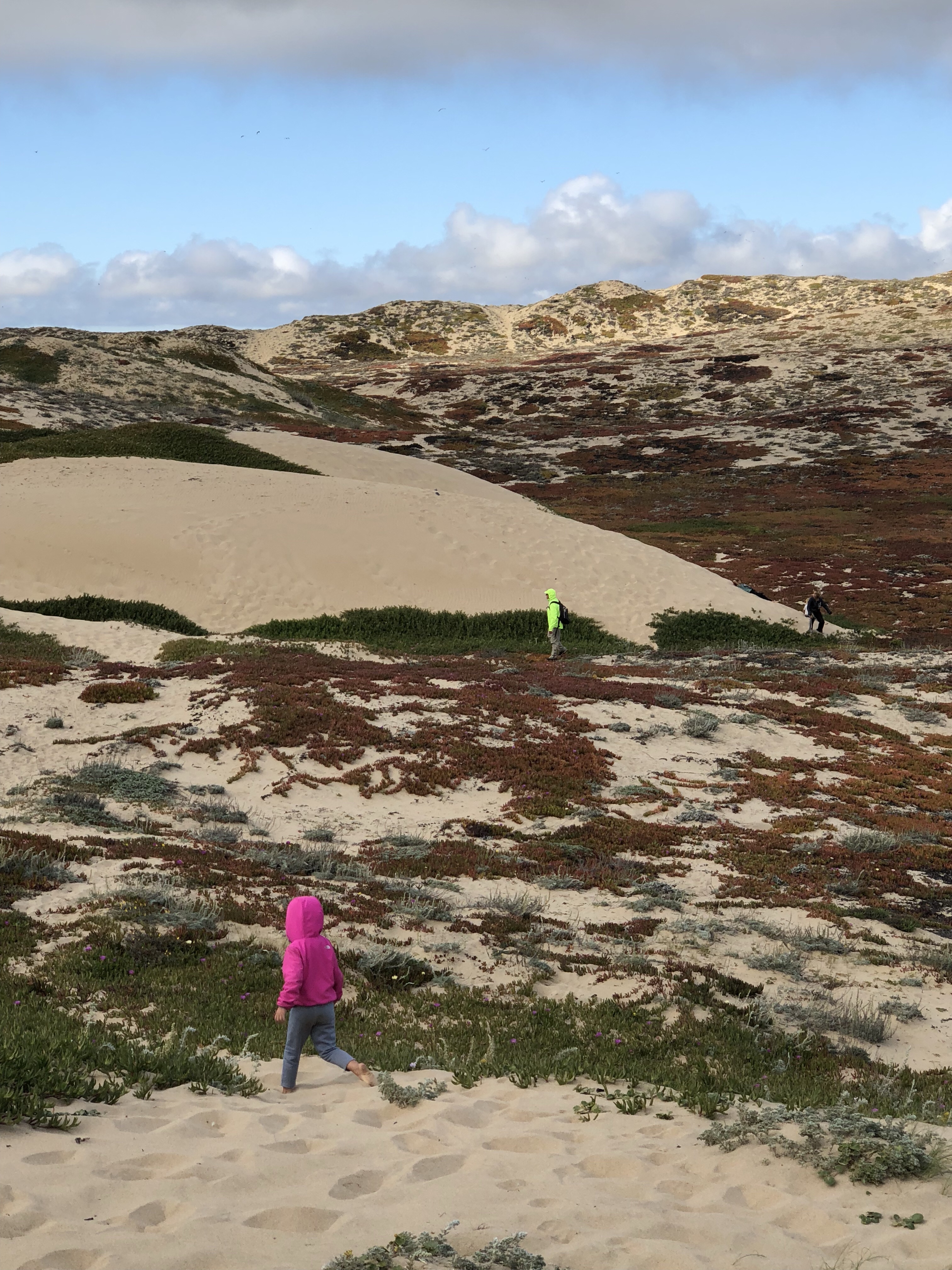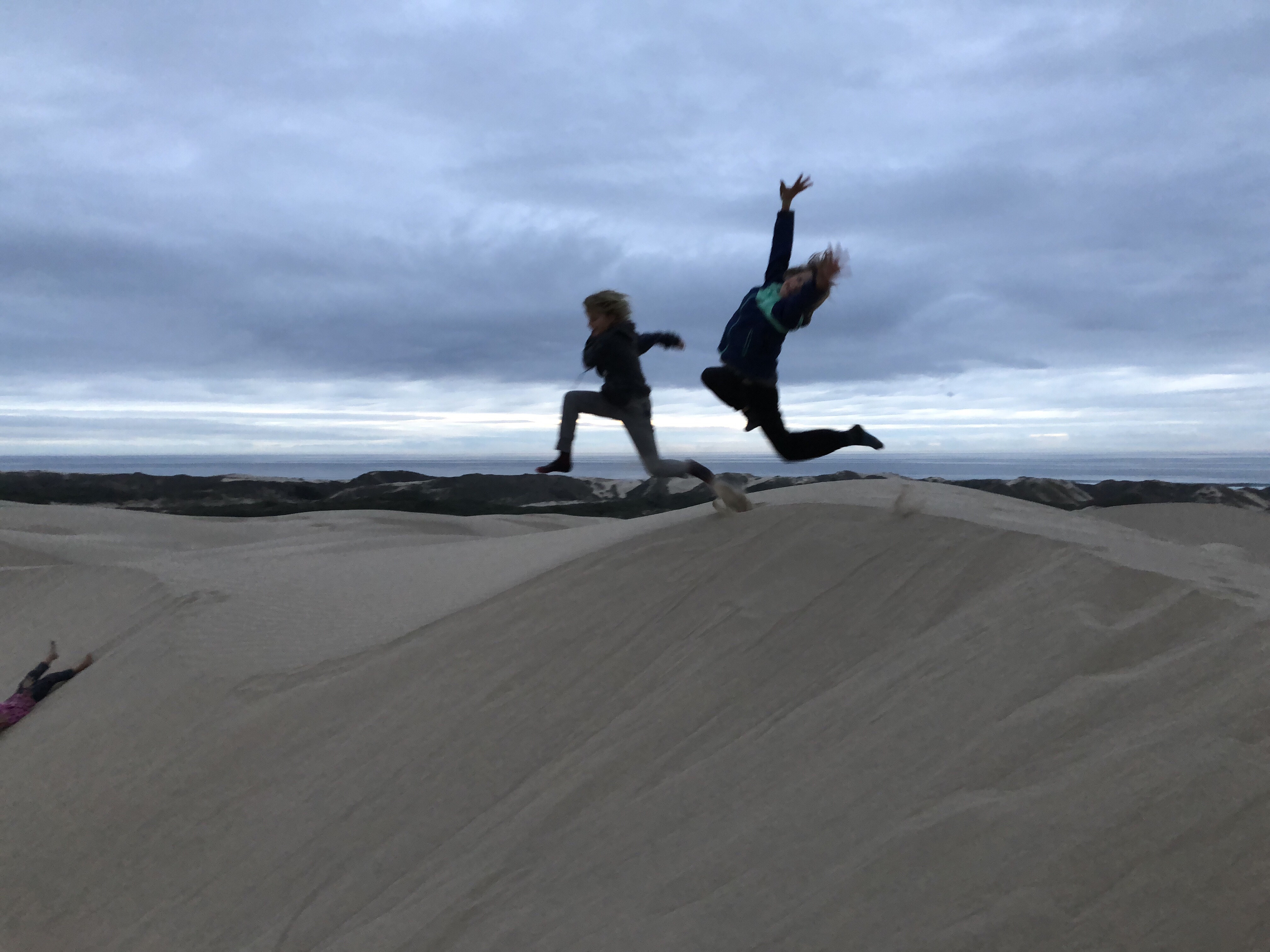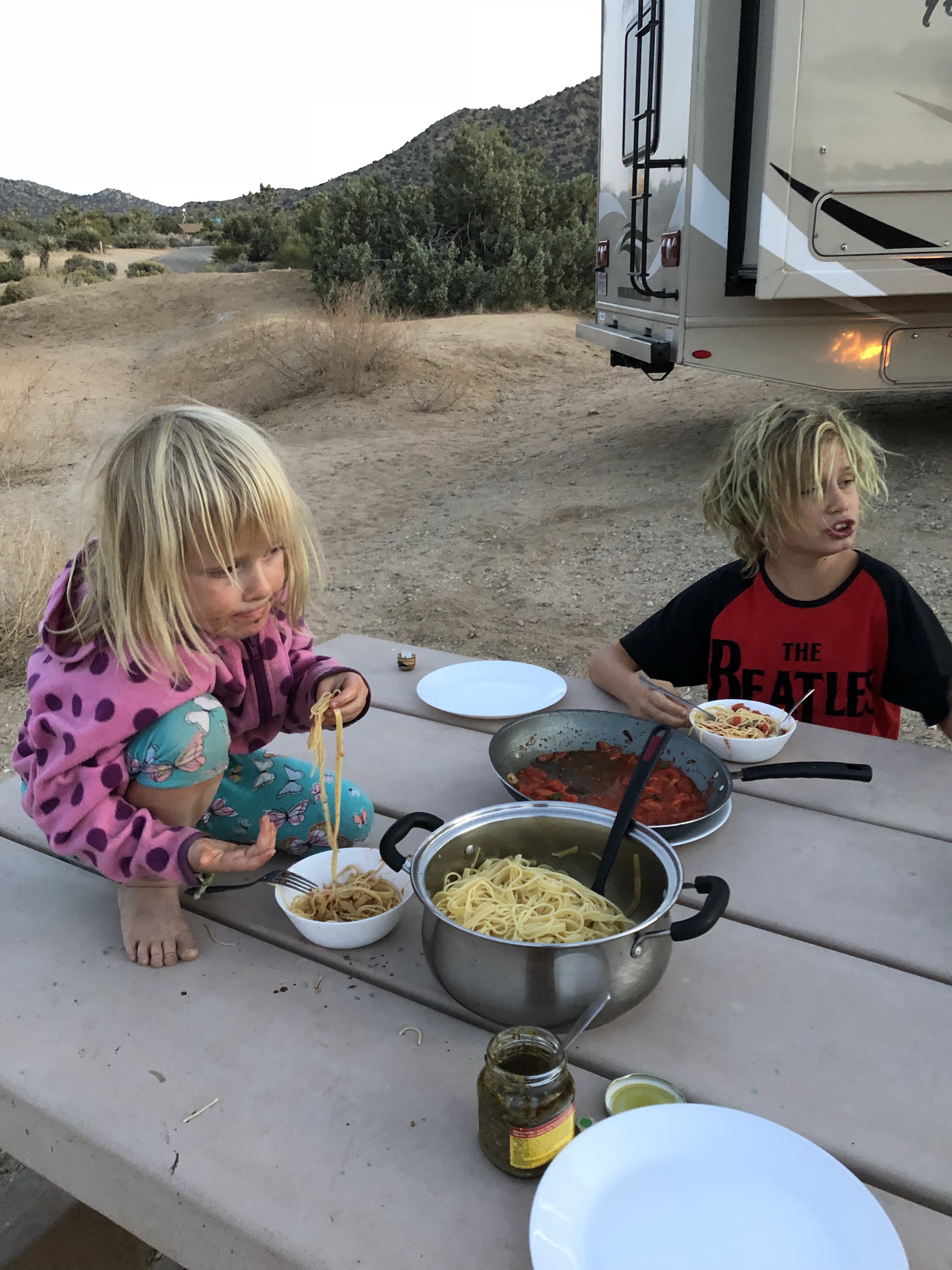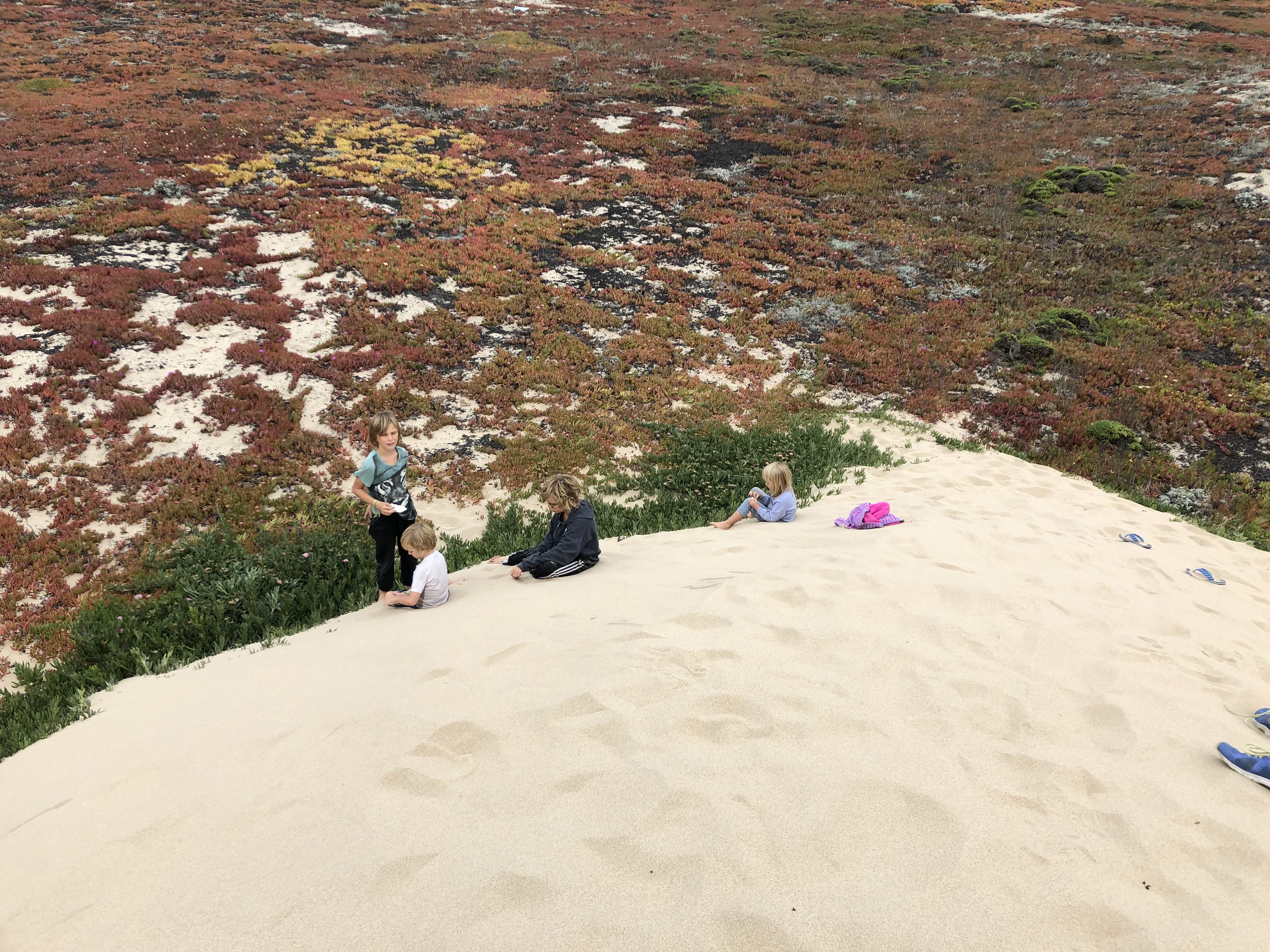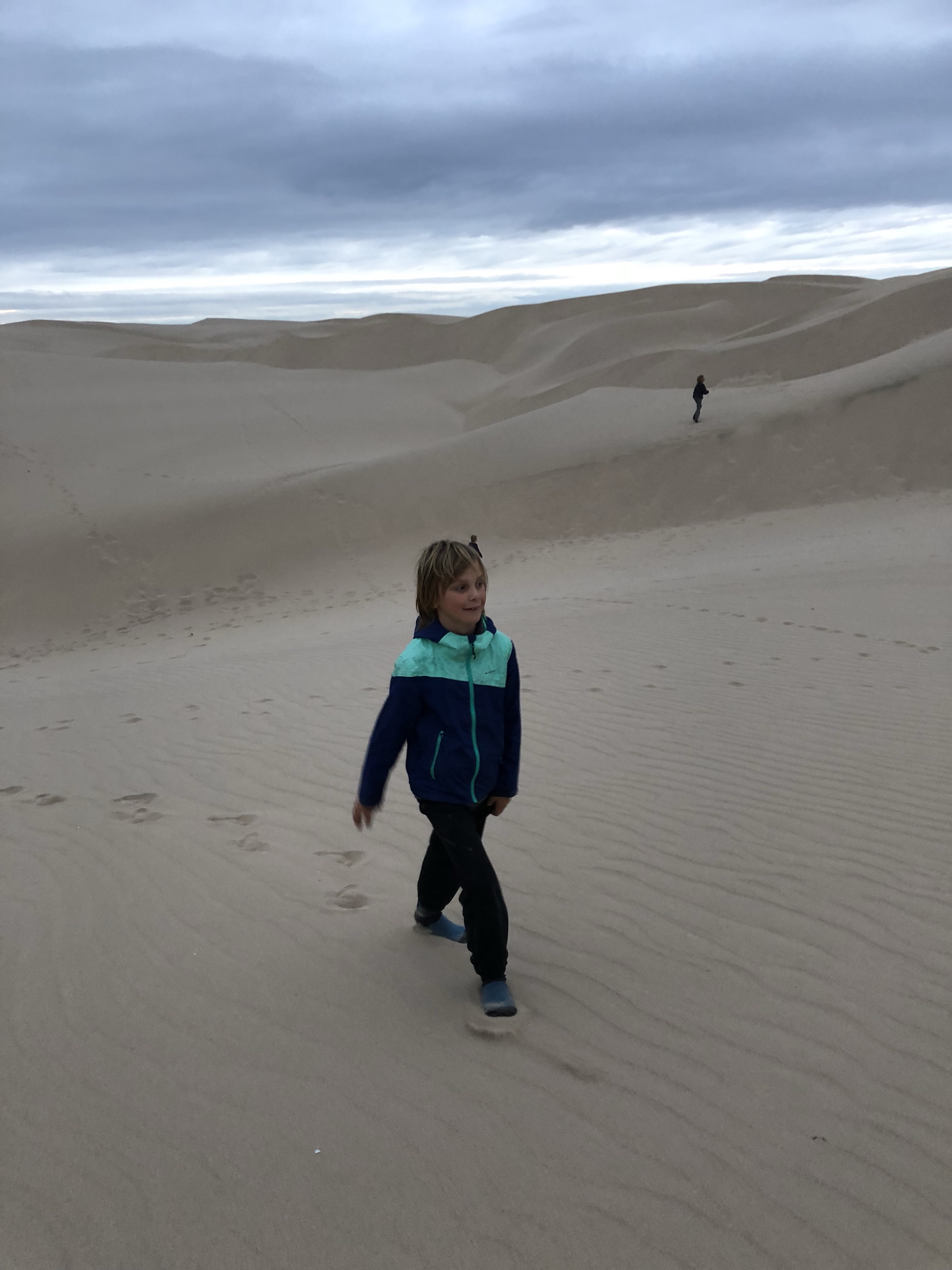 Das Ziel dann zur Freude der Kinder ein Platz an den Dünen. Wir kamen gerade vor Sonnenuntergang an. Während meine Eltern kochten, erkundete ich noch mit den Kindern die Dünen. Danach Mega- entsanden und große Freude über Spaghetti und Tomatensoße im warmen Wagen. Tara bearbeite noch ihr Bild und malte sich die Füße rot an. Wenn dann gegen 23.00 auch alle Kinder wirklich schlafen sind wir Erwachsen auch glücklich und bettreif.