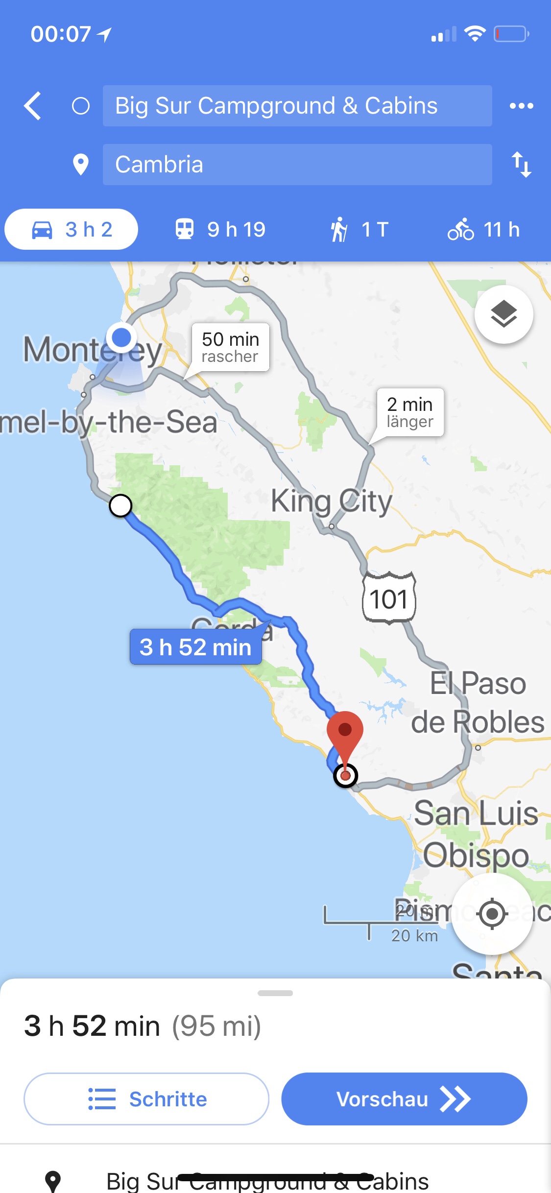 Ich saß ja gestern noch bis in die Nacht und plante: lässt sich die Vollsperrung der legendären Route 1 südlich von Big Sur umfahren? Wenn ja, mit unserem 32ft Wohnmobil? Die Karten-App empfiehlt ja, ganz außen herum, das ist viel schneller.