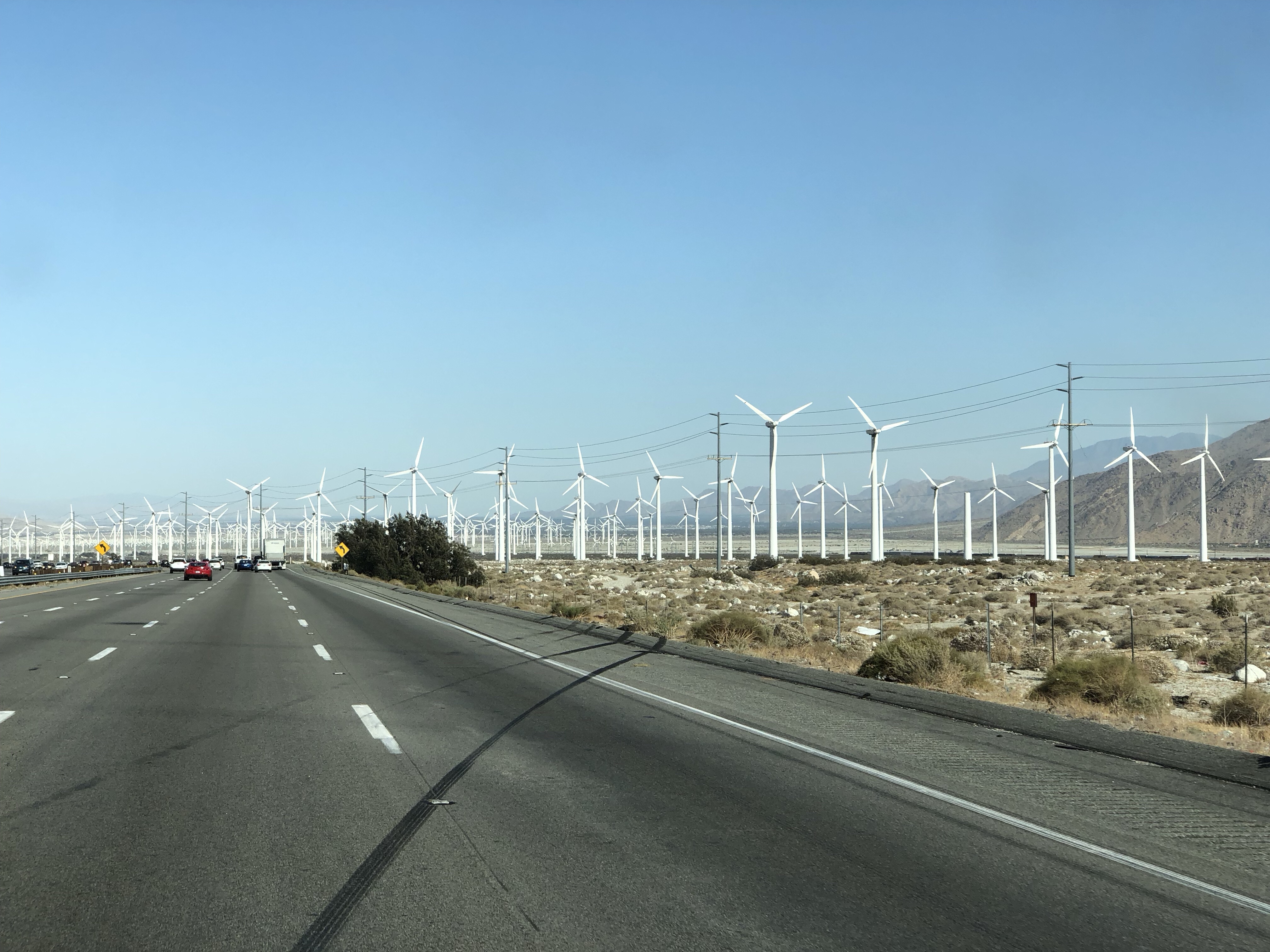 Hier in der Mojave-Wüste liegen die ersten Solar-Großkraftwerke. Vor dem Solarzellenboom, der durch Deutschland ausgelöst wurde hier die größte installierte Kraftwerkskapazität erreicht. Denn die Bedingungen sind ideal, die Sonne scheint praktisch das ganze Jahr und es gibt dank der Lufttrockenheit kaum Korrosion. Deshalb werden hier auch Fahrzeuge in großen Parks aufbewahrt – und auch ausgedienten Düsenjets oder auch derzeit nicht benötigte neue Maschinen.
