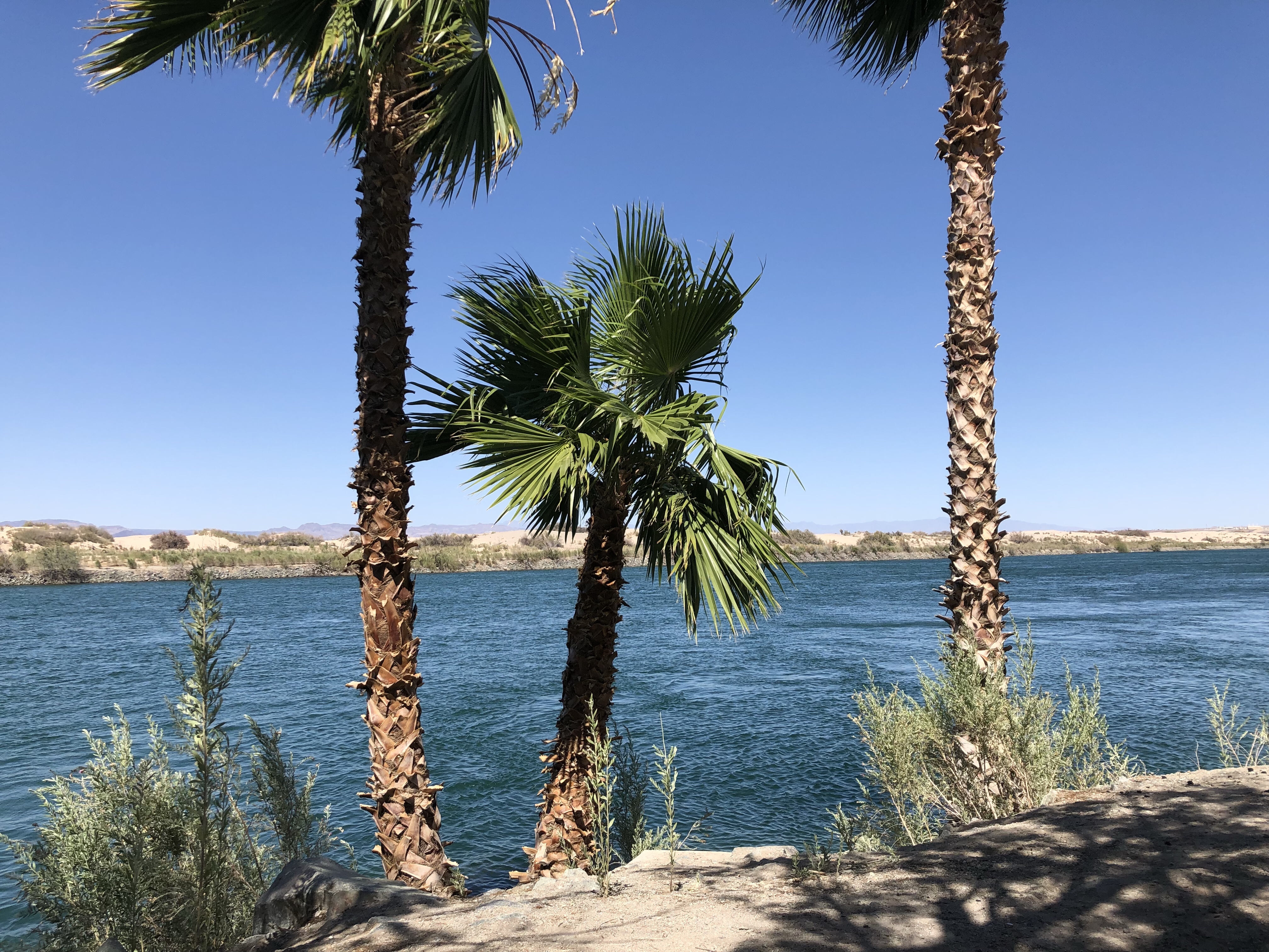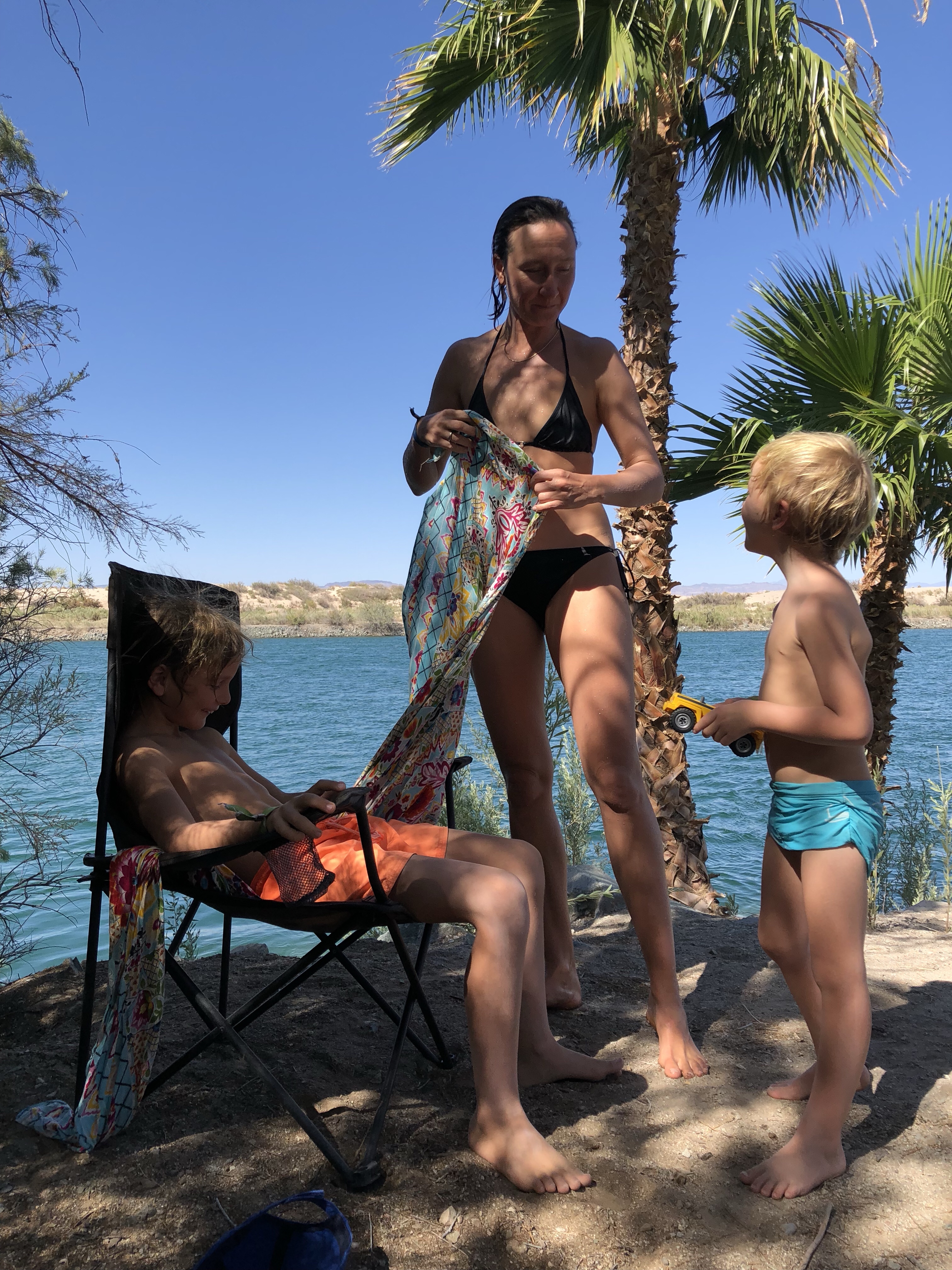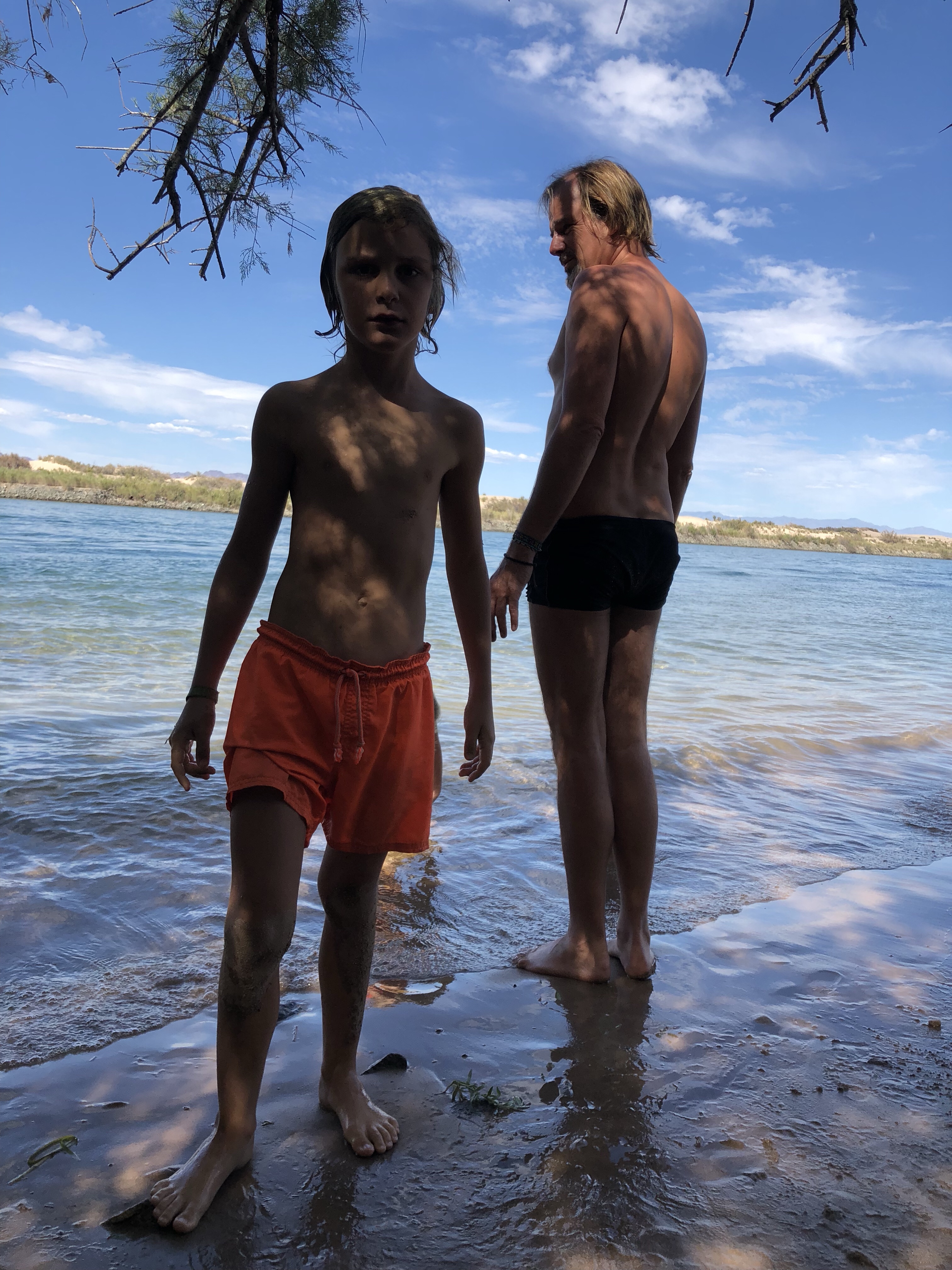 Wir sind hier in Californien, auf der anderen Seite des Flusses liegt Arizona. Wasser in der Wüste, das hat mir schon immer gefallen. Es erinnert mich an den Nil in Luxor, an den Orange River in Namibia. Camps am Fluss waren auch für die Kinder immer die liebsten Plätze. Wie Velis meinte: Im Meer ist es salzig und im Swimmingpool ist Chlor. Hier ist das Wasser frisch und sauber. Und für Lysander war es gleich bei der Ankunft „das beste Camp der Reise“.