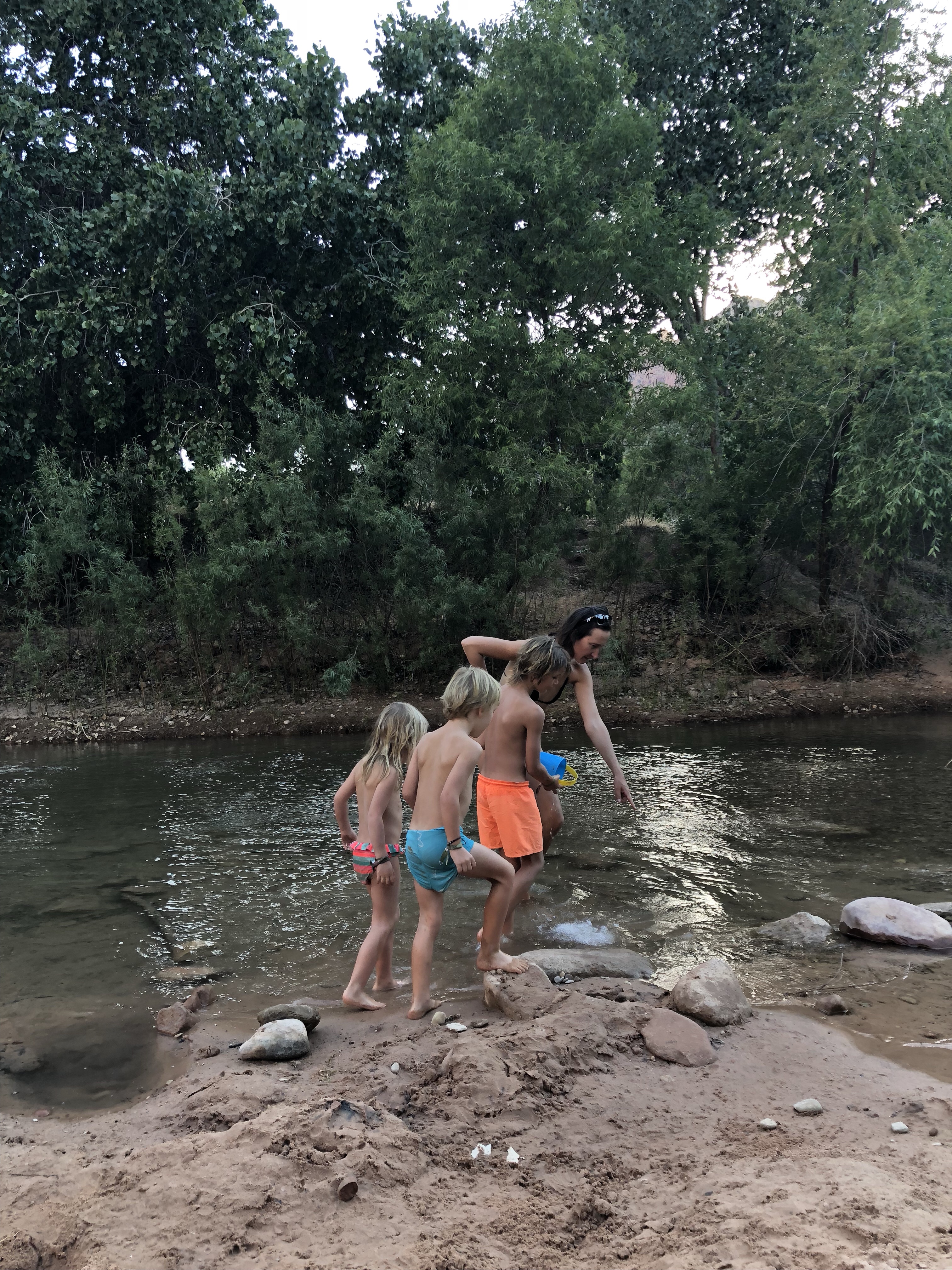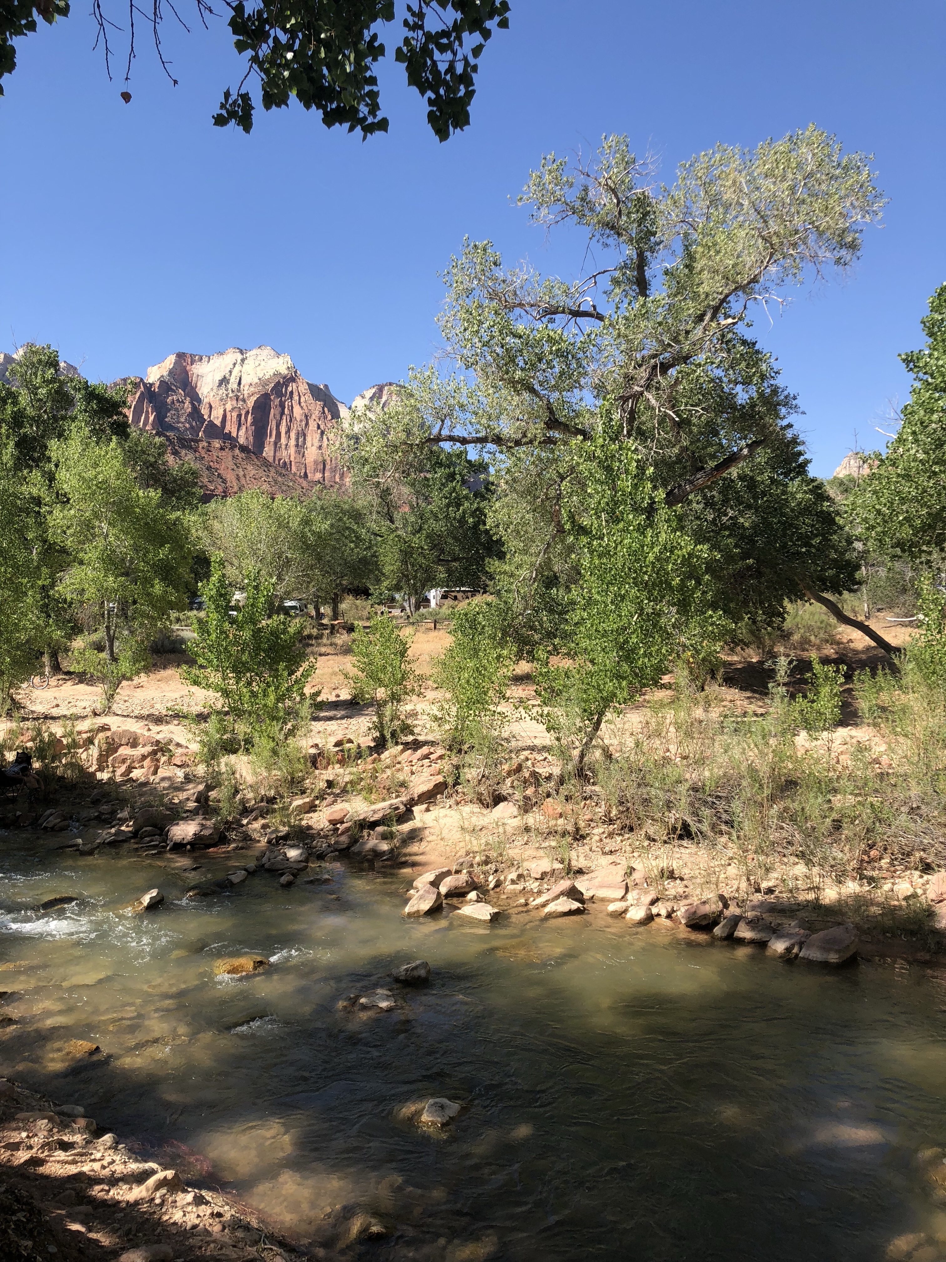 Und wir können vom Platz aus nicht nur im Swimmingpool und abkühlen bei 39 Grad, es gibt auch einen schattigen Platz am Fluss, den wir alle barfuß durchqueren. Dort sitzen schon zwei nette Familien aus Deutschland mit kleine Kindern, jeweils 1 und 3 Jahre alt, die zwei Monate Elternzeit hier im schönen Westen der USA.