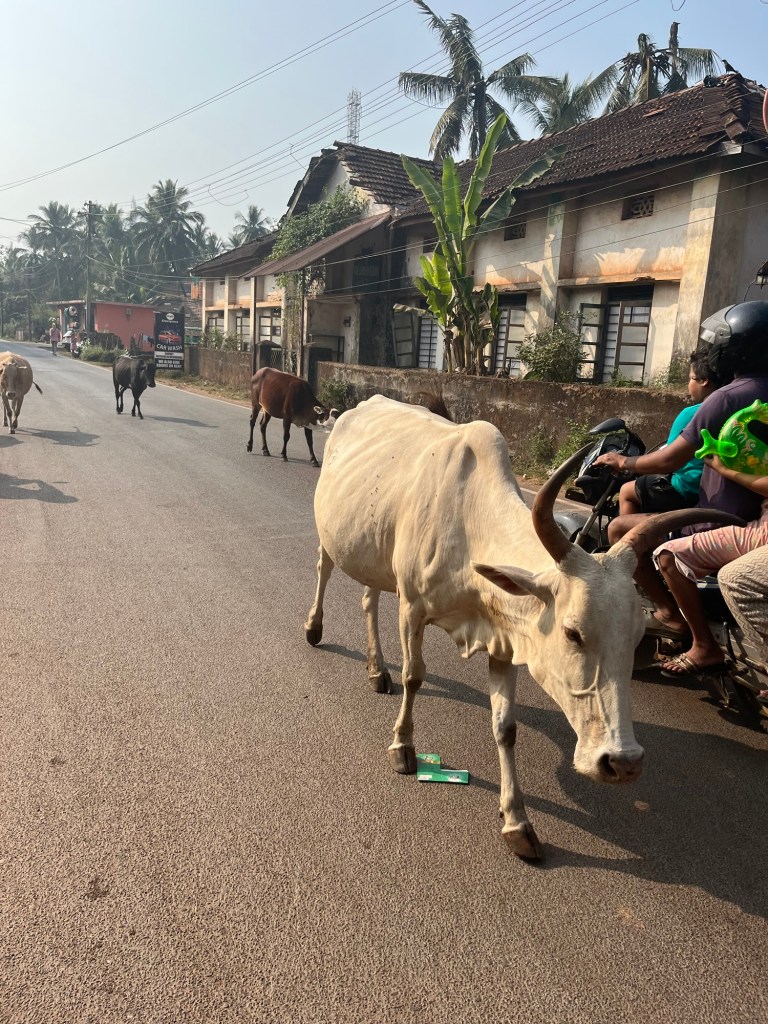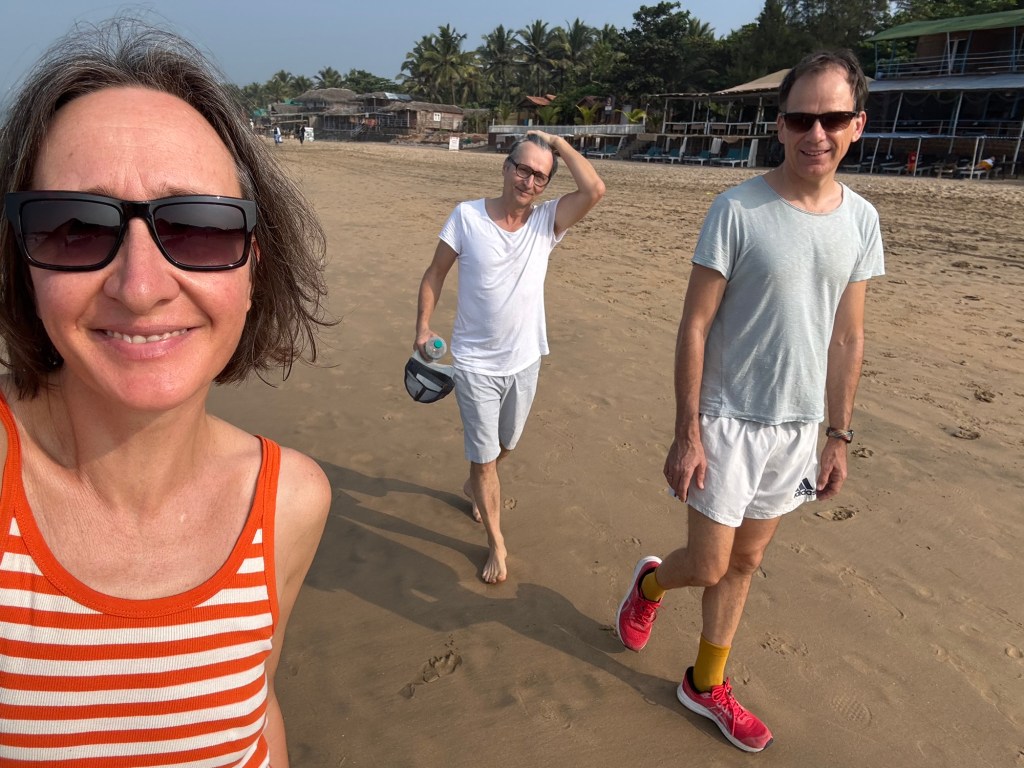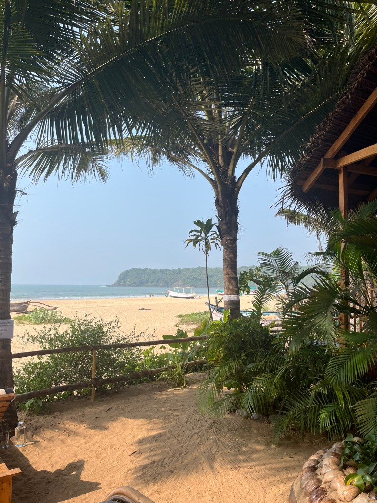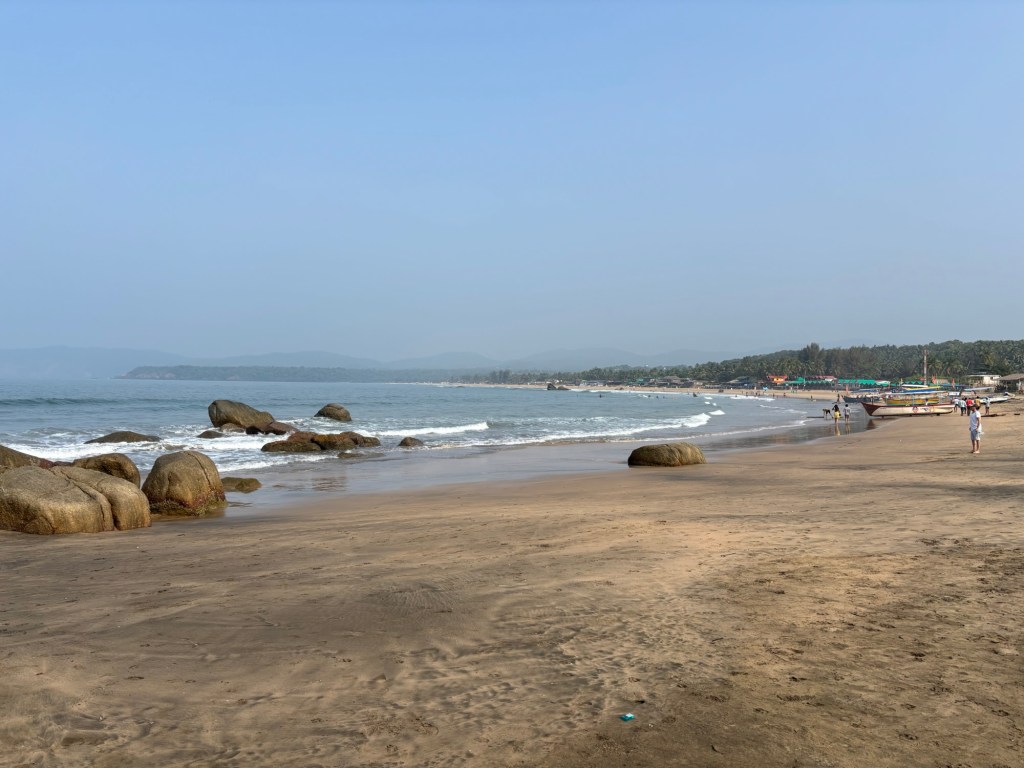 If you’ve forgotten what it’s like to drive around on a scooter in India, then you quickly remember the honking when someone approaches, the cows on the road, the winding roads with surprising potholes and the now astonishing presence of SUVs, which can hardly fit through the small lanes on their own, let alone when two meet. And, of course, the occasional policeman with long wooden sticks who randomly pull out drivers and ask them to pay. On the way south along the beach this morning, I searched in vain for the spot where the Overland Trucks used to stand – those daredevils who came here from Germany in their own vehicles. Perhaps they still exist, but unfortunately they no longer have any free space on the beach, the whole beach is covered with beach shacks and huts, most of which are already double-decker.
