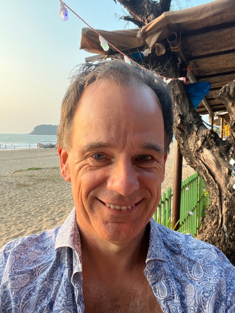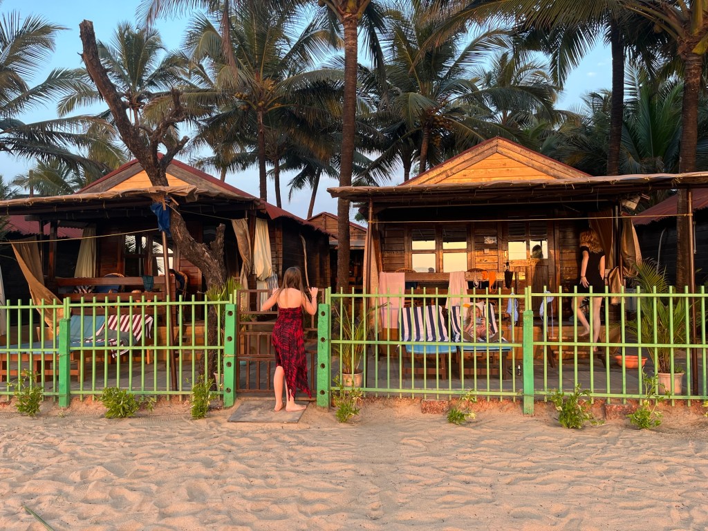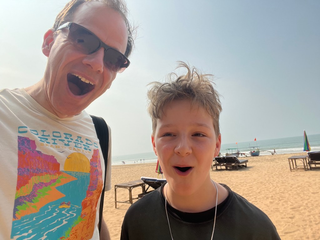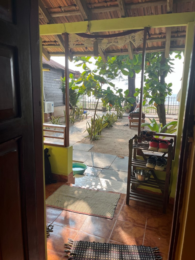 If you’ve forgotten what it’s like to drive around on a scooter in India, then you quickly remember the honking when someone approaches, the cows on the road, the winding roads with surprising potholes and the now astonishing presence of SUVs, which can hardly fit through the small lanes on their own, let alone when two meet. And, of course, the occasional policeman with long wooden sticks who randomly pull out drivers and ask them to pay. On the way south along the beach this morning, I searched in vain for the spot where the Overland Trucks used to stand – those daredevils who came here from Germany in their own vehicles. Perhaps they still exist, but unfortunately they no longer have any free space on the beach, the whole beach is covered with beach shacks and huts, most of which are already double-decker.